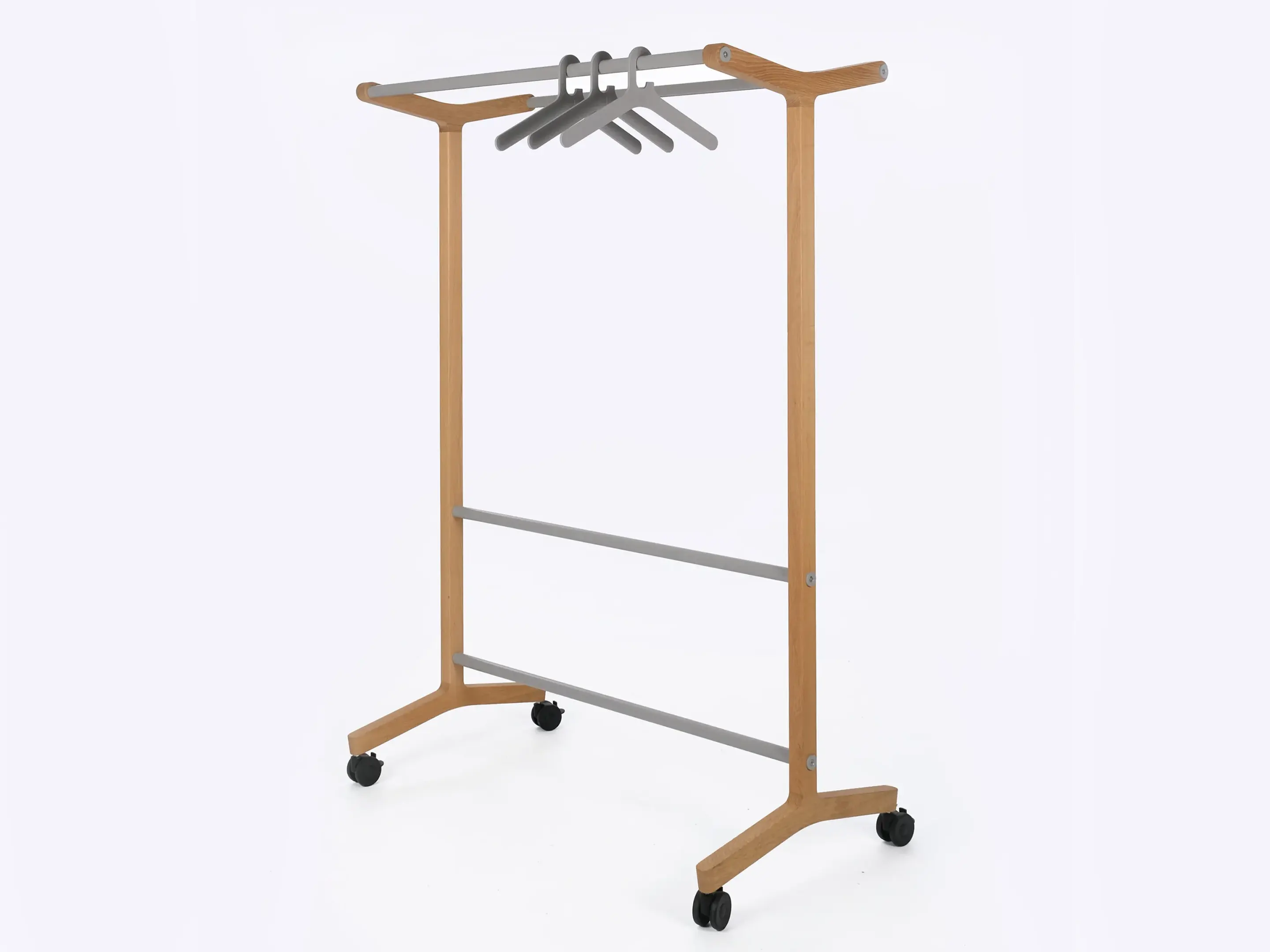 Verrijdbare garderoberek met eiken frame met twee garderobestangen. Afmeting: 1230 x 700 x 1800mm (BxDxH)