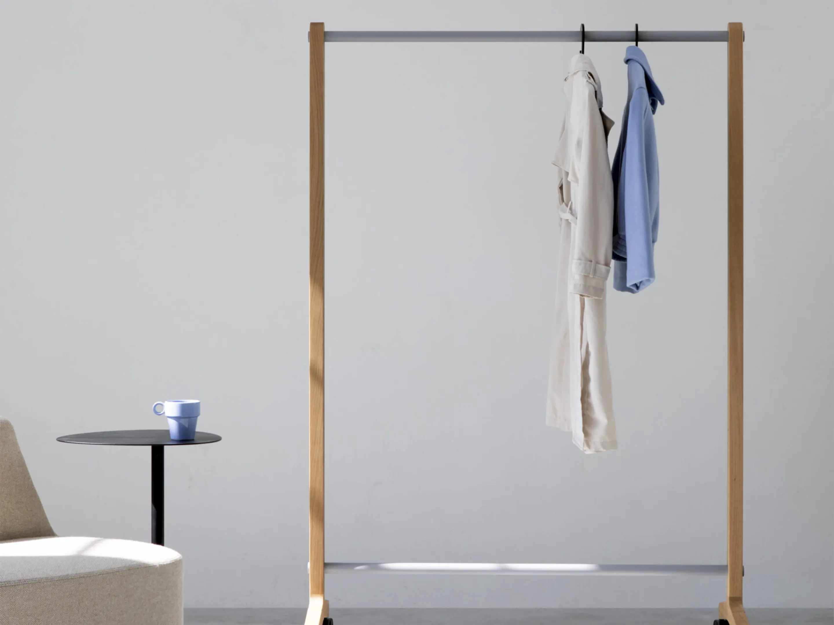 Verrijdbare garderoberek met eiken frame met één garderobestang. Afmeting: 430 x 500 x 1800mm (BxDxH)