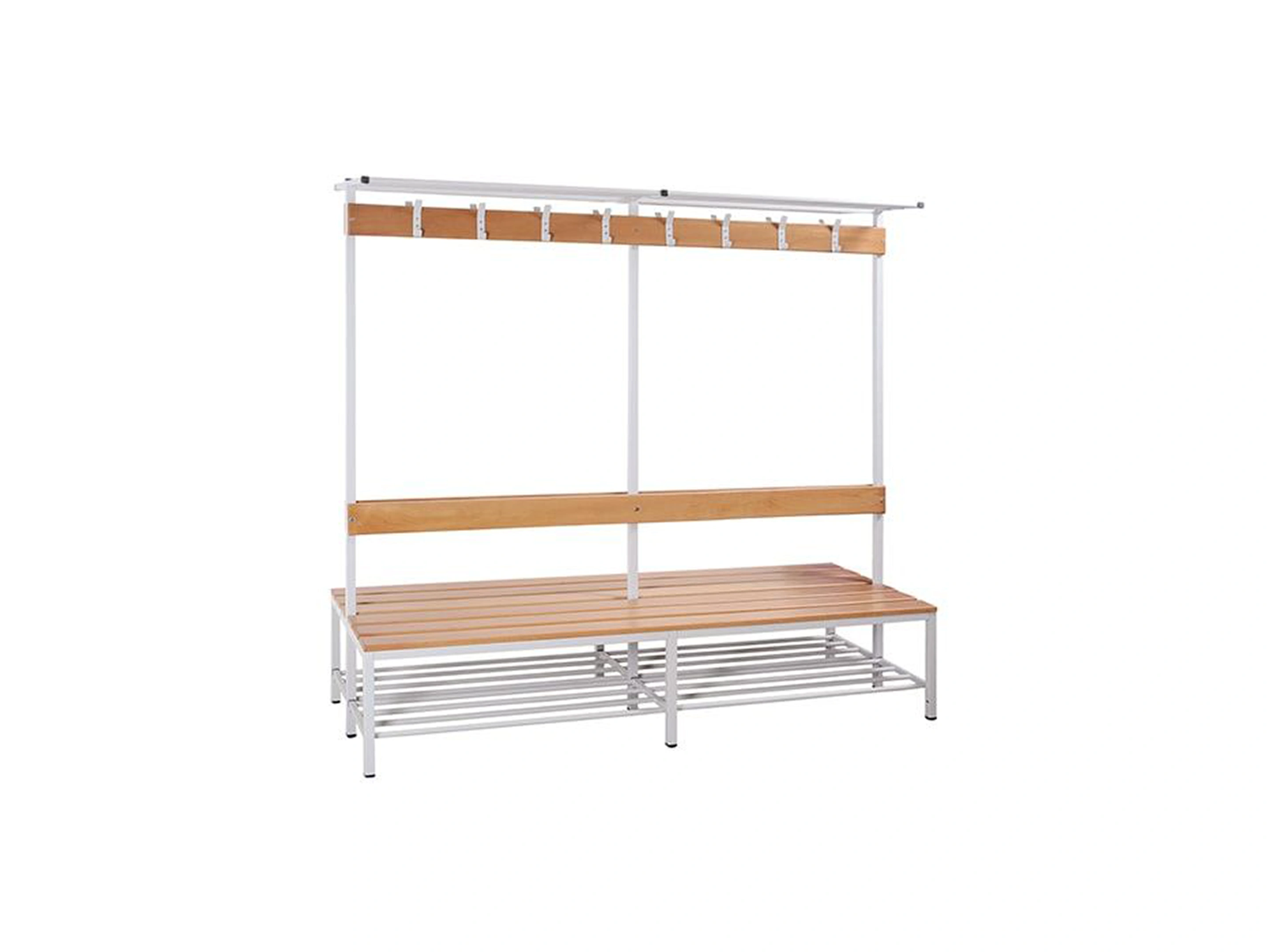 Stevige dubbele garderobebank met beuken gelakte houten latten, standaard met kledinghaken, hoeden en schoenenplank