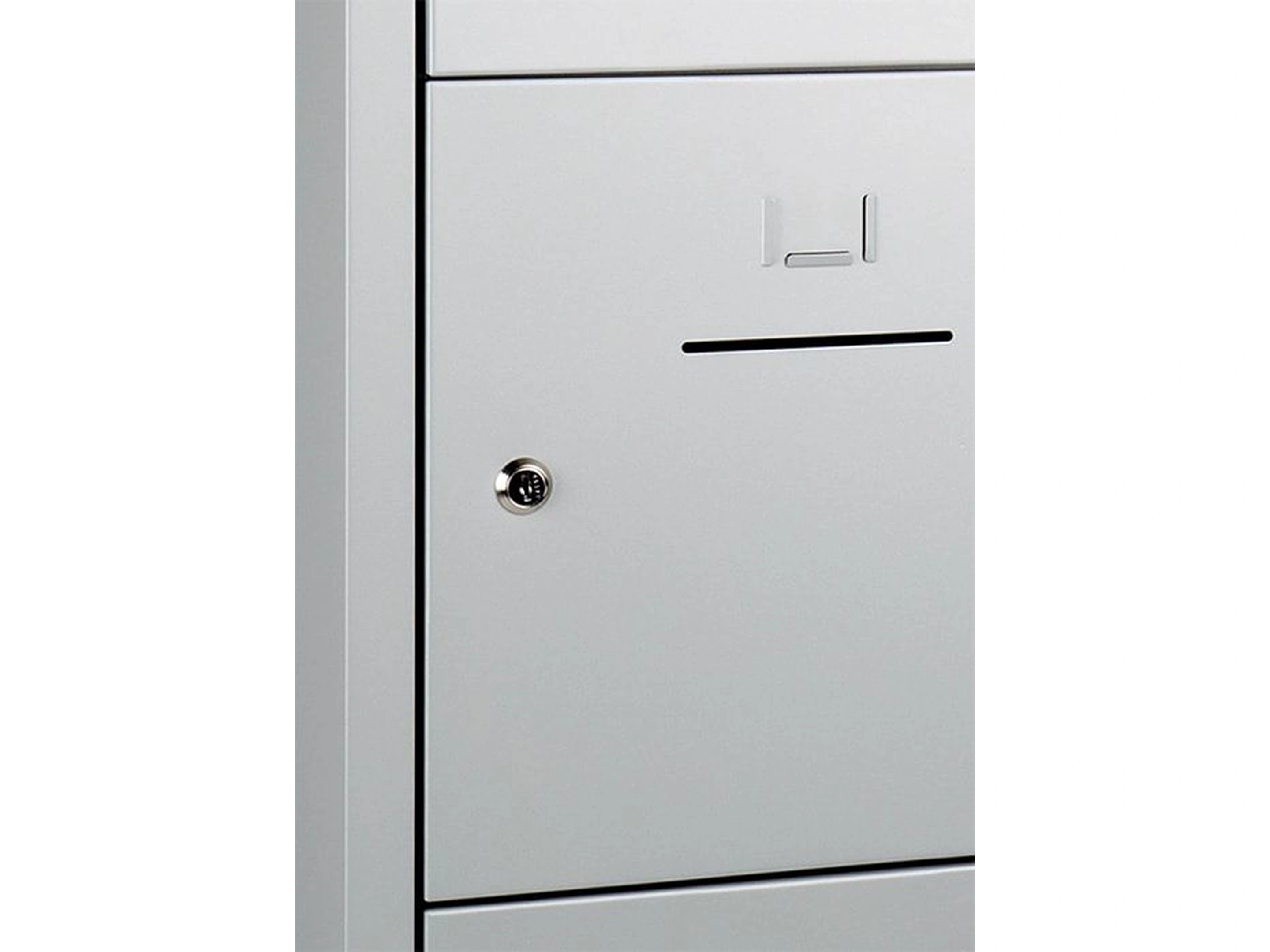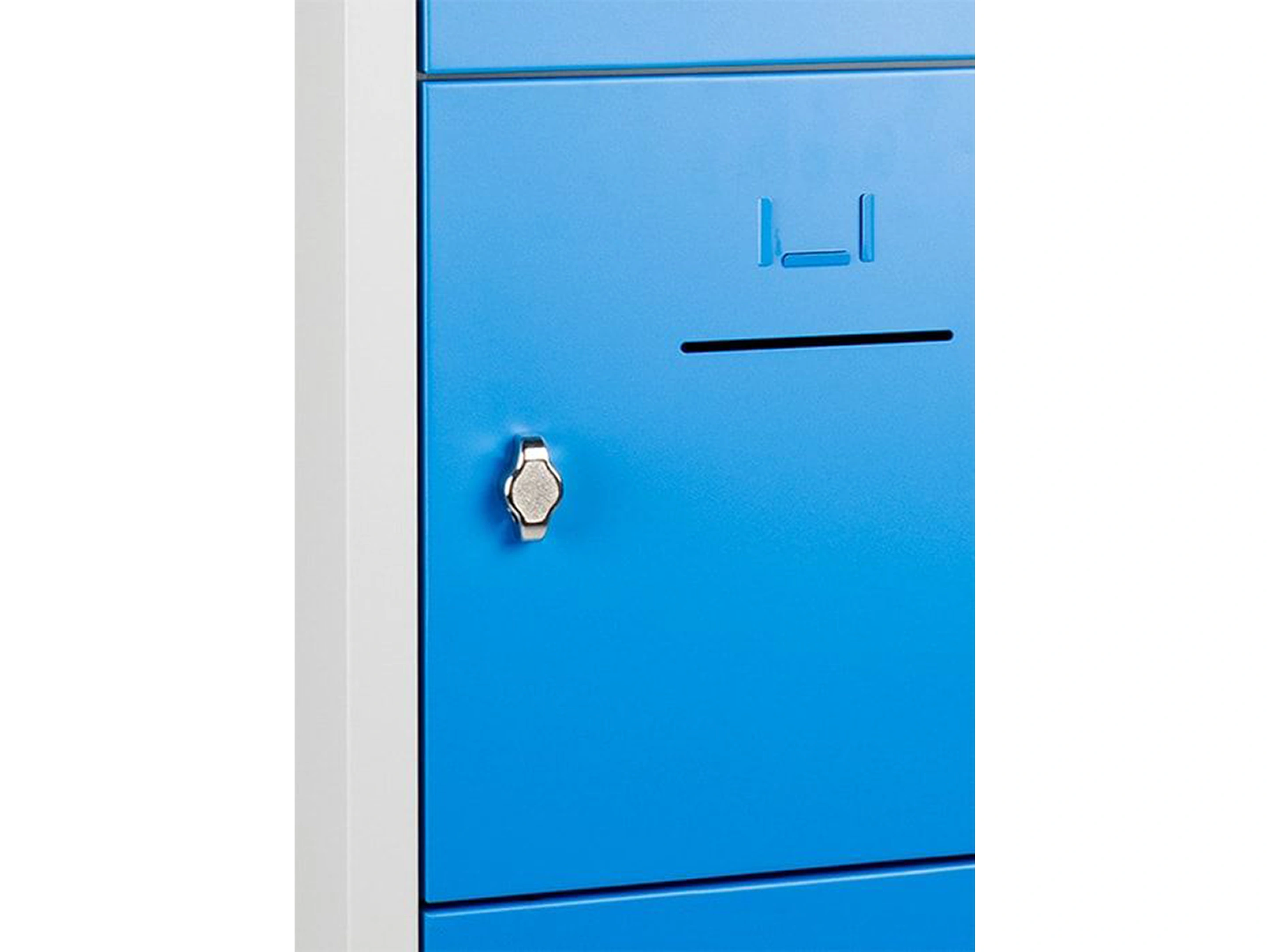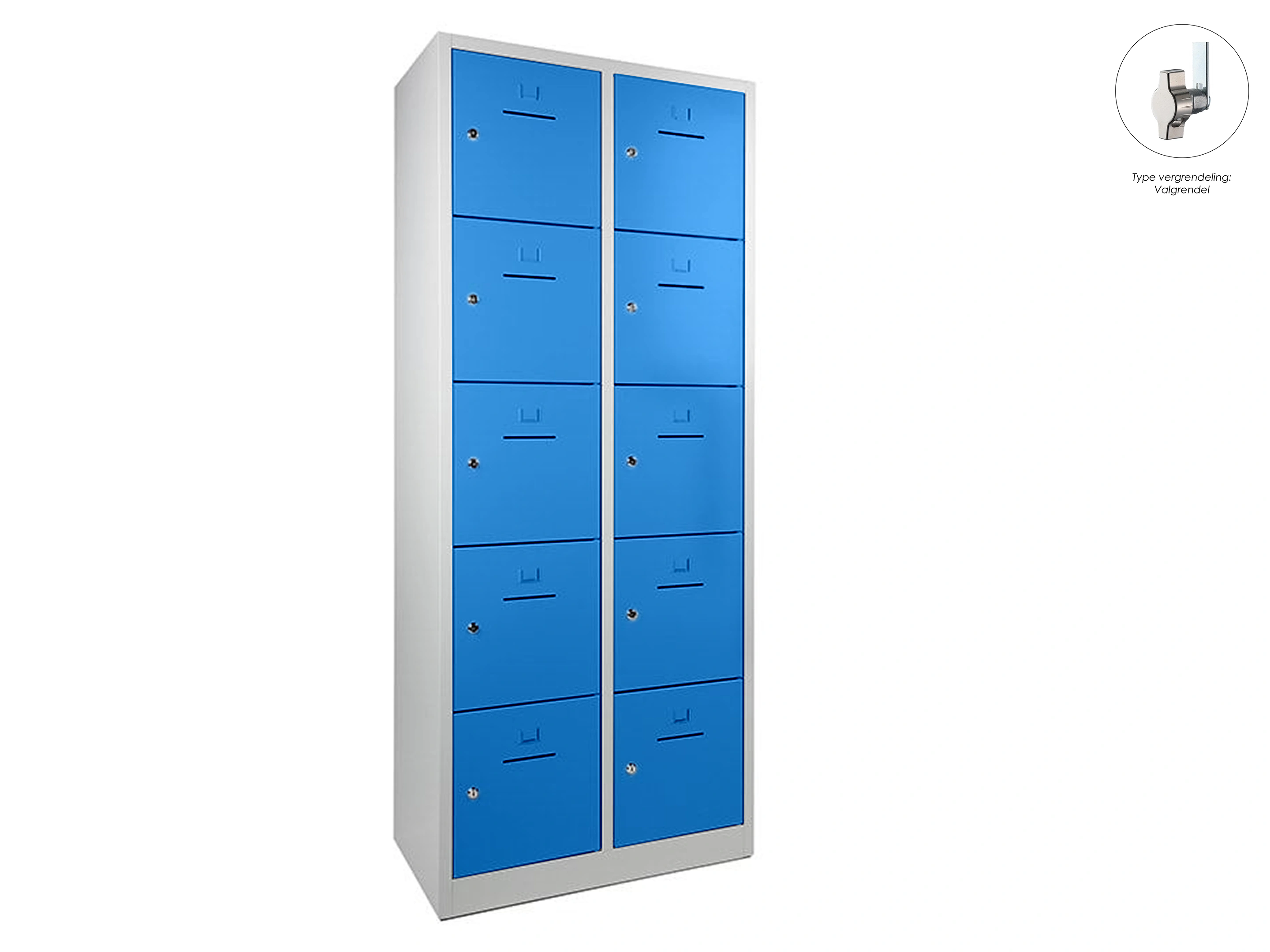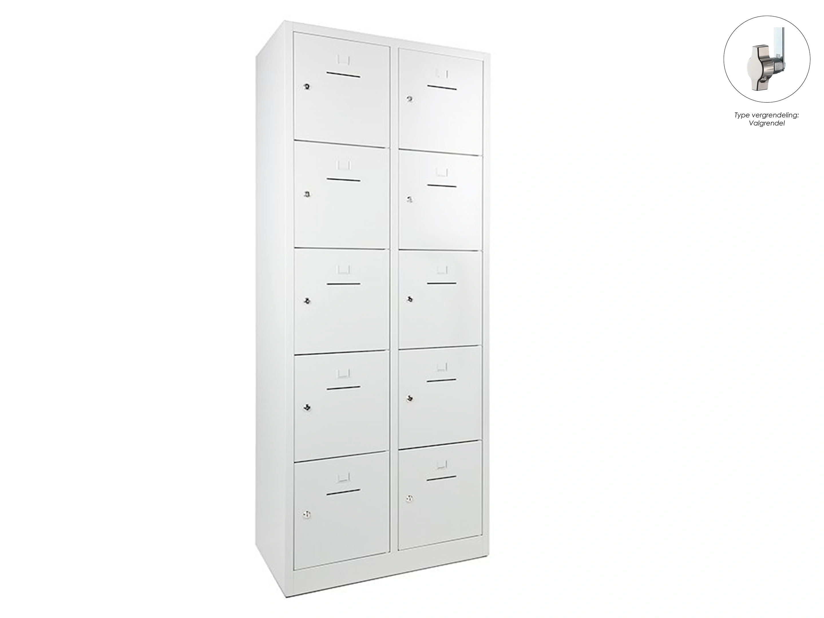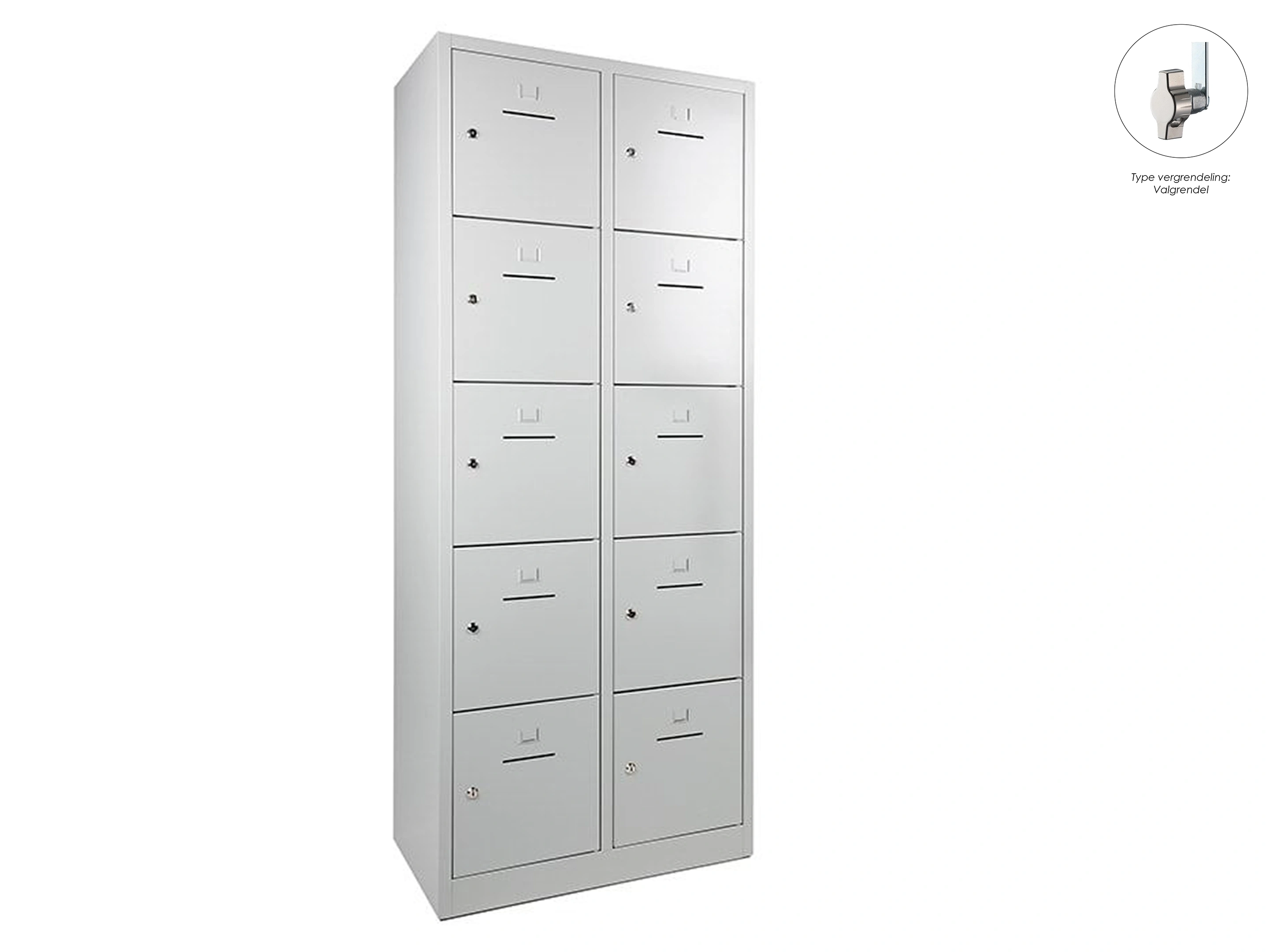 Lockerkast met 2 kolommen en 10 deuren, afsluitbaar met een valvergrendeling, binnenmaat locker links: 35,5x38x42cm (hxbxd), rechts: 35,5x40x42cm, deuropening: 32x31,5cm (hxb)