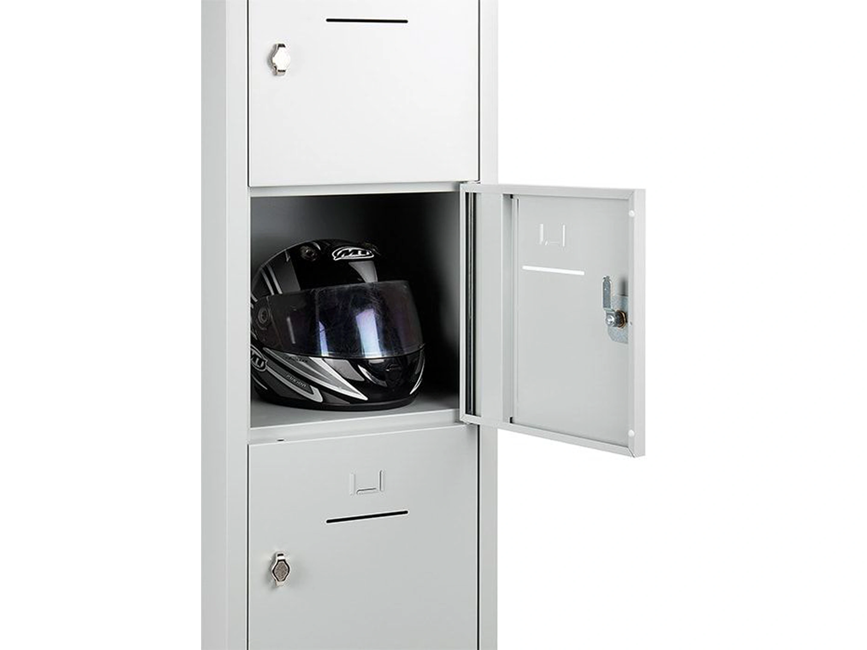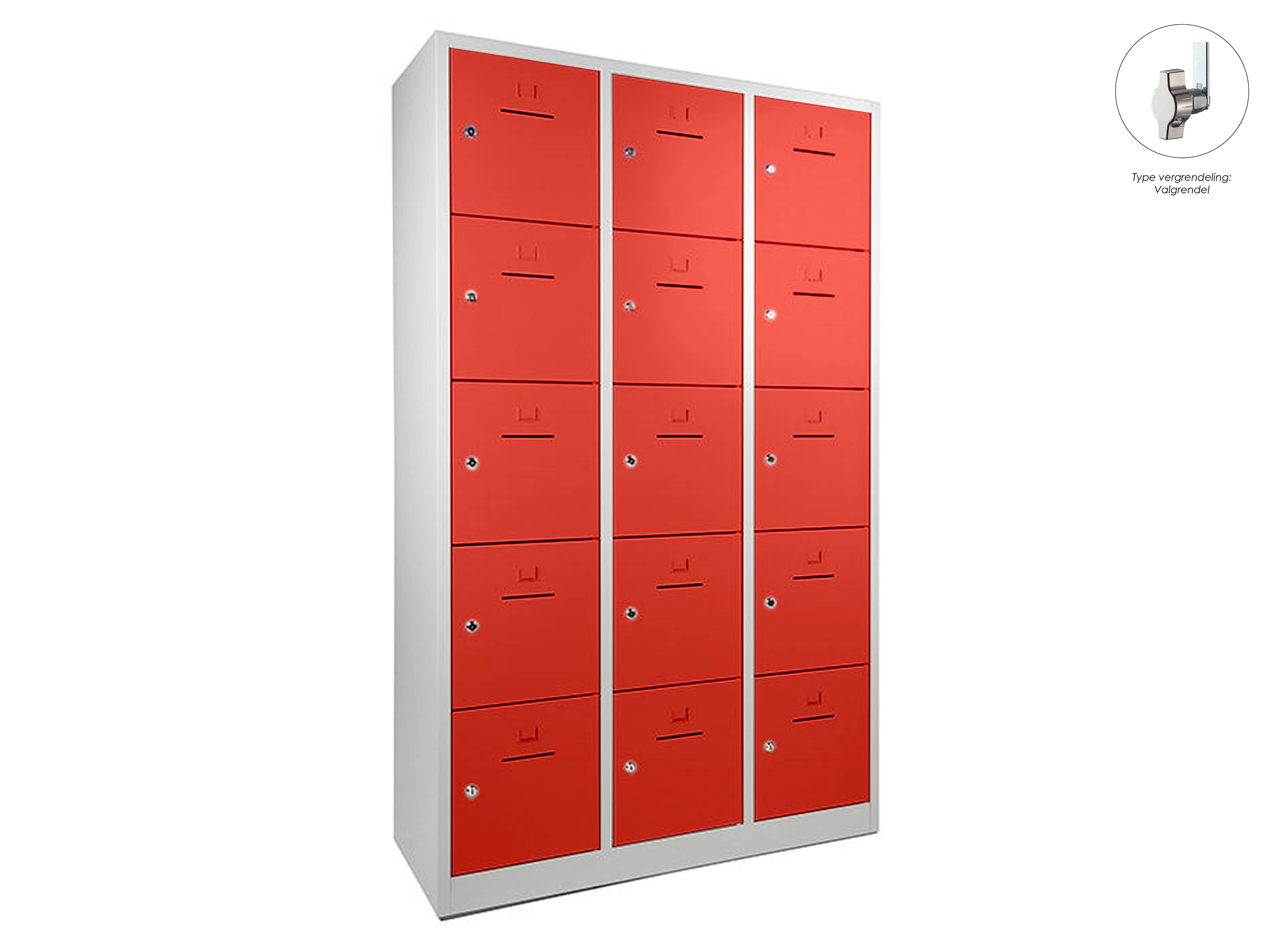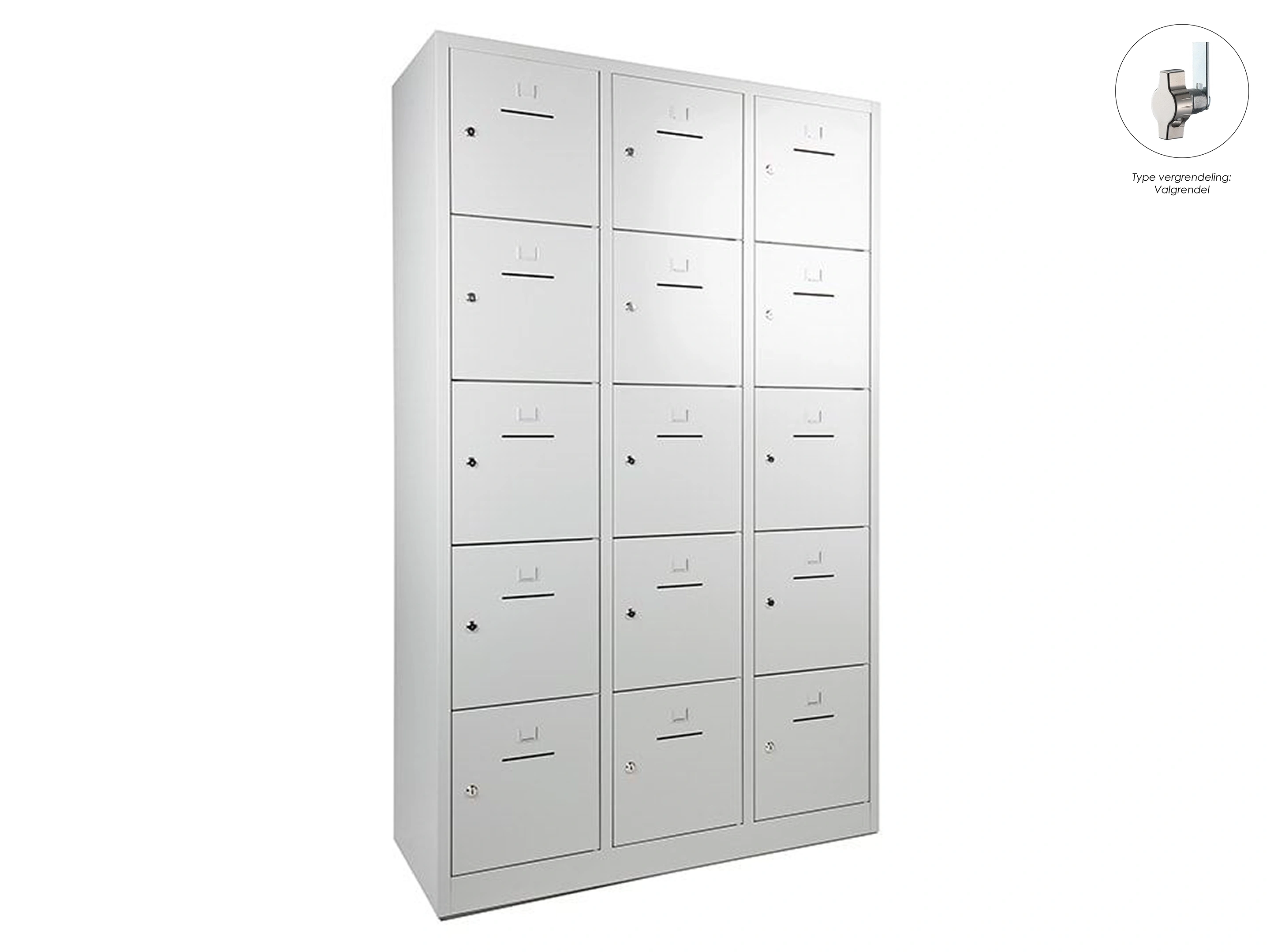Lockerkast met 3 kolommen en 15 deuren, afsluitbaar met een valvergrendeling, binnenmaat locker links: 35,5x38x42cm (hxbxd), midden en rechts: 35,5x40x42cm, deuropening: 32x31,5cm (hxb)