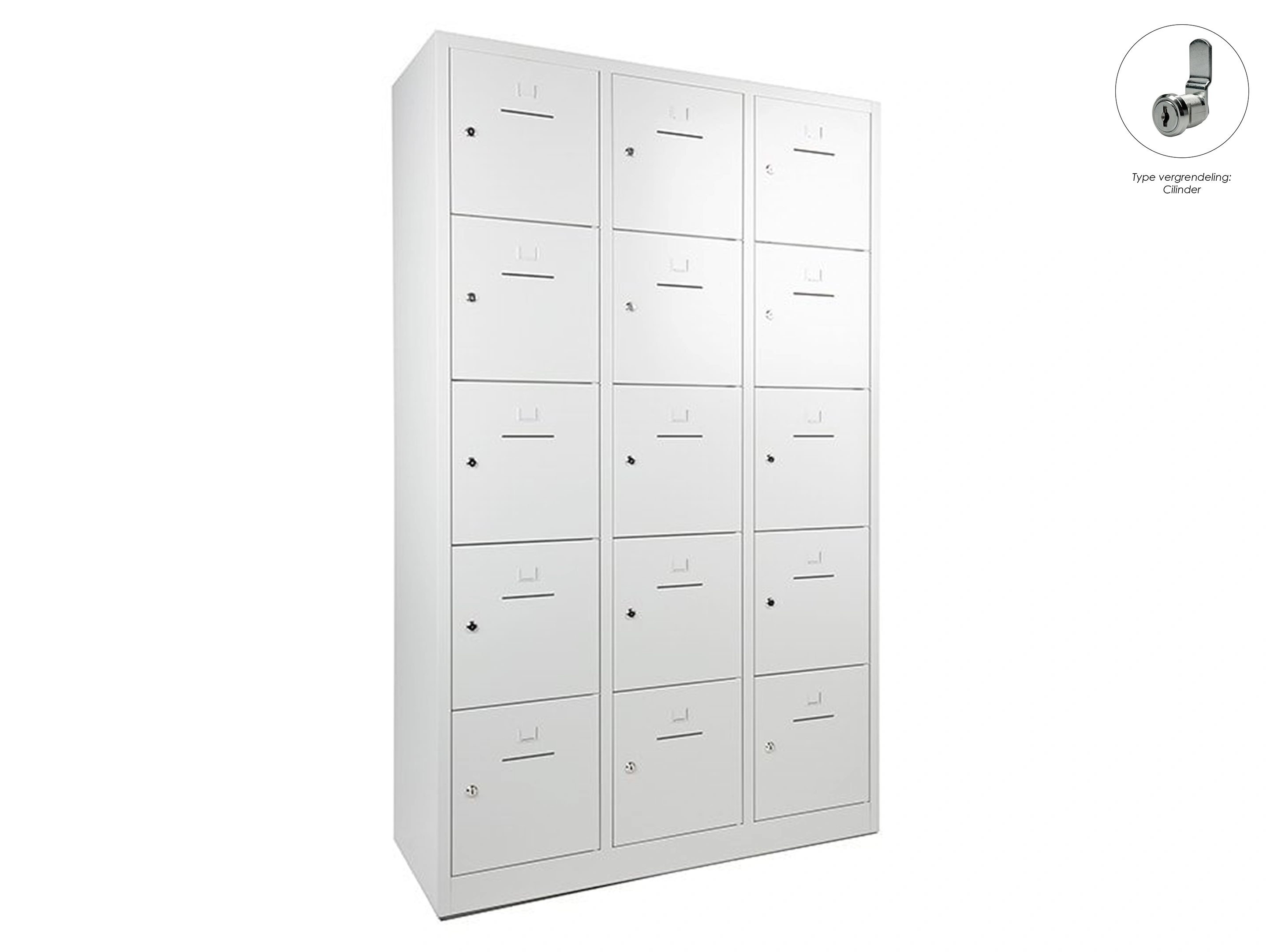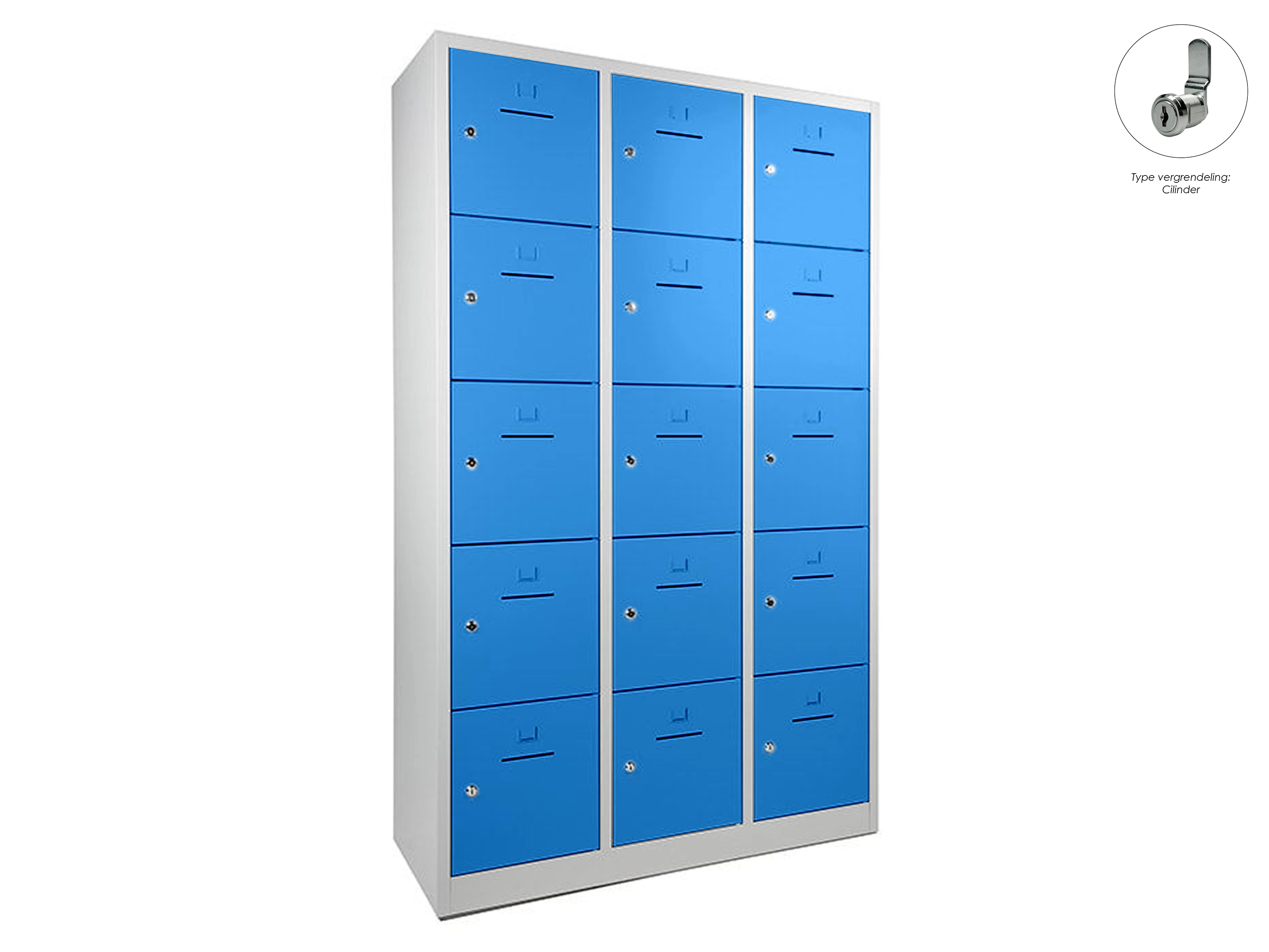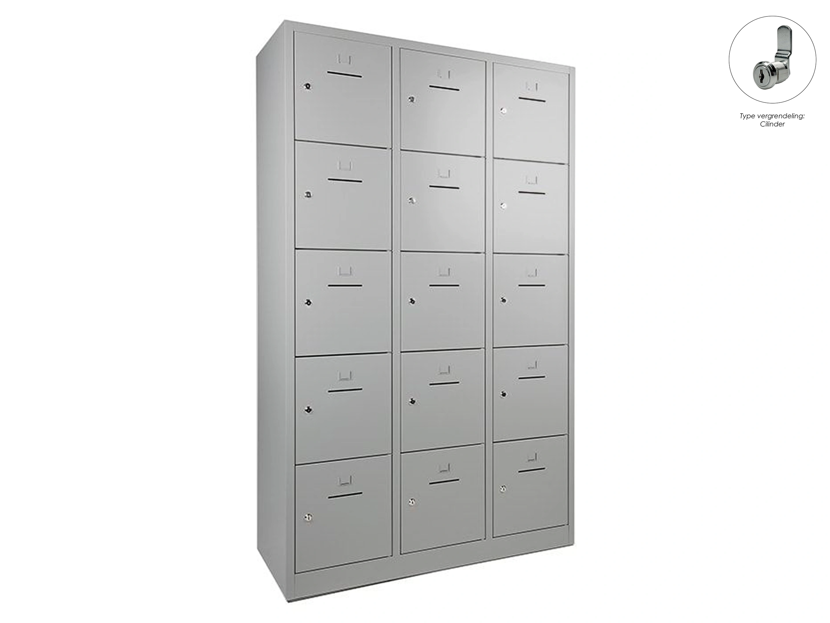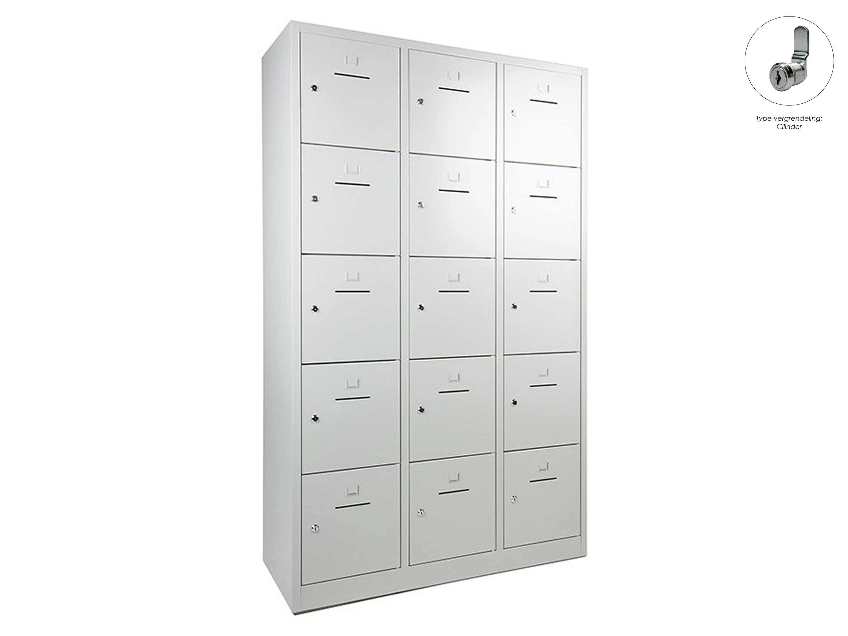 Lockerkast met 3 kolommen en 15 deuren, afsluitbaar met een cilindersluiting, incl sleutels, binnenmaat locker links: 35,5x38x42cm (hxbxd), midden en rechts: 35,5x40x42cm, deuropening: 32x31,5cm (hxb)