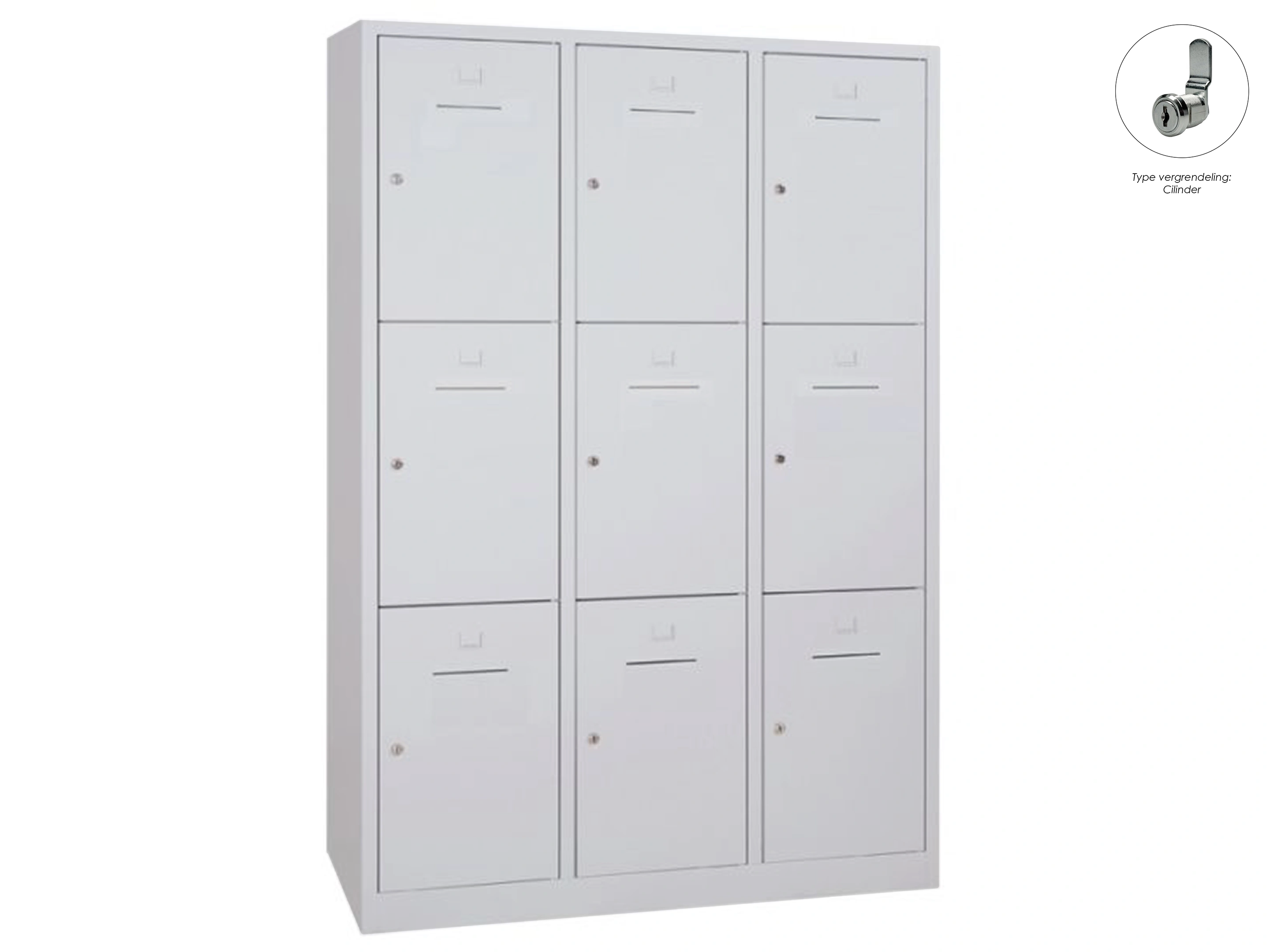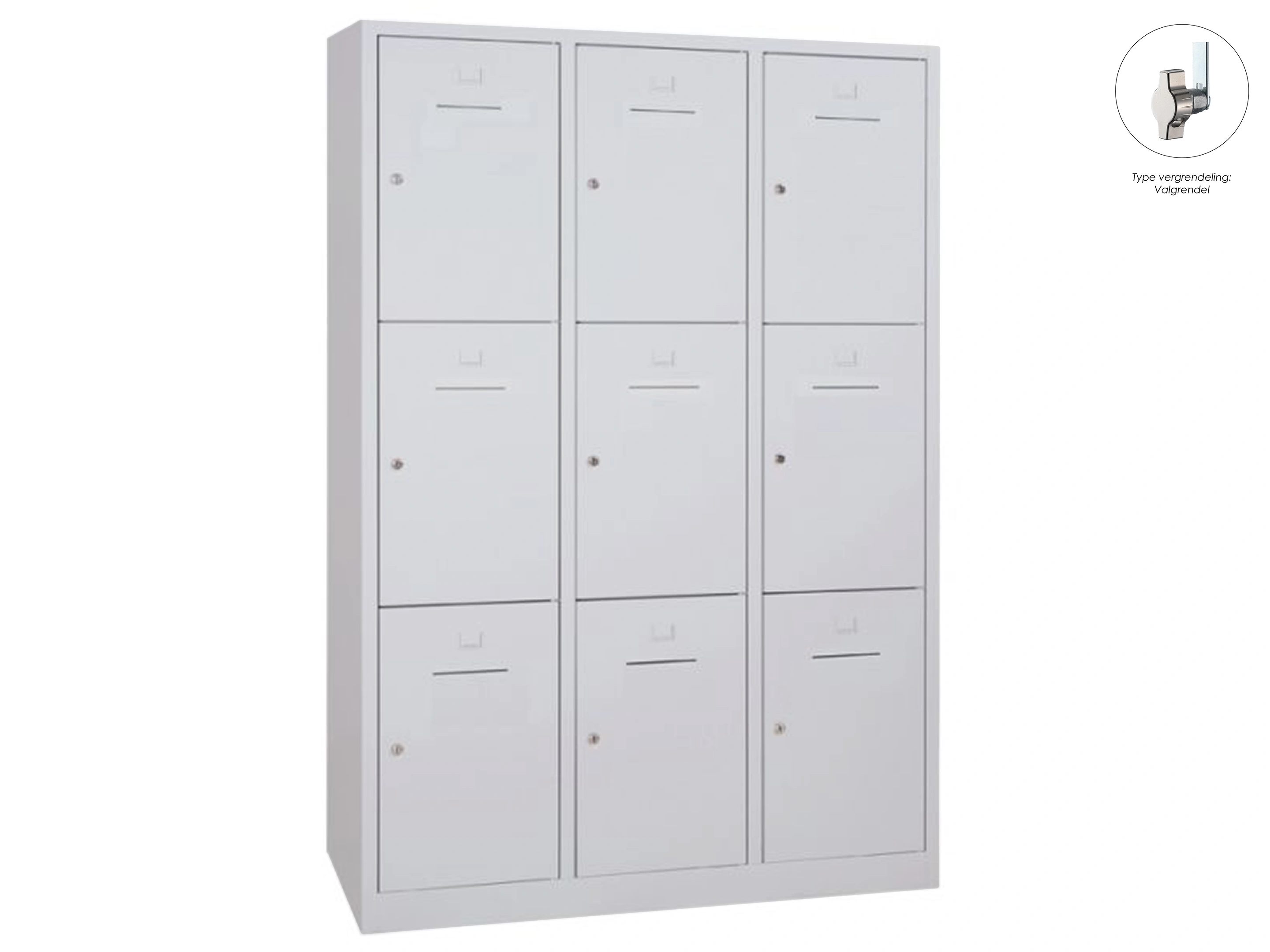 Lockerkast met 3 kolommen en 9 deuren, afsluitbaar met valvergrendeling, binnenmaat per locker: 35,5x32x42,5.