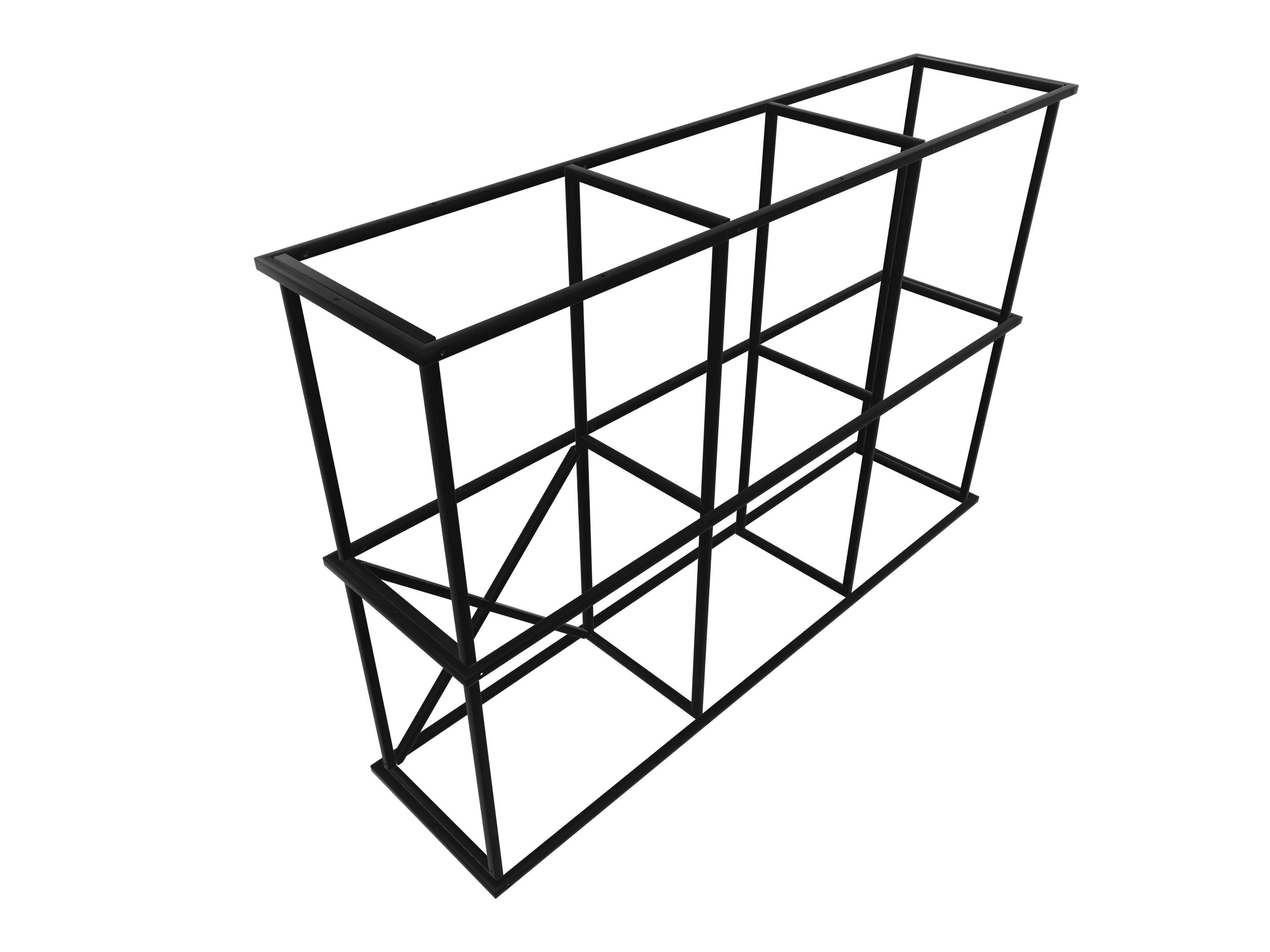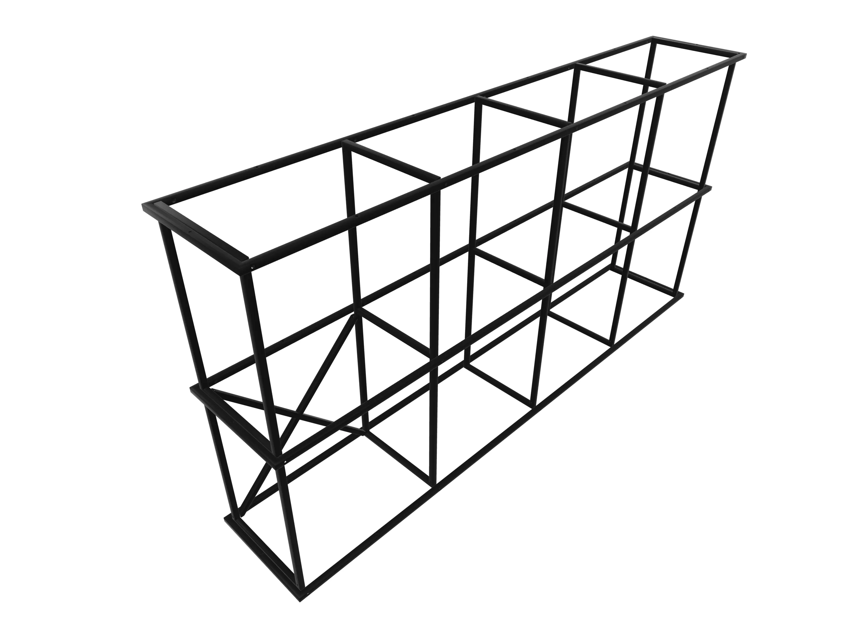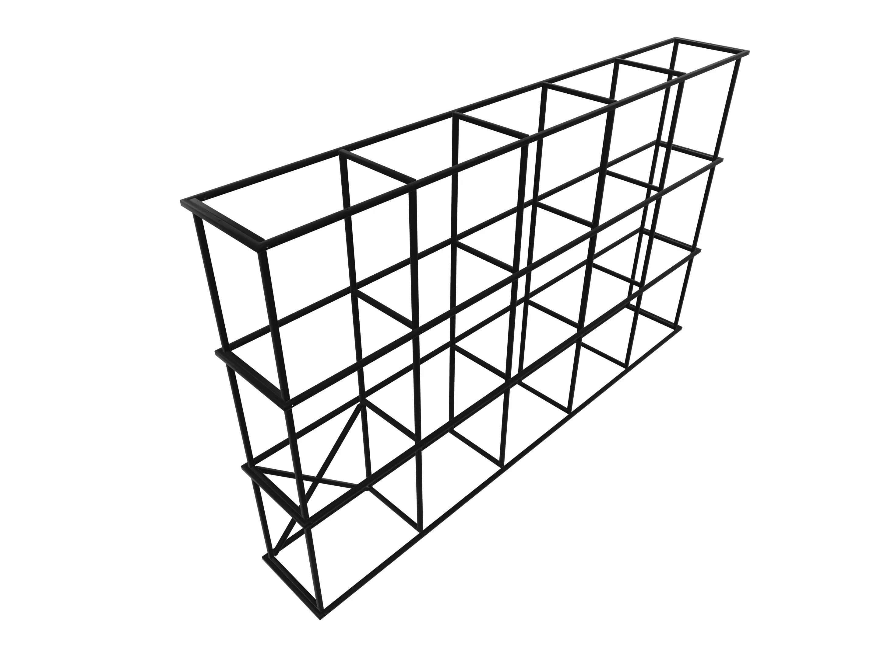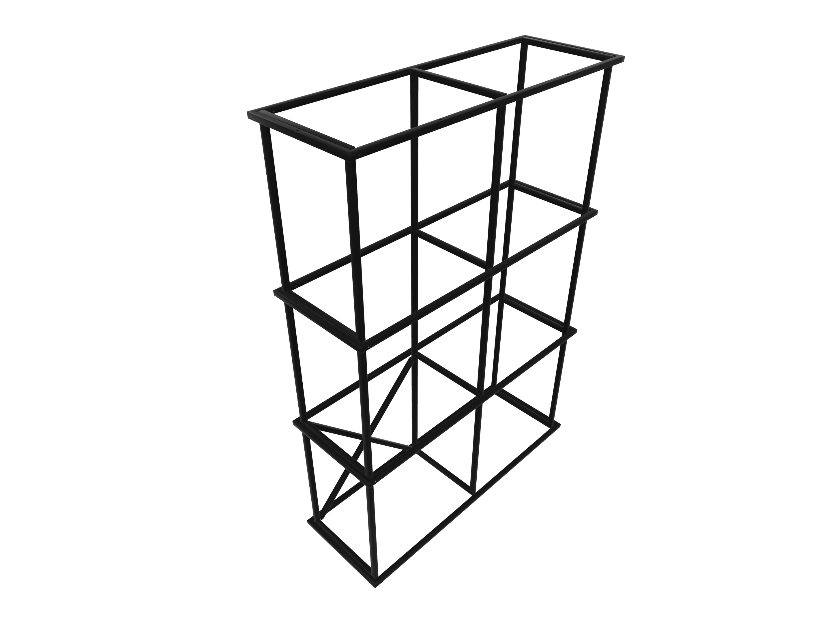 Hangend vakkenkast systeem uit stalen kokerprofielen, voorzien van één schoorkruis. Inhoud moet los besteld worden. Afmeting: 919 x 901 x 320mm (BxHxD). Let op! Frame wordt af fabriek compleet geleverd!