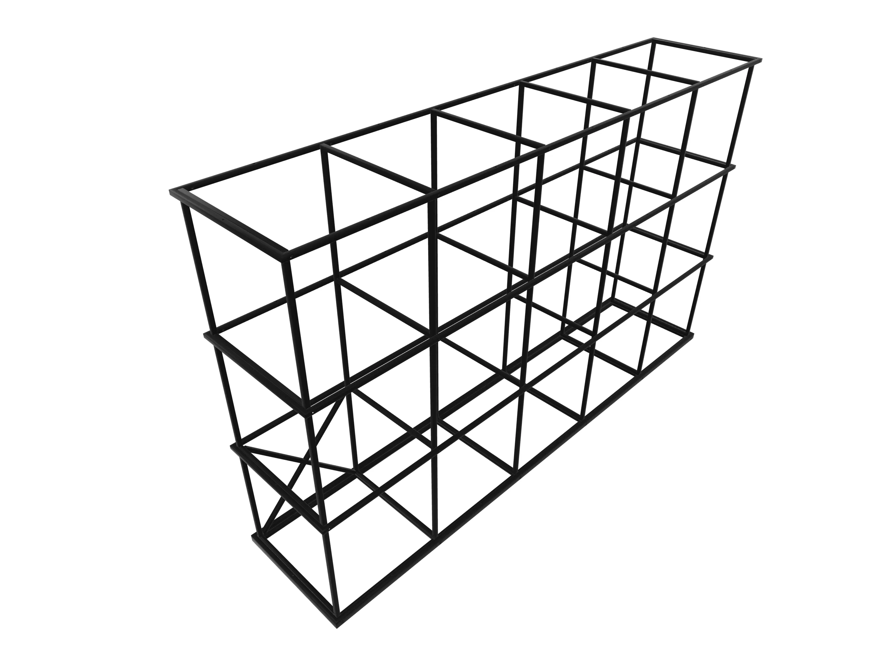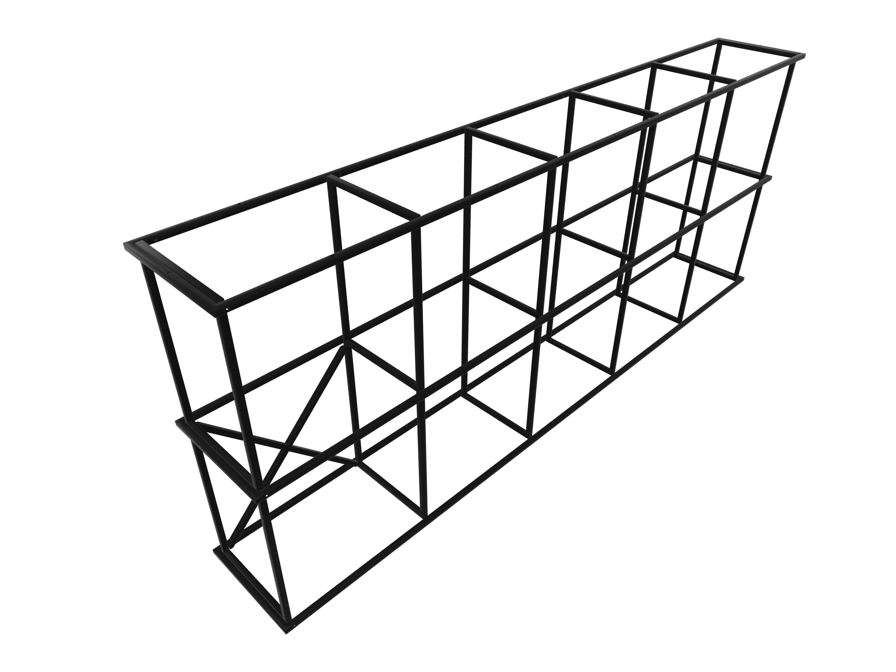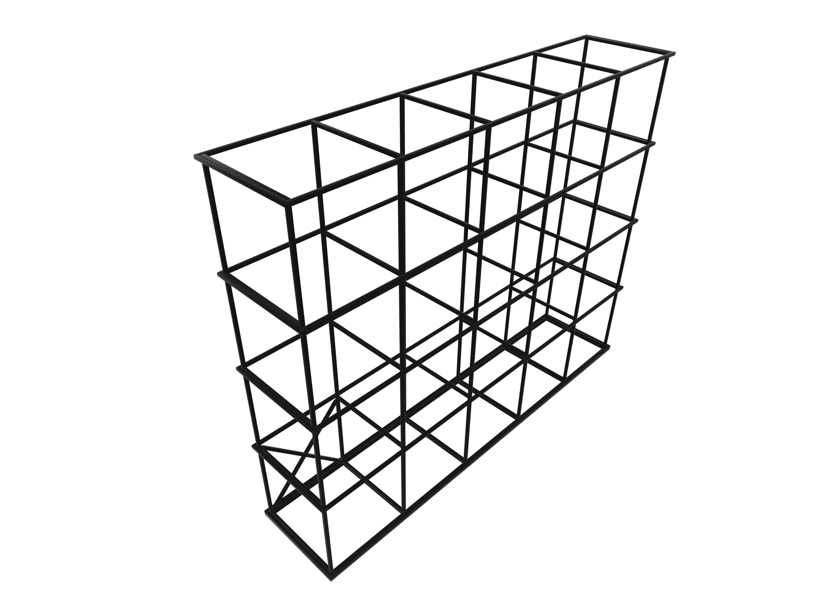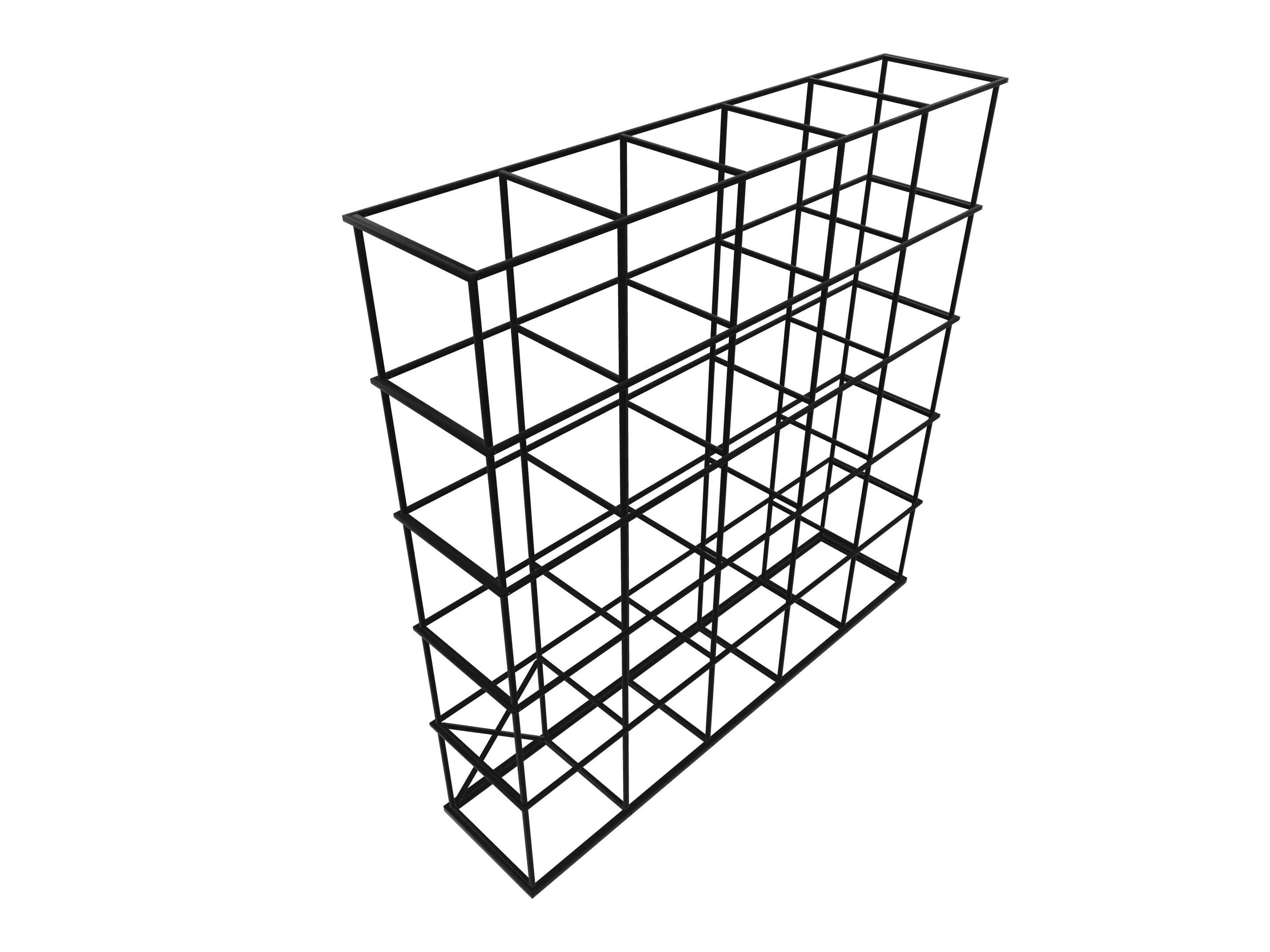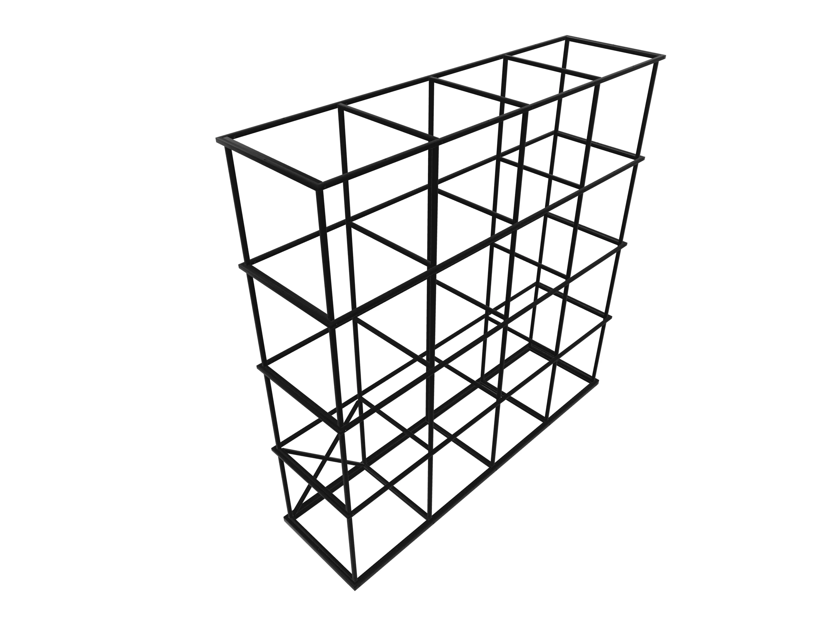 Hangend vakkenkast systeem uit stalen kokerprofielen, voorzien van één schoorkruis. Inhoud moet los besteld worden. Afmeting: 919 x 901 x 320mm (BxHxD). Let op! Frame wordt af fabriek compleet geleverd!