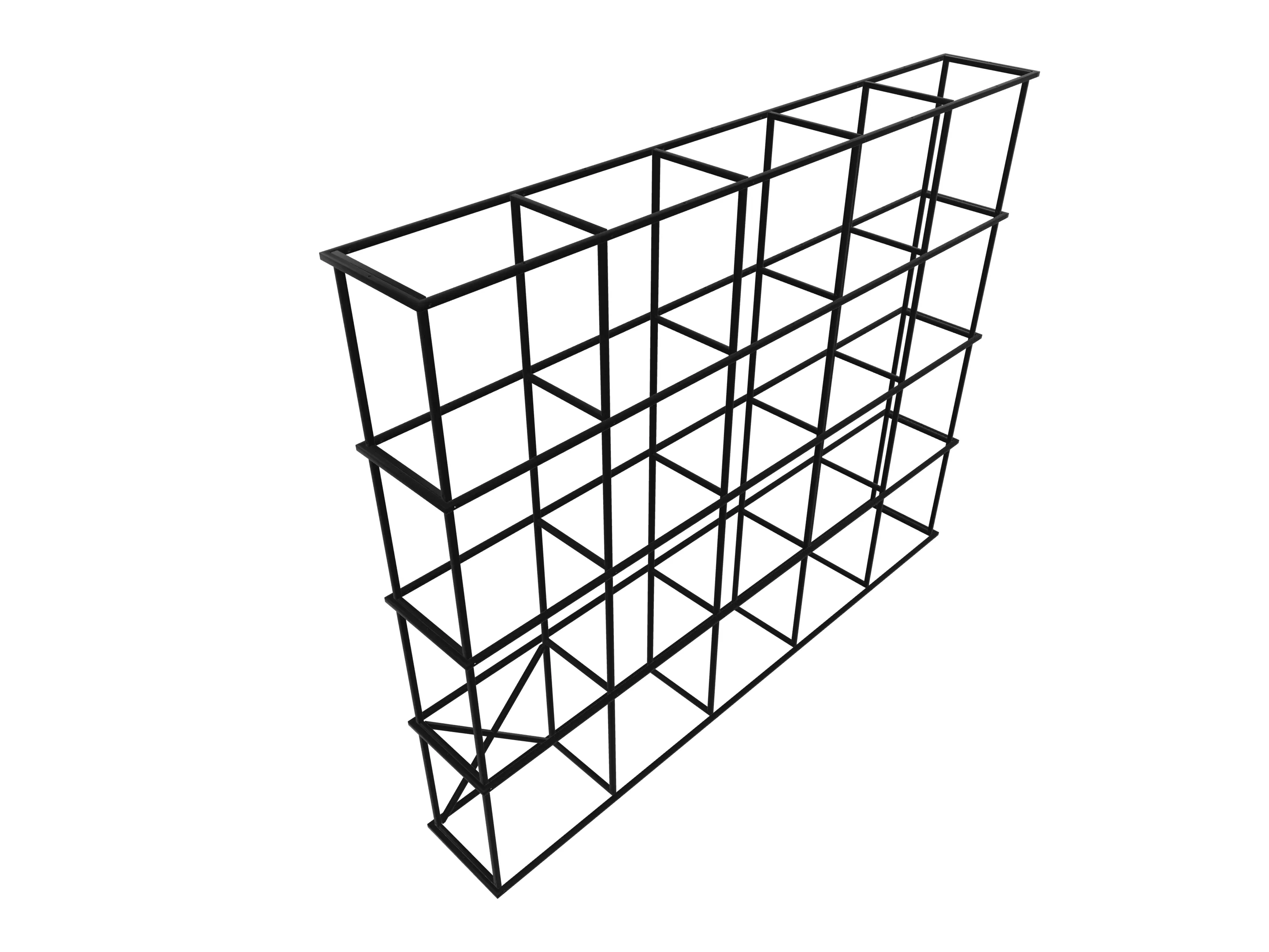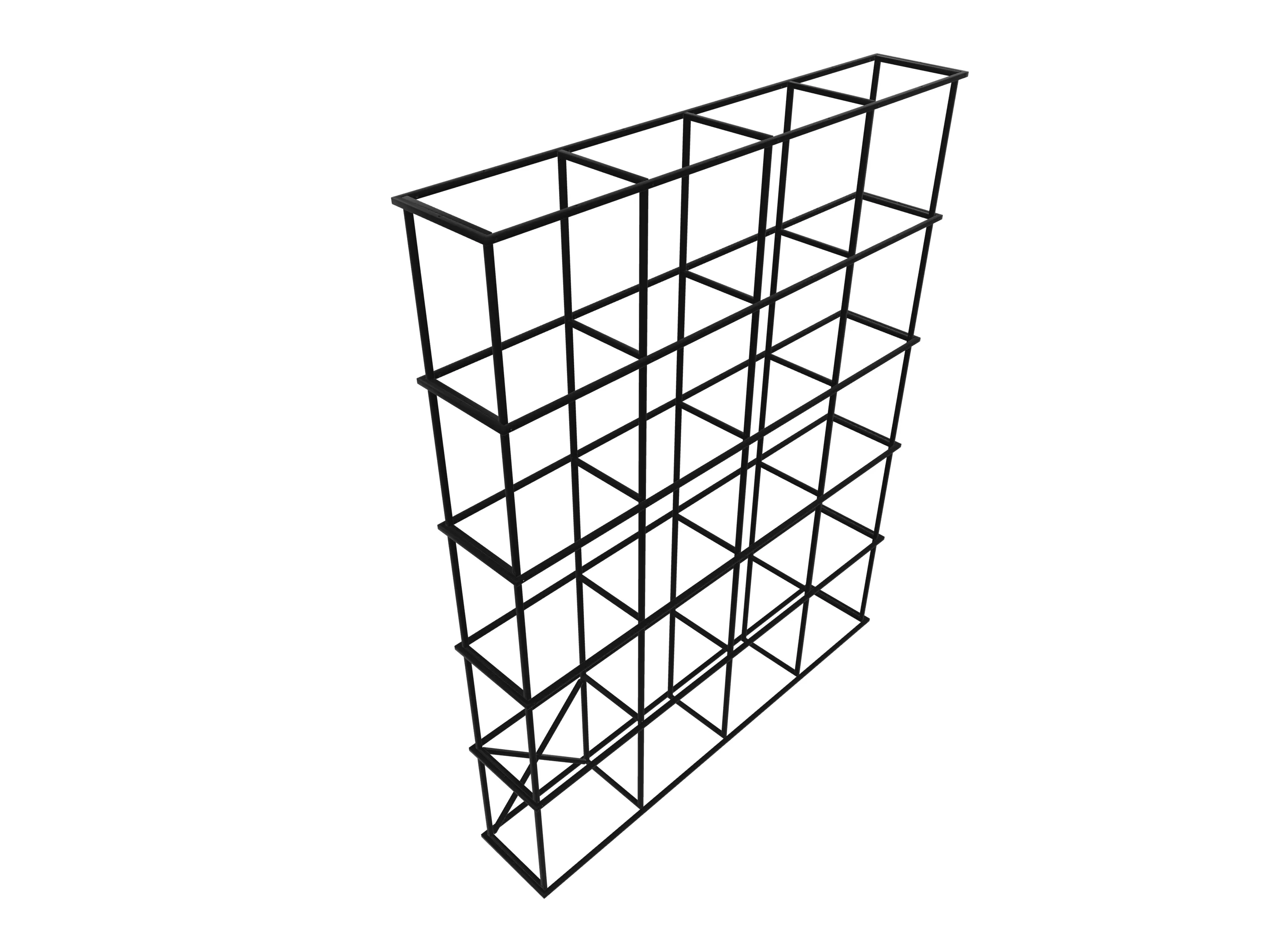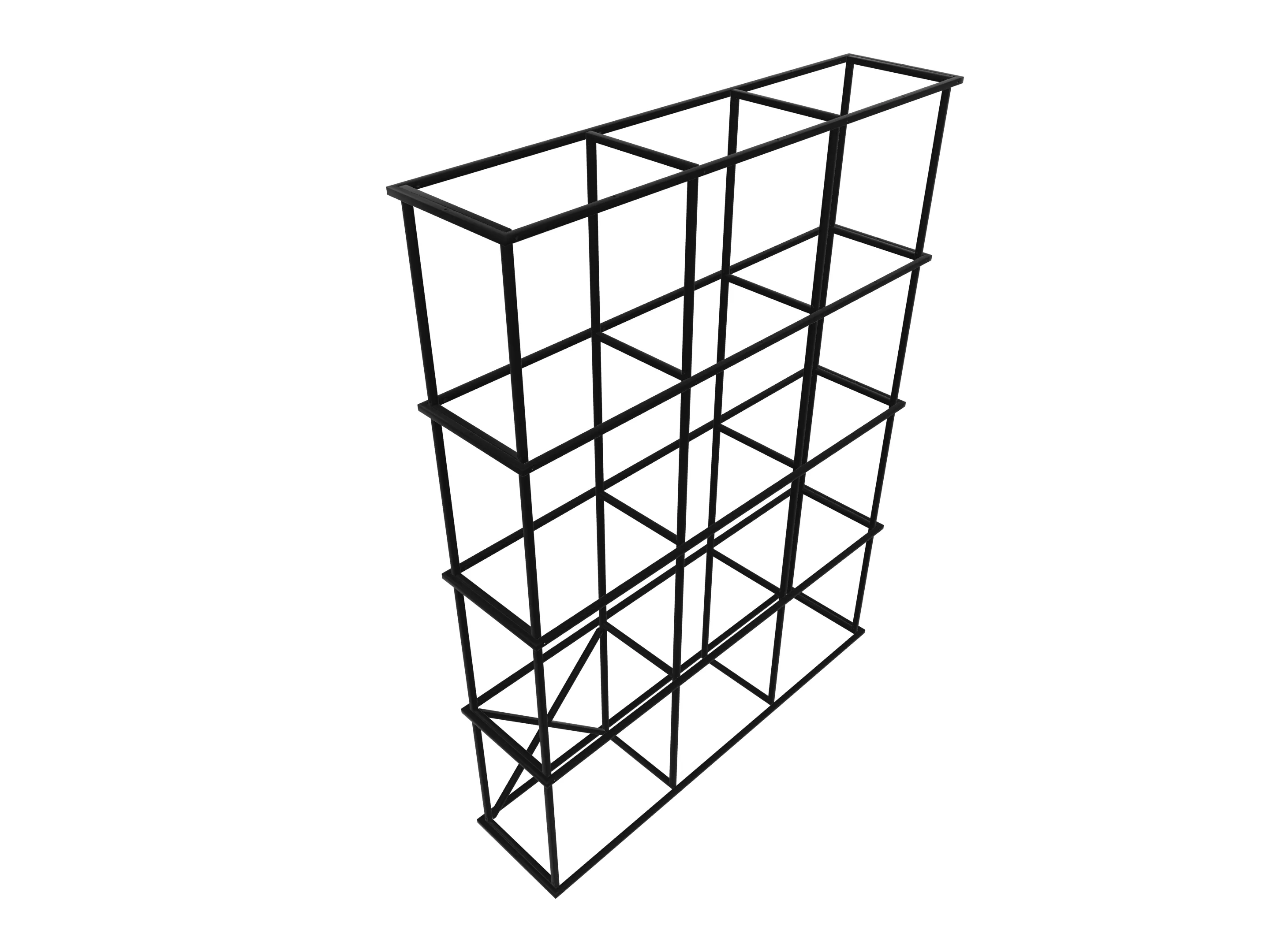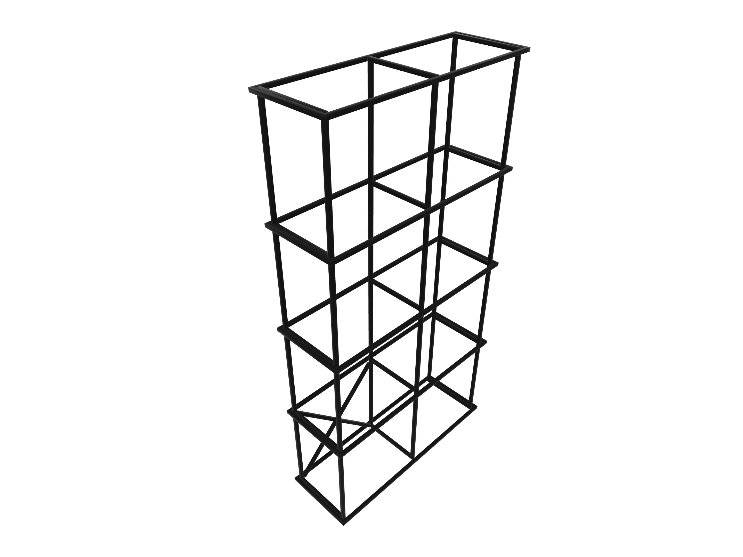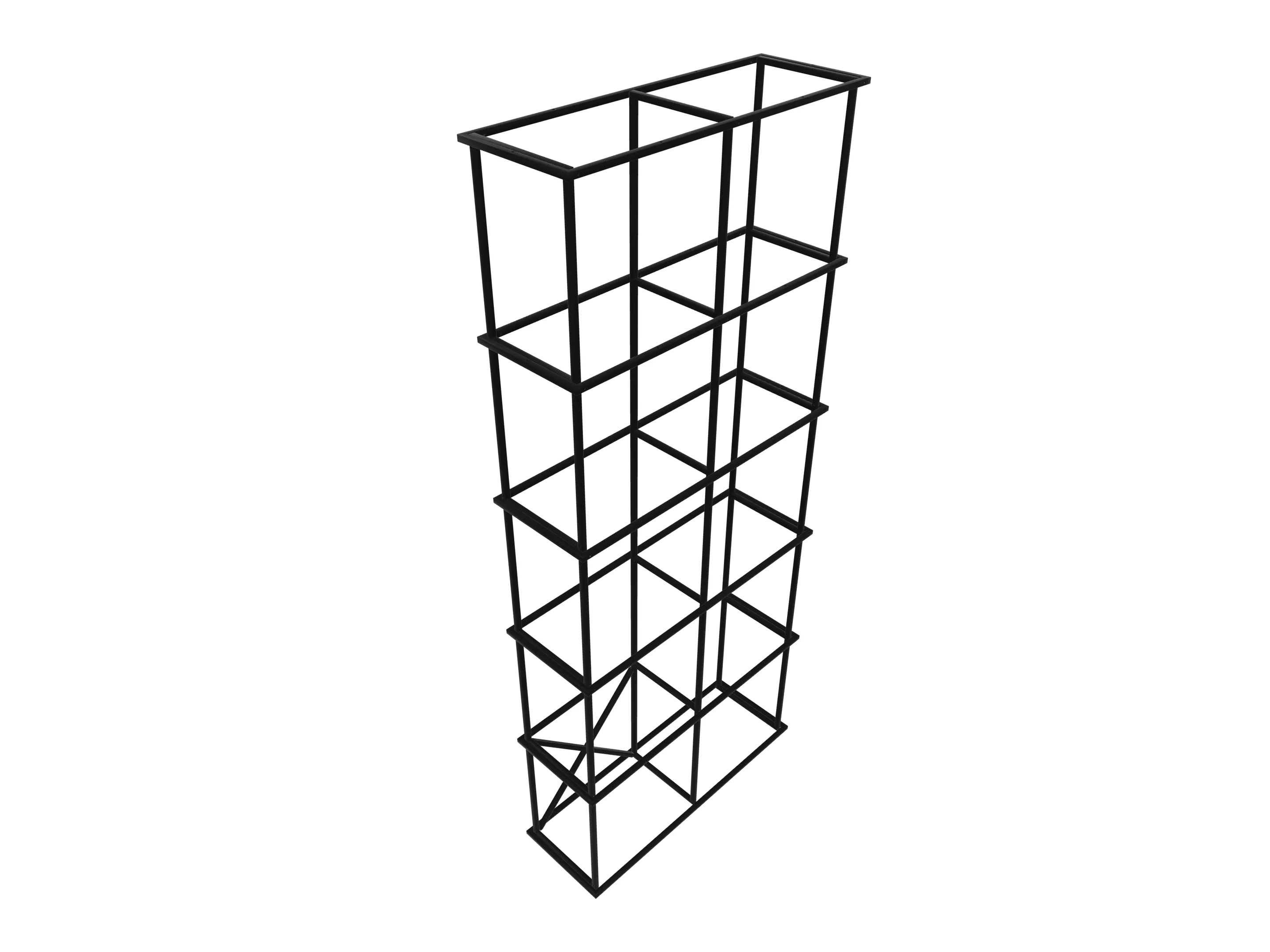 Hangend vakkenkast systeem uit stalen kokerprofielen, voorzien van één schoorkruis. Inhoud moet los besteld worden. Afmeting: 1789 x 1771 x 320mm (BxHxD). Let op! Frame wordt af fabriek compleet geleverd!
