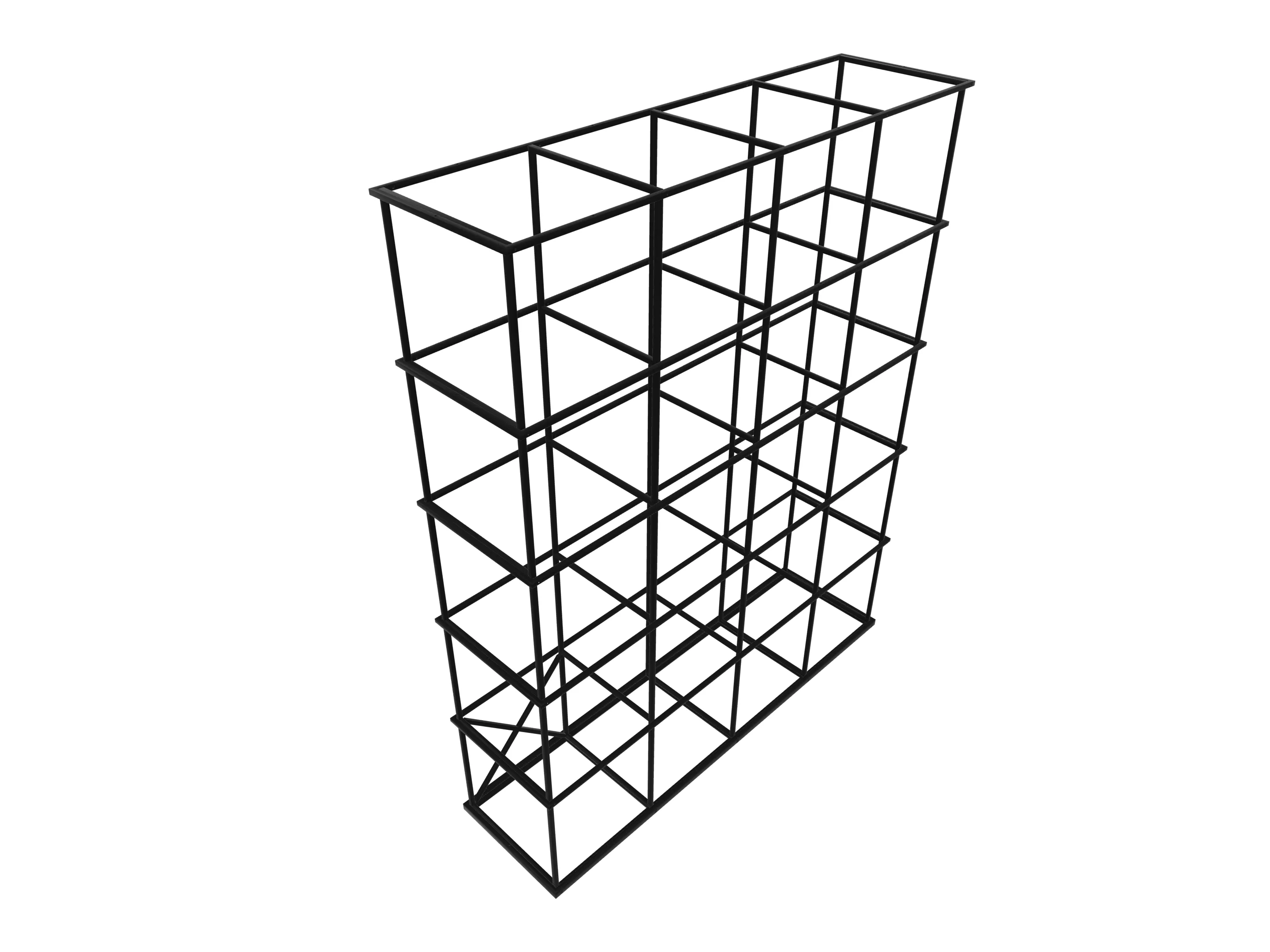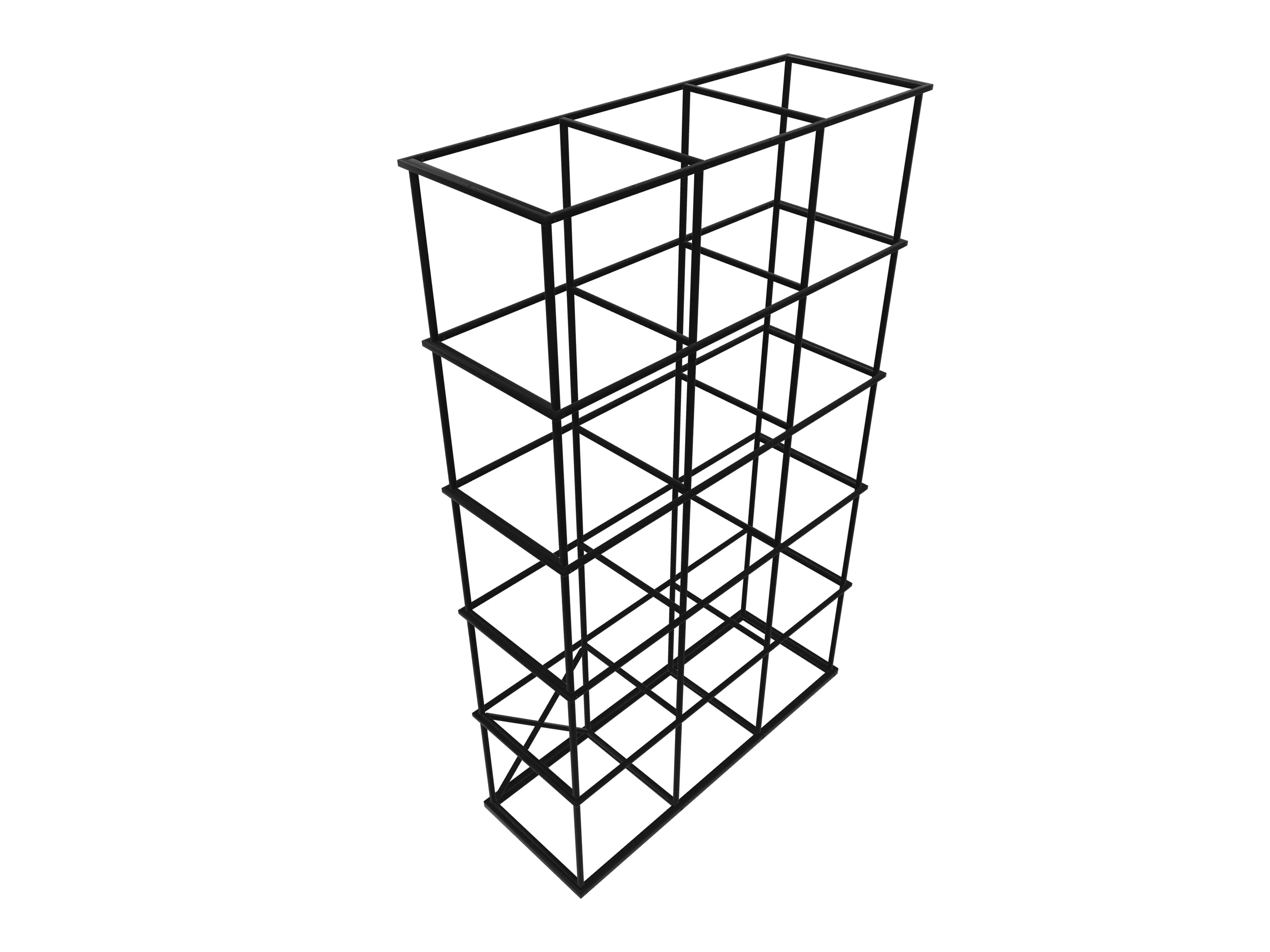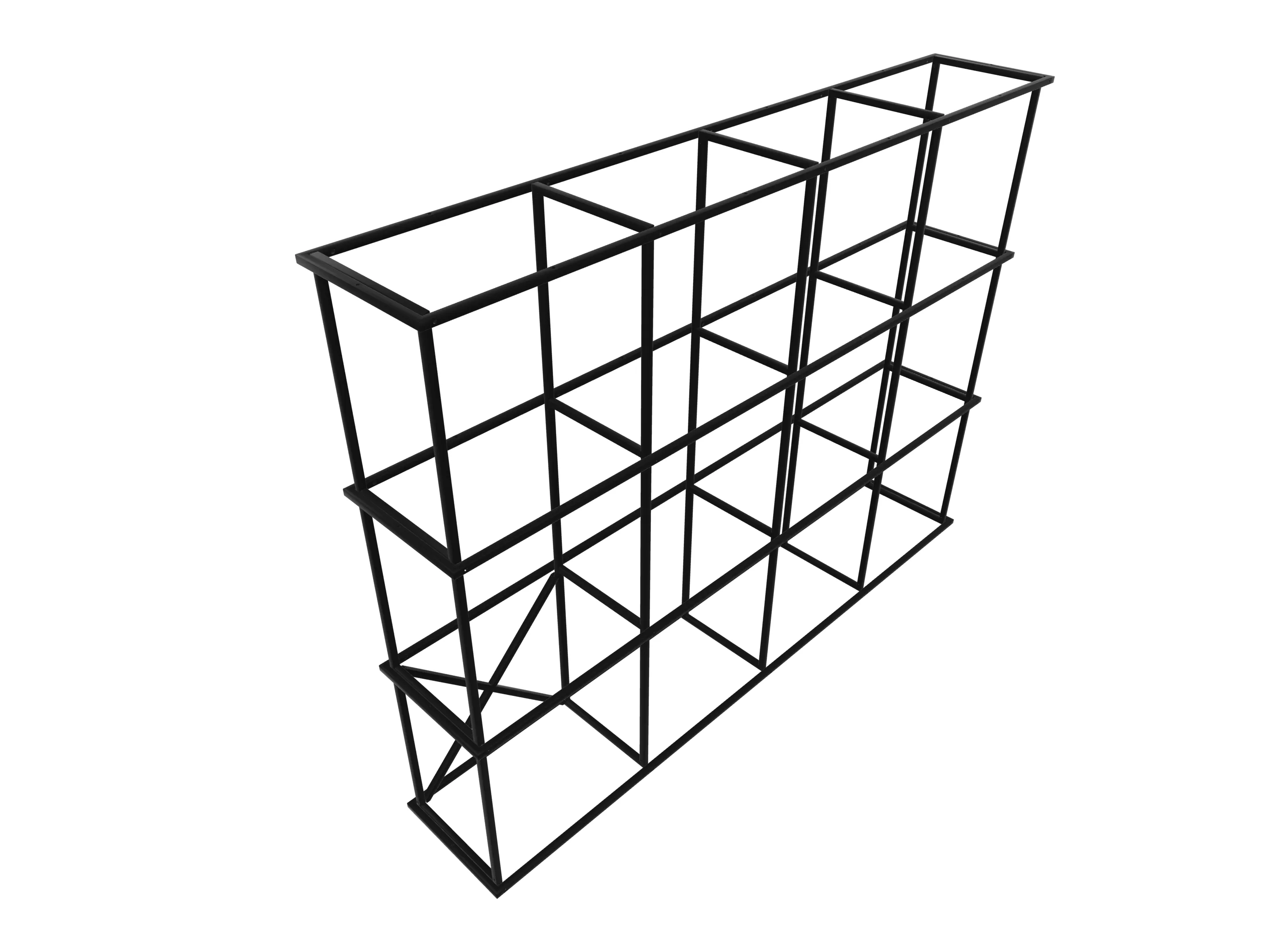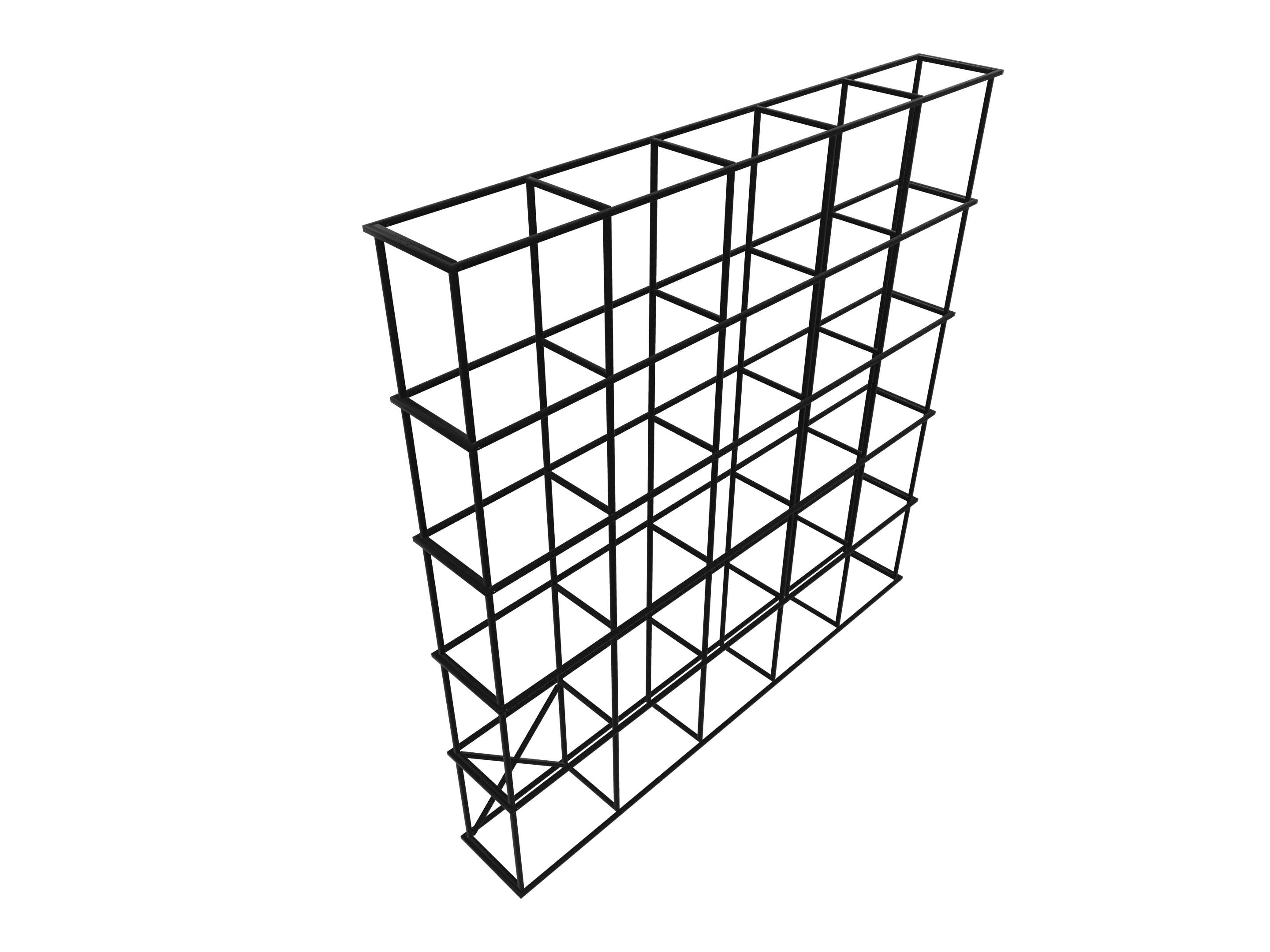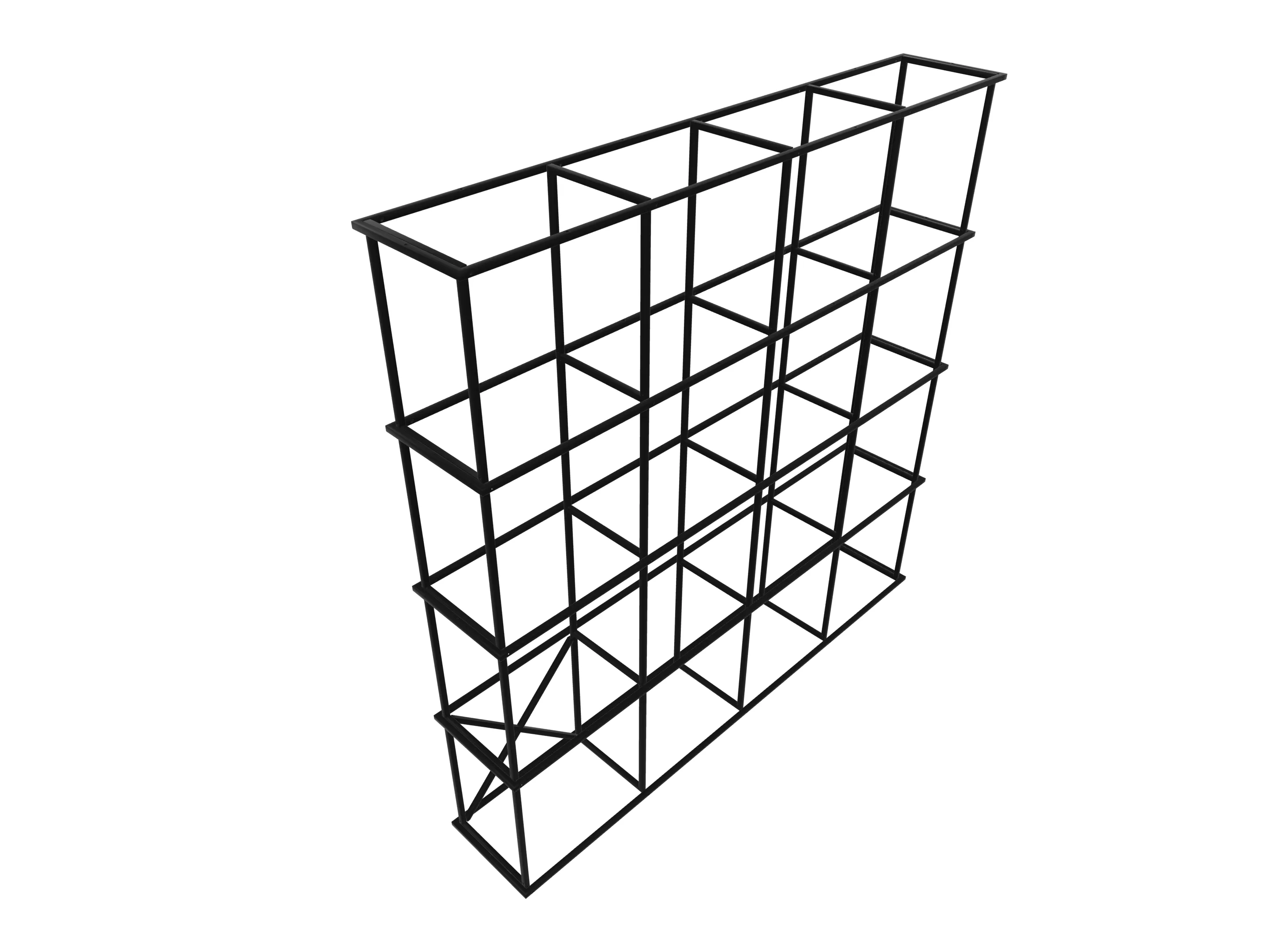 Hangend vakkenkast systeem uit stalen kokerprofielen, voorzien van één schoorkruis. Inhoud moet los besteld worden. Afmeting: 1789 x 1771 x 320mm (BxHxD). Let op! Frame wordt af fabriek compleet geleverd!