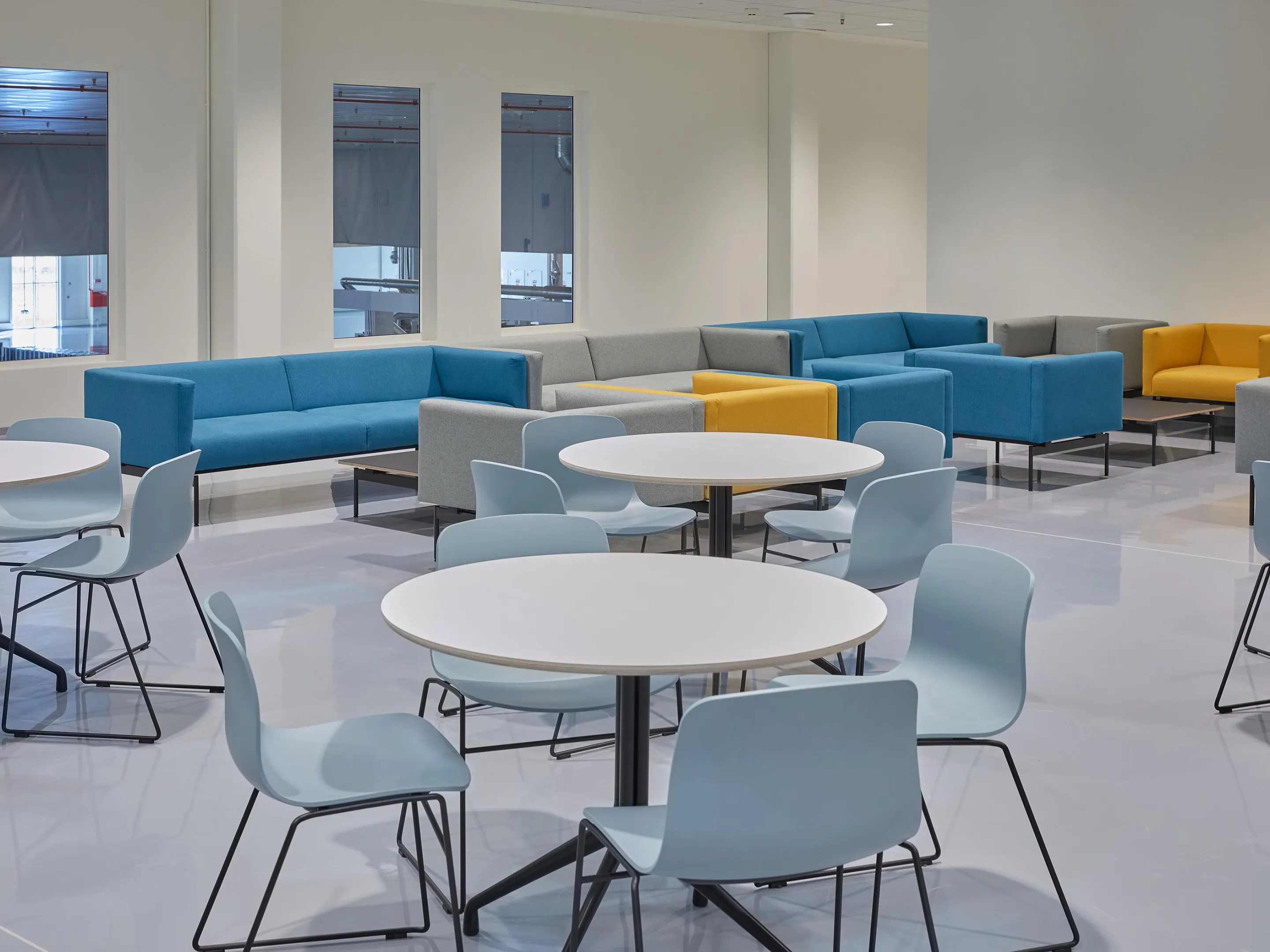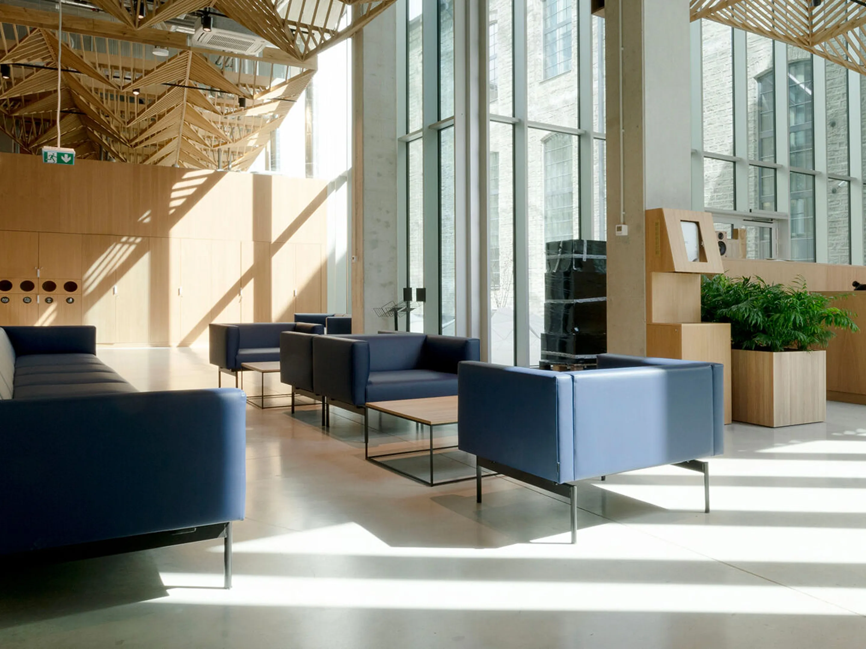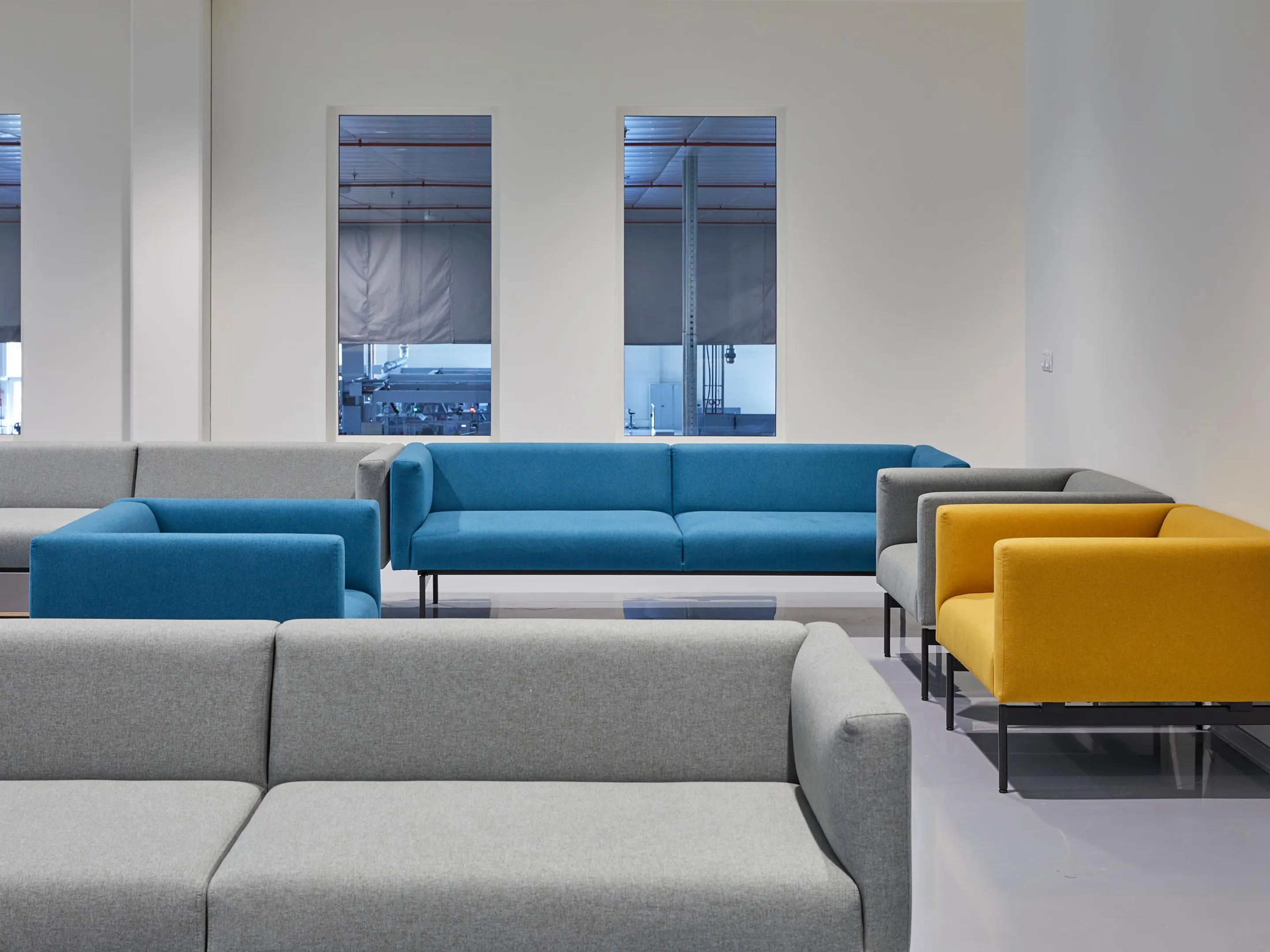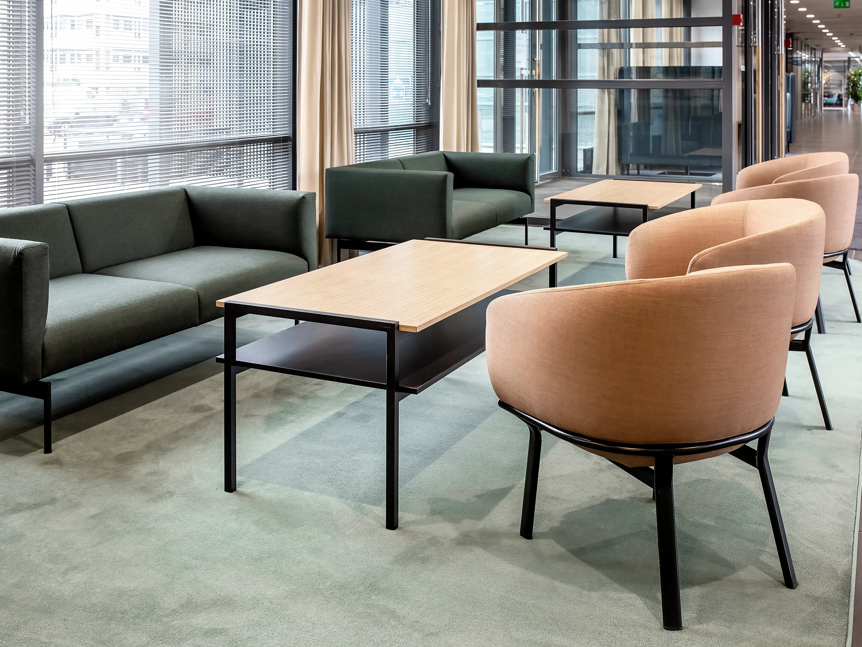 Volledig gestoffeerde 1,5-zits bank met lage rugleuning en armleuningen op een 4-poots frame. 1170 x 810 x 700mm (B x D x H).