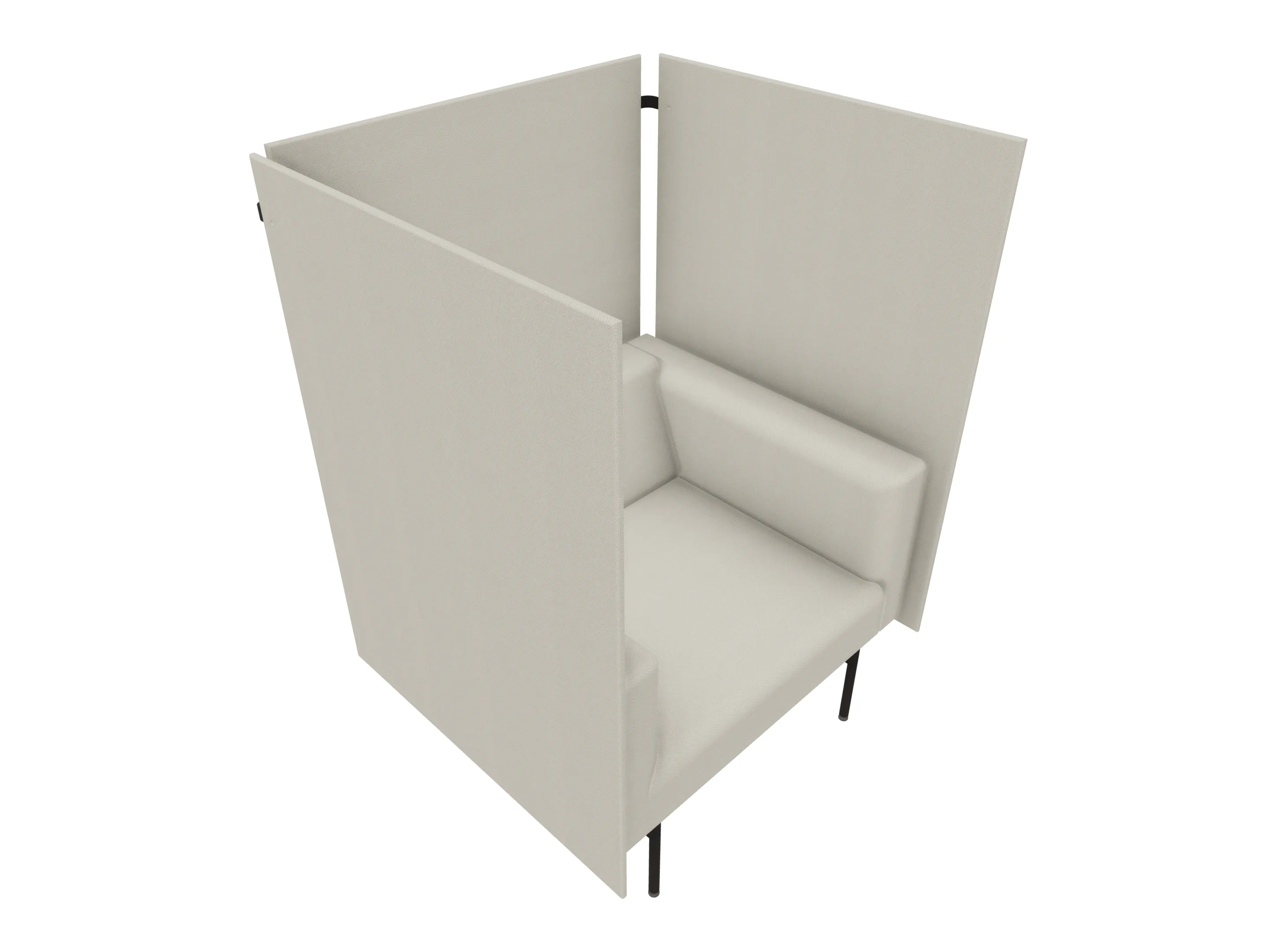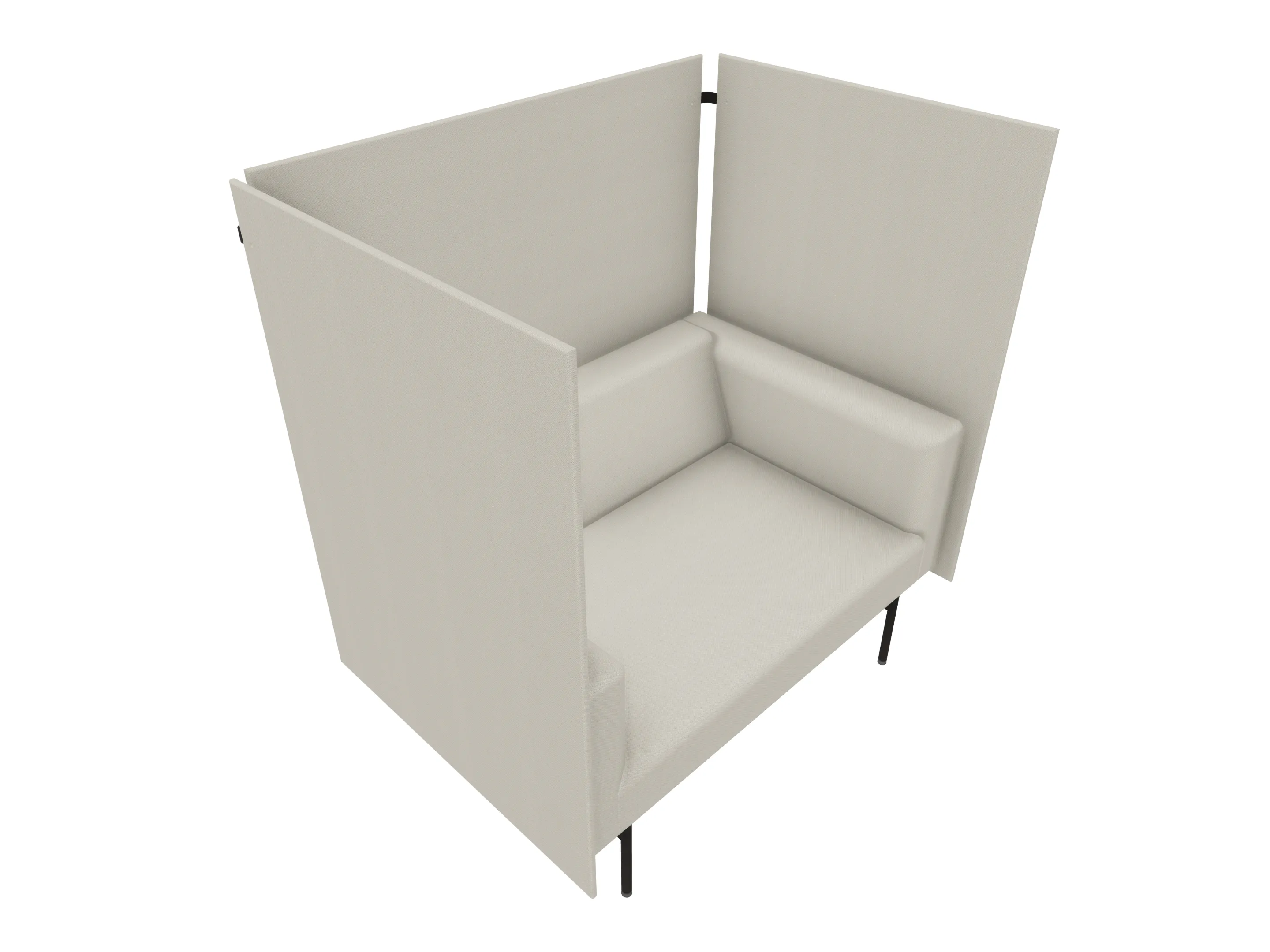 Volledig gestoffeerde 1-zits bank met lage rugleuning en armleuningen met hoge ombouw op een 4-poots frame. 960 x 880 x 1350mm (B x D x H).
