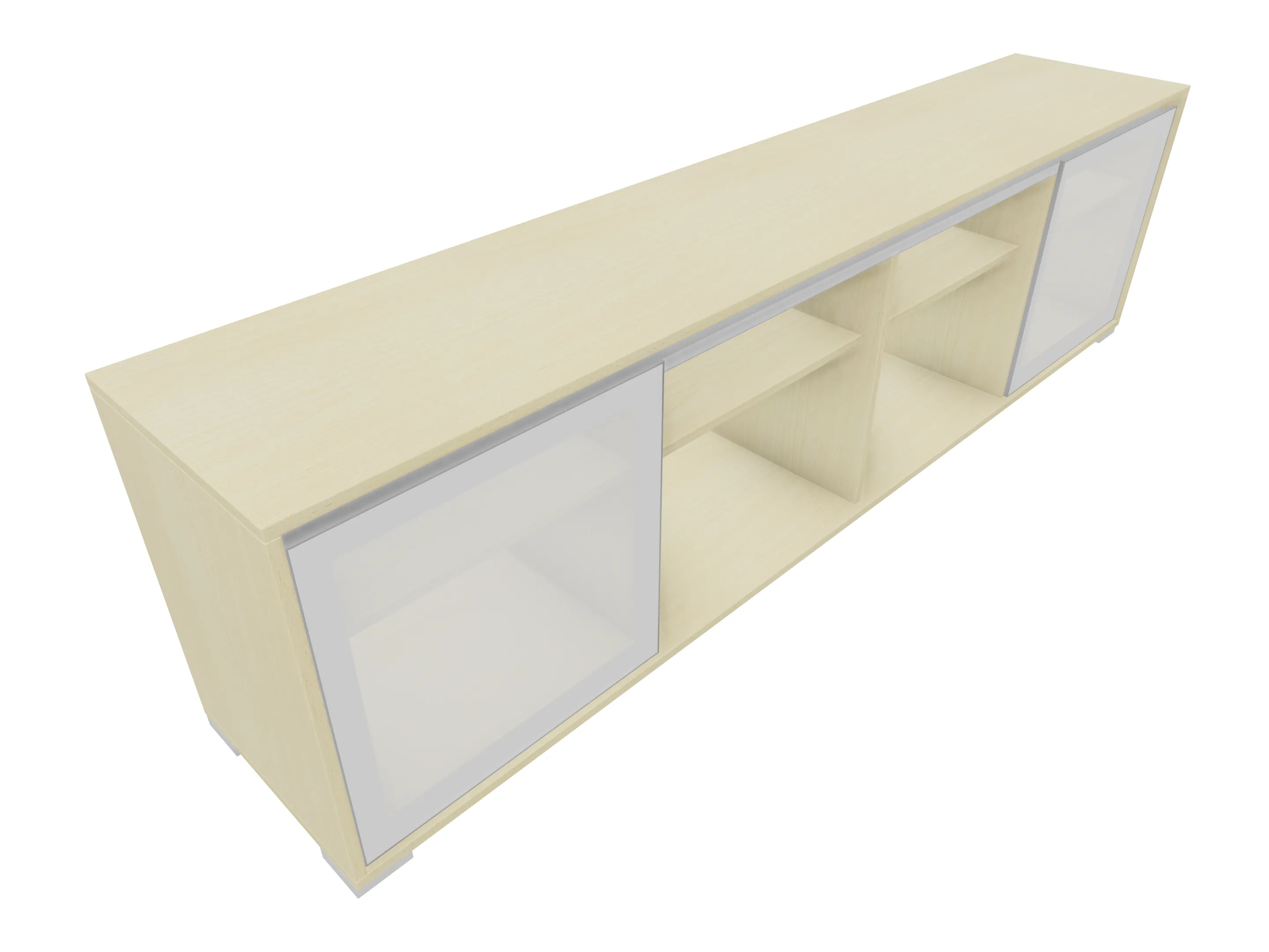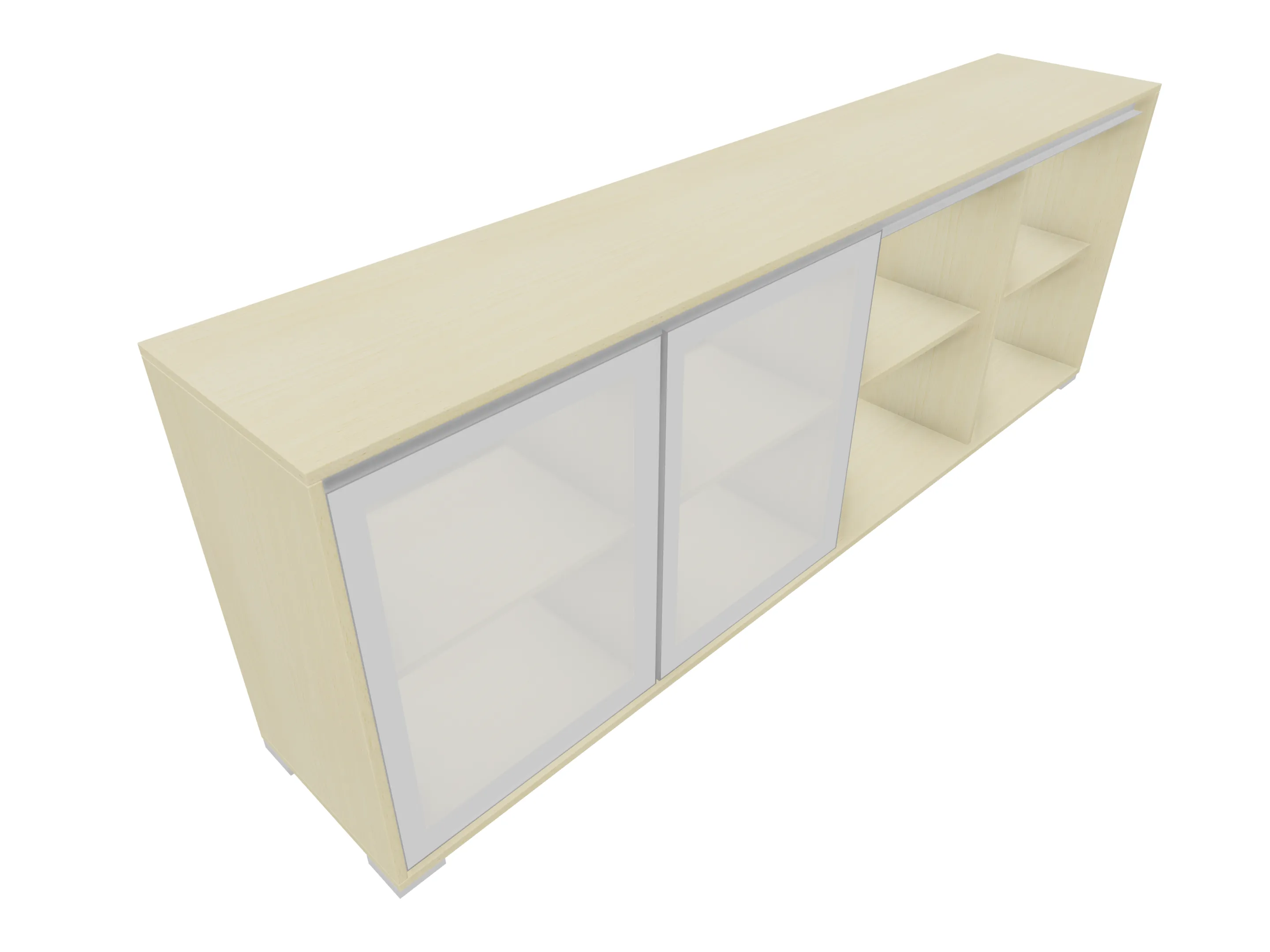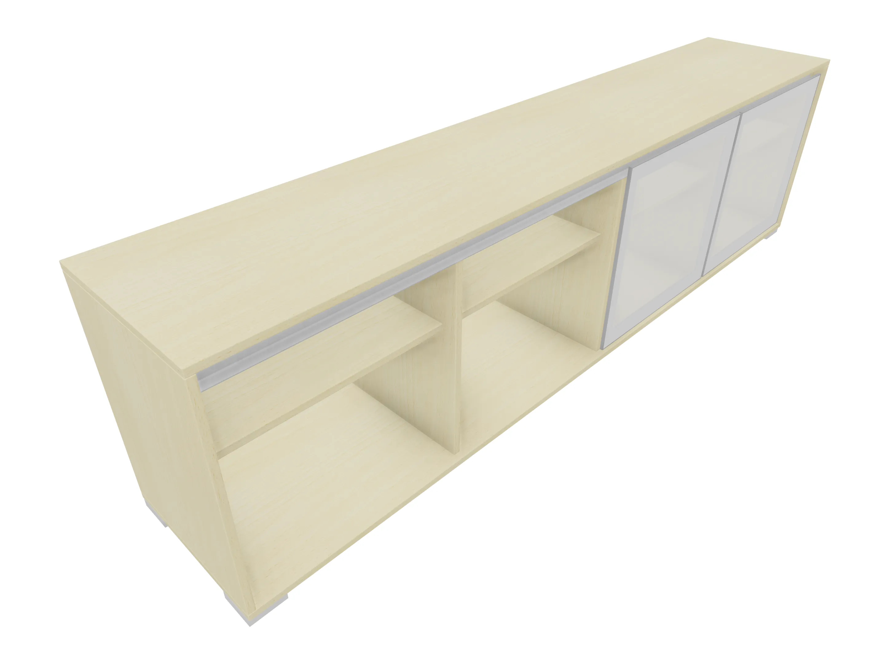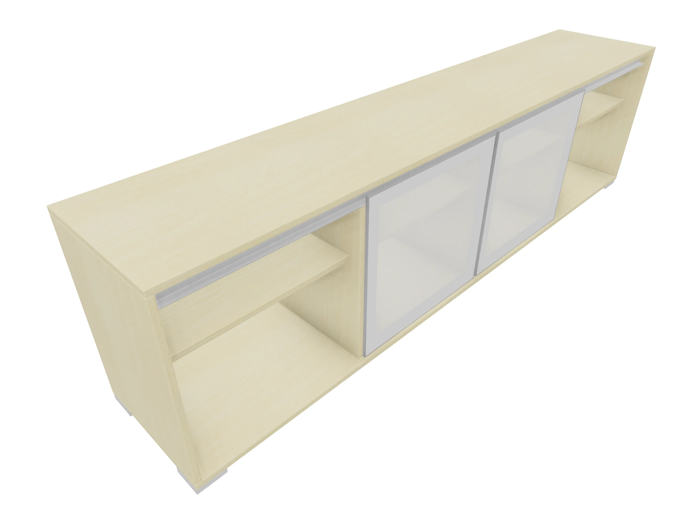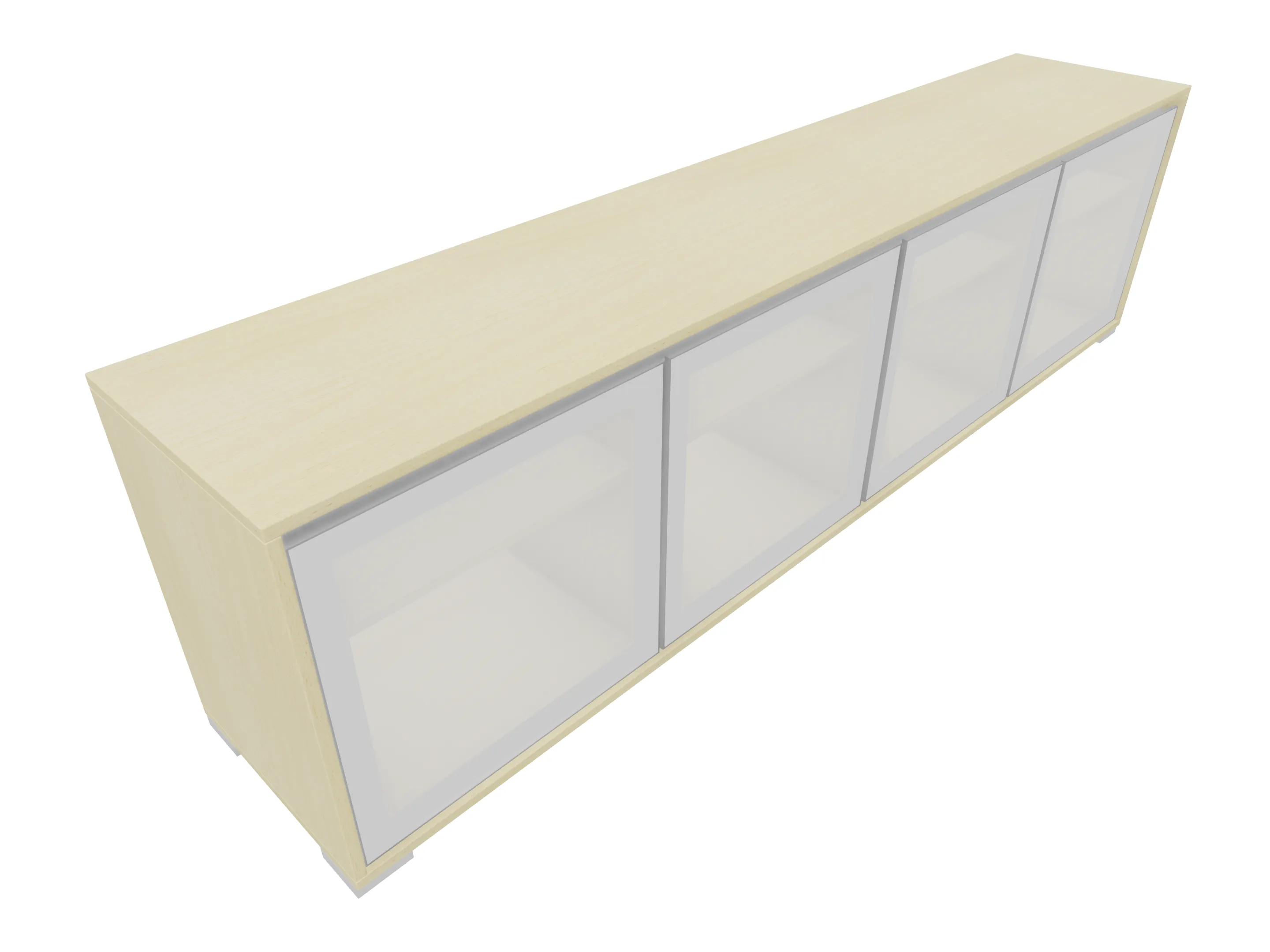 Modulekast met 4 draaideuren, waarvan 2 linksdraaiend en 2 rechtsdraaiend. Achter elke deur een legbord. Op metalen hoeksokkels. Afmeting: 2343 x 640 x 441mm (BxHxD)