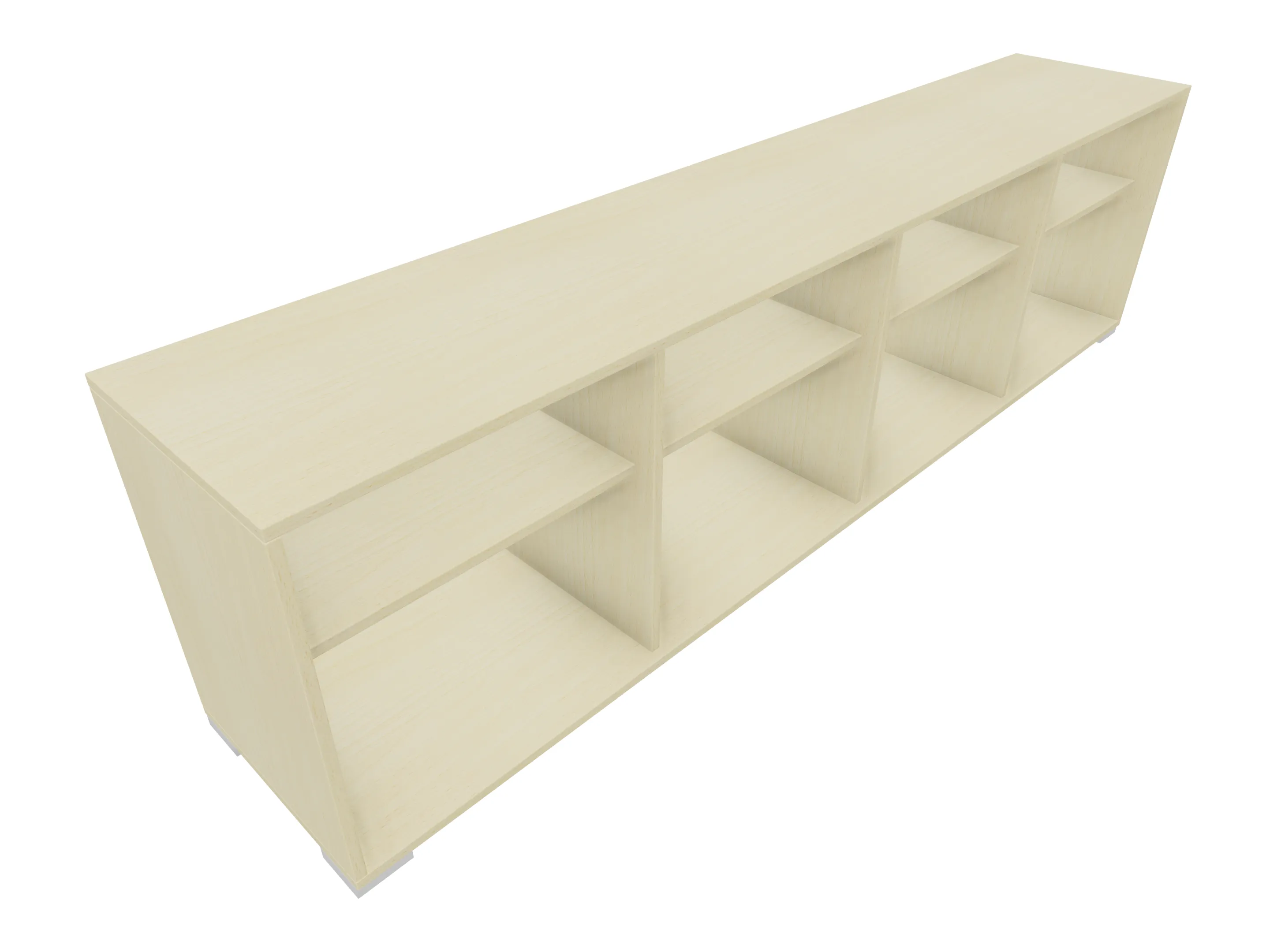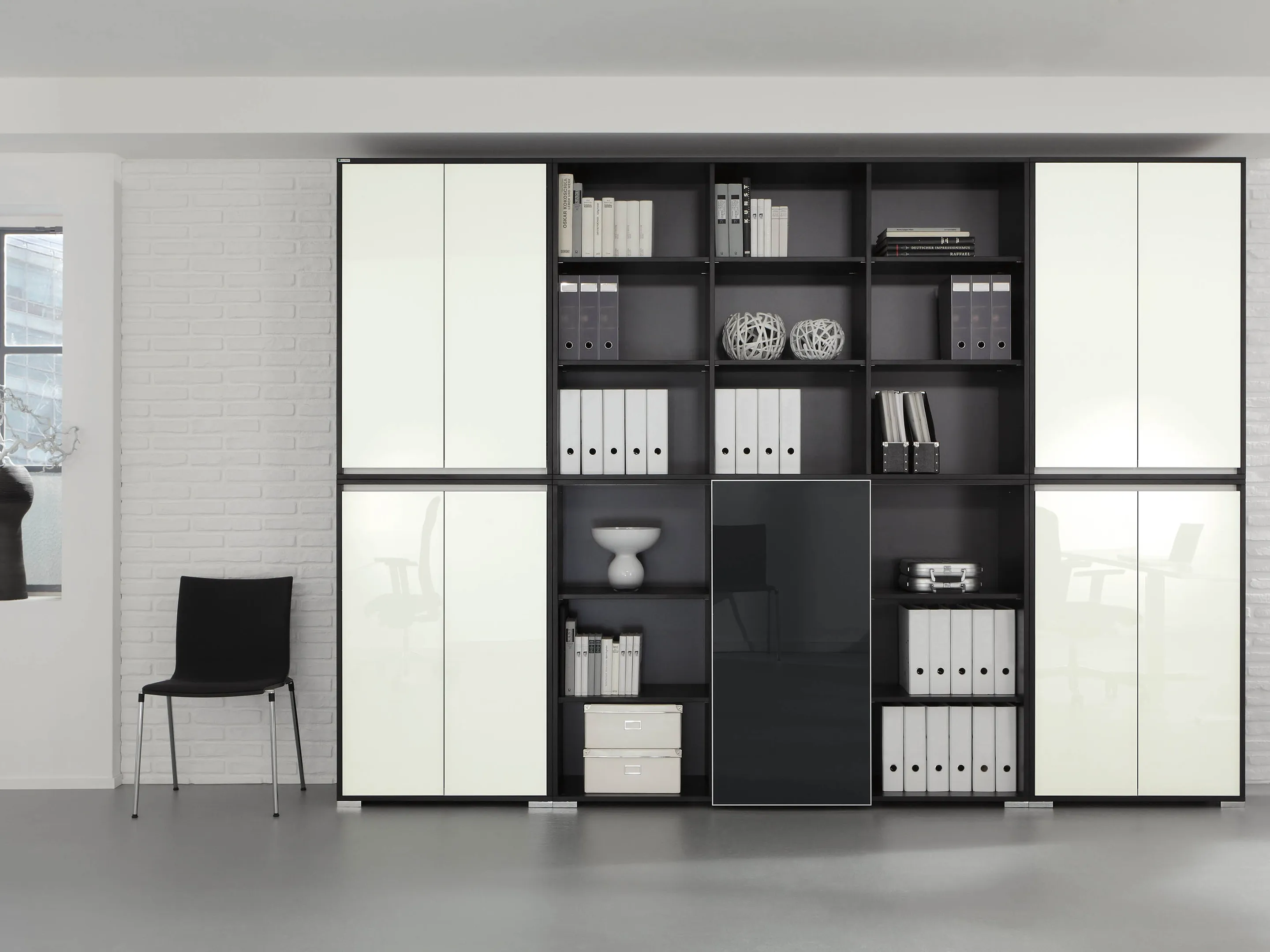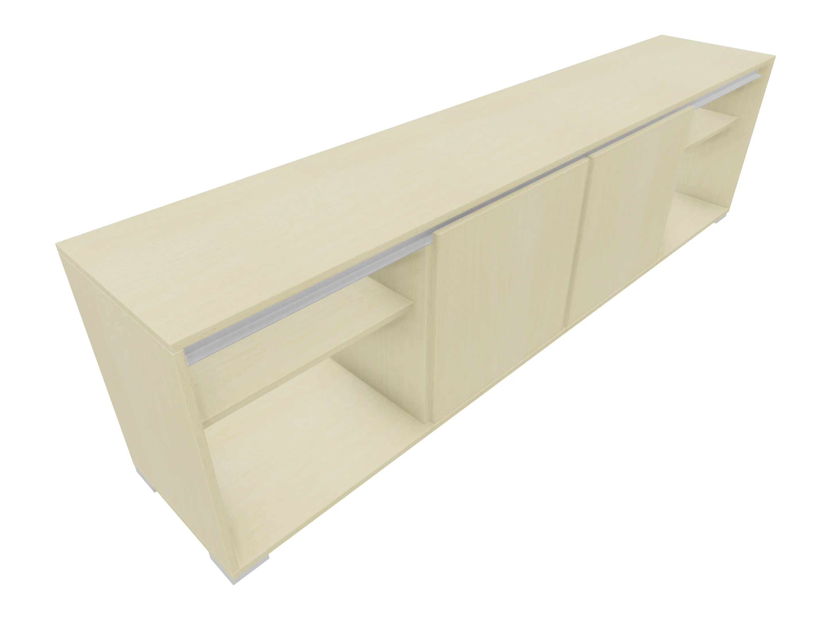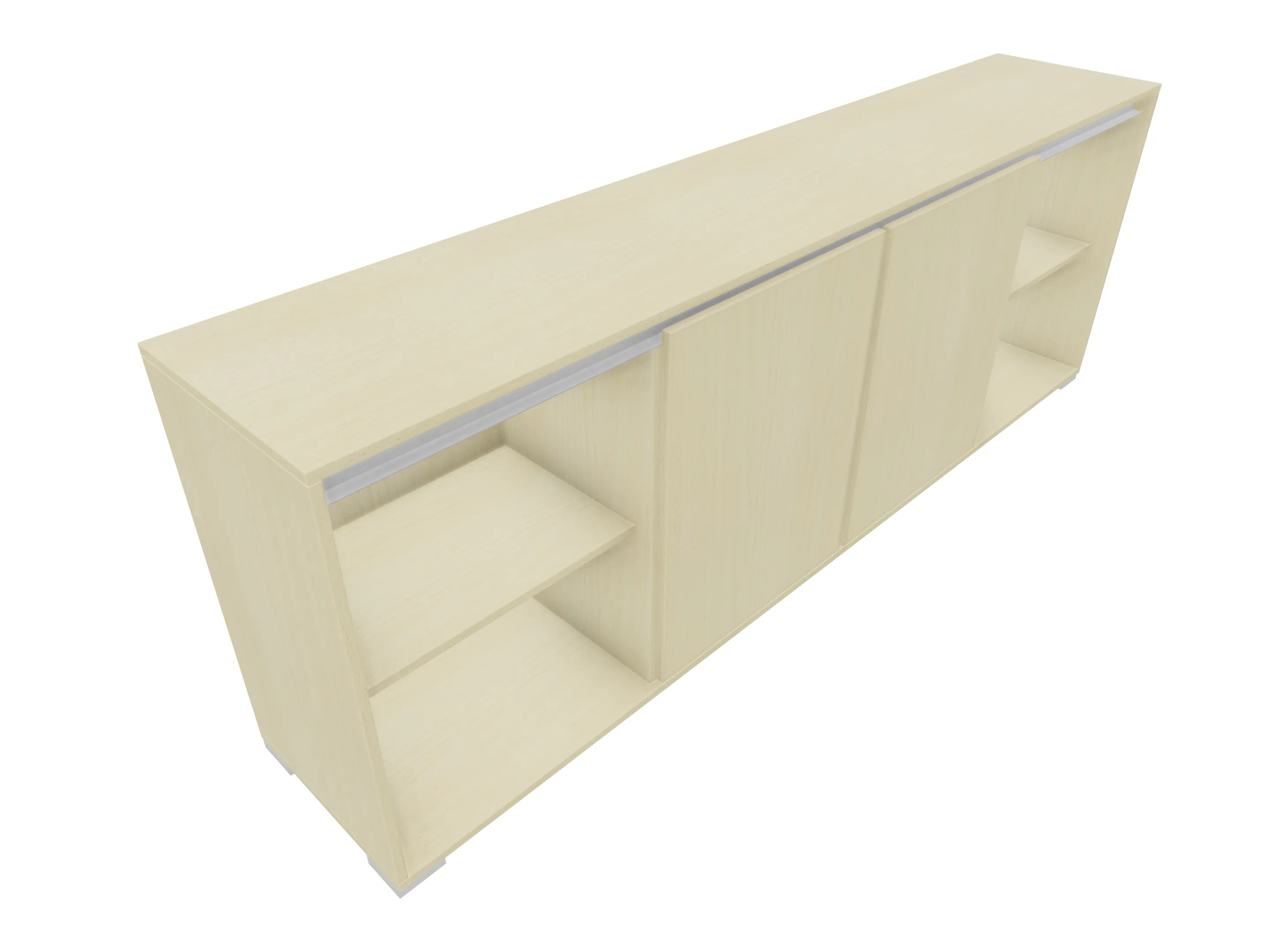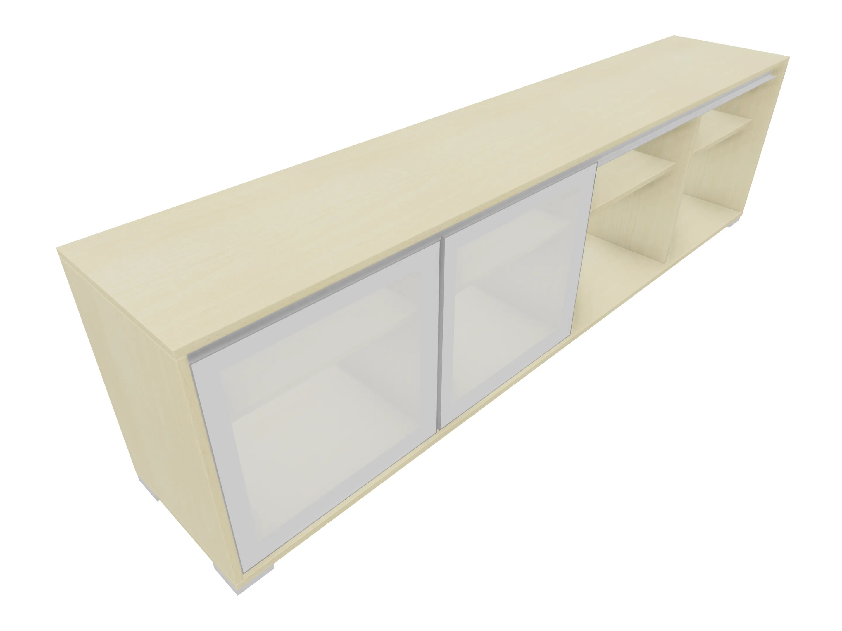Modulekast met 4 draaideuren, waarvan 2 linksdraaiend en 2 rechtsdraaiend. Achter elke deur een legbord. Op metalen hoeksokkels. Afmeting: 2343 x 640 x 441mm (BxHxD)