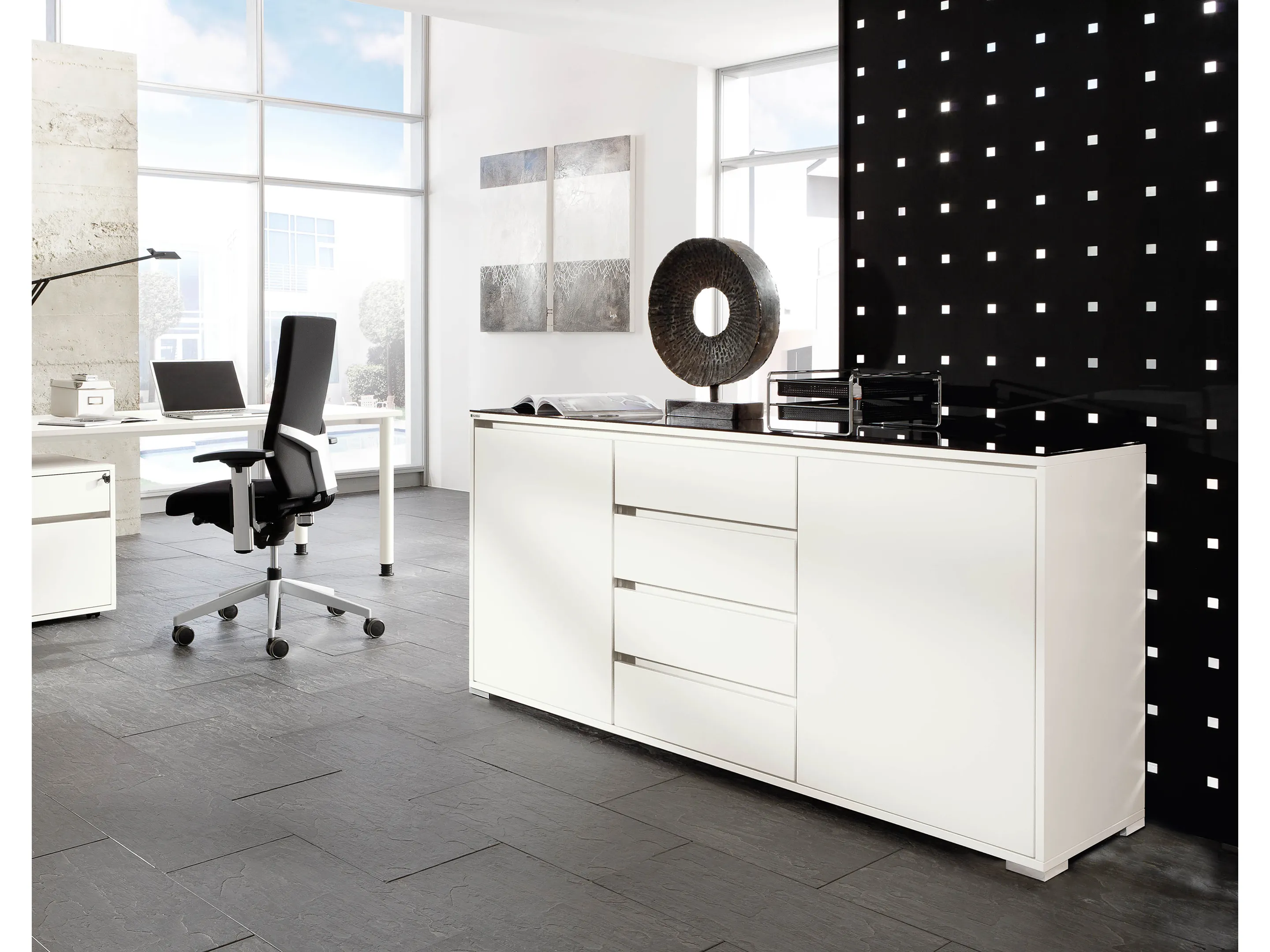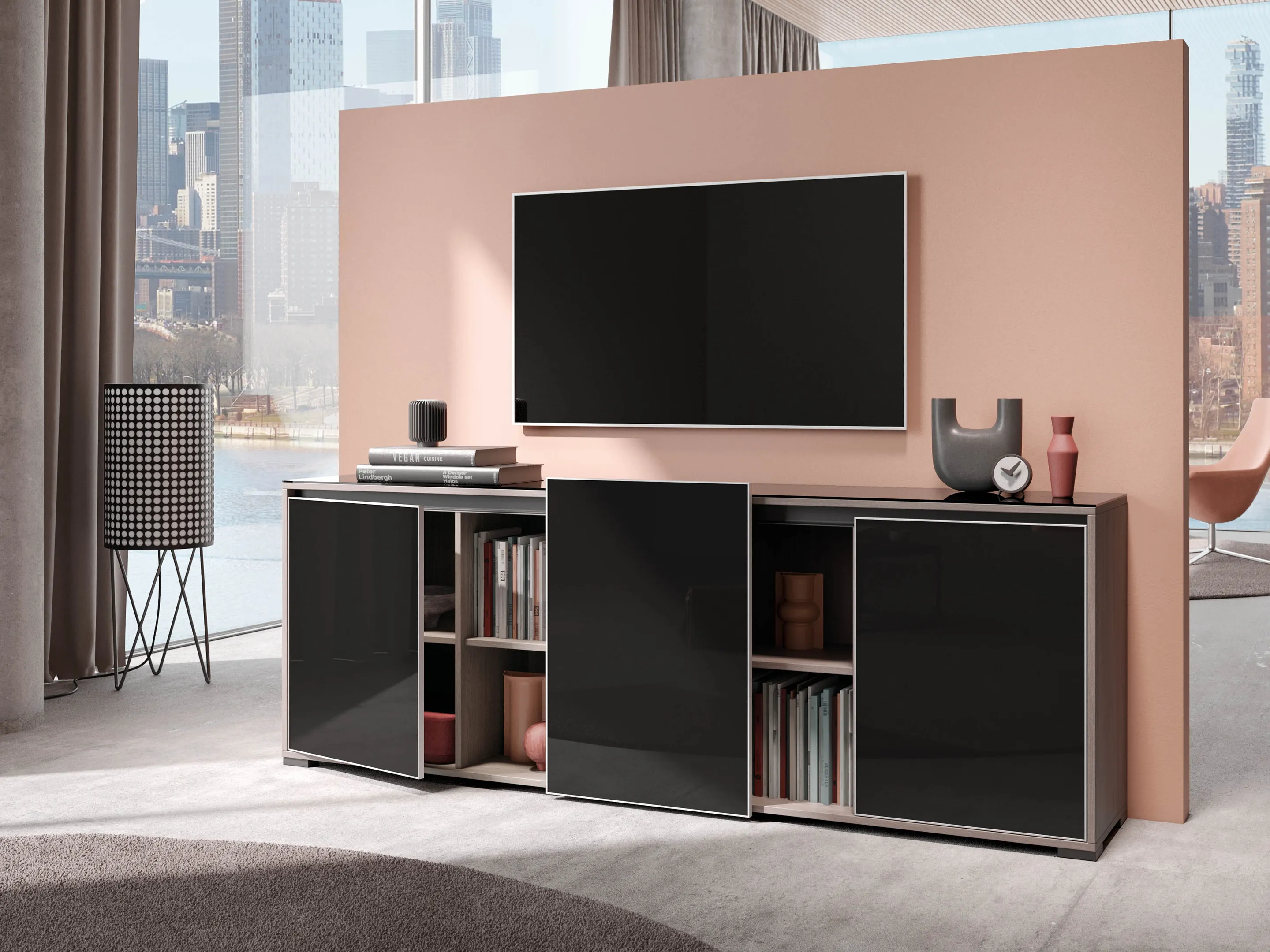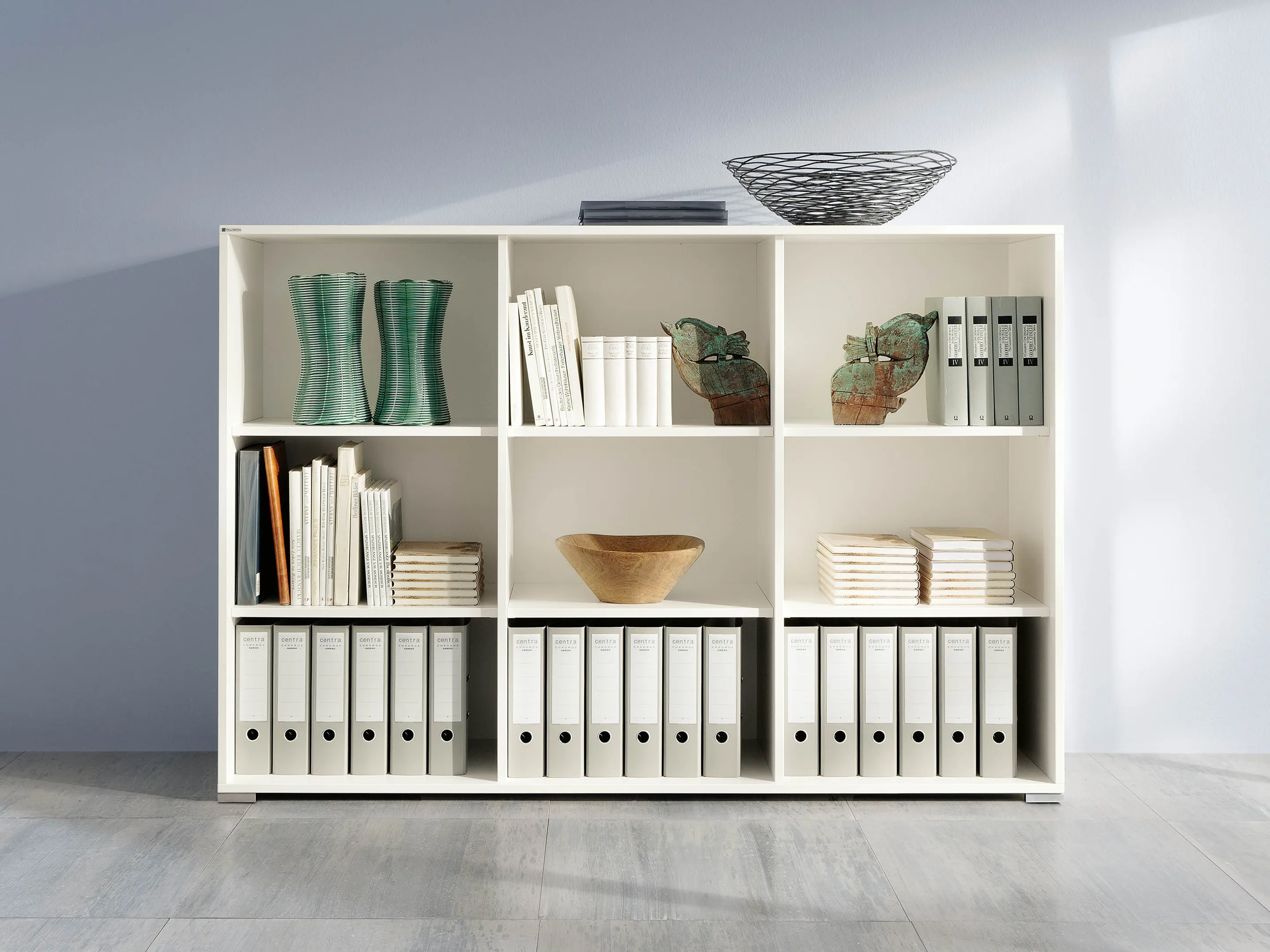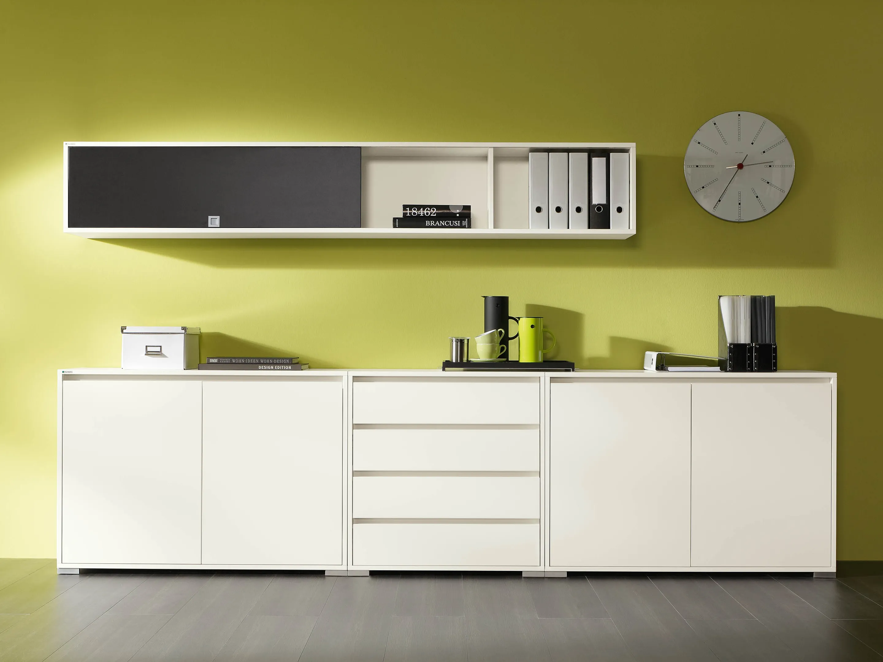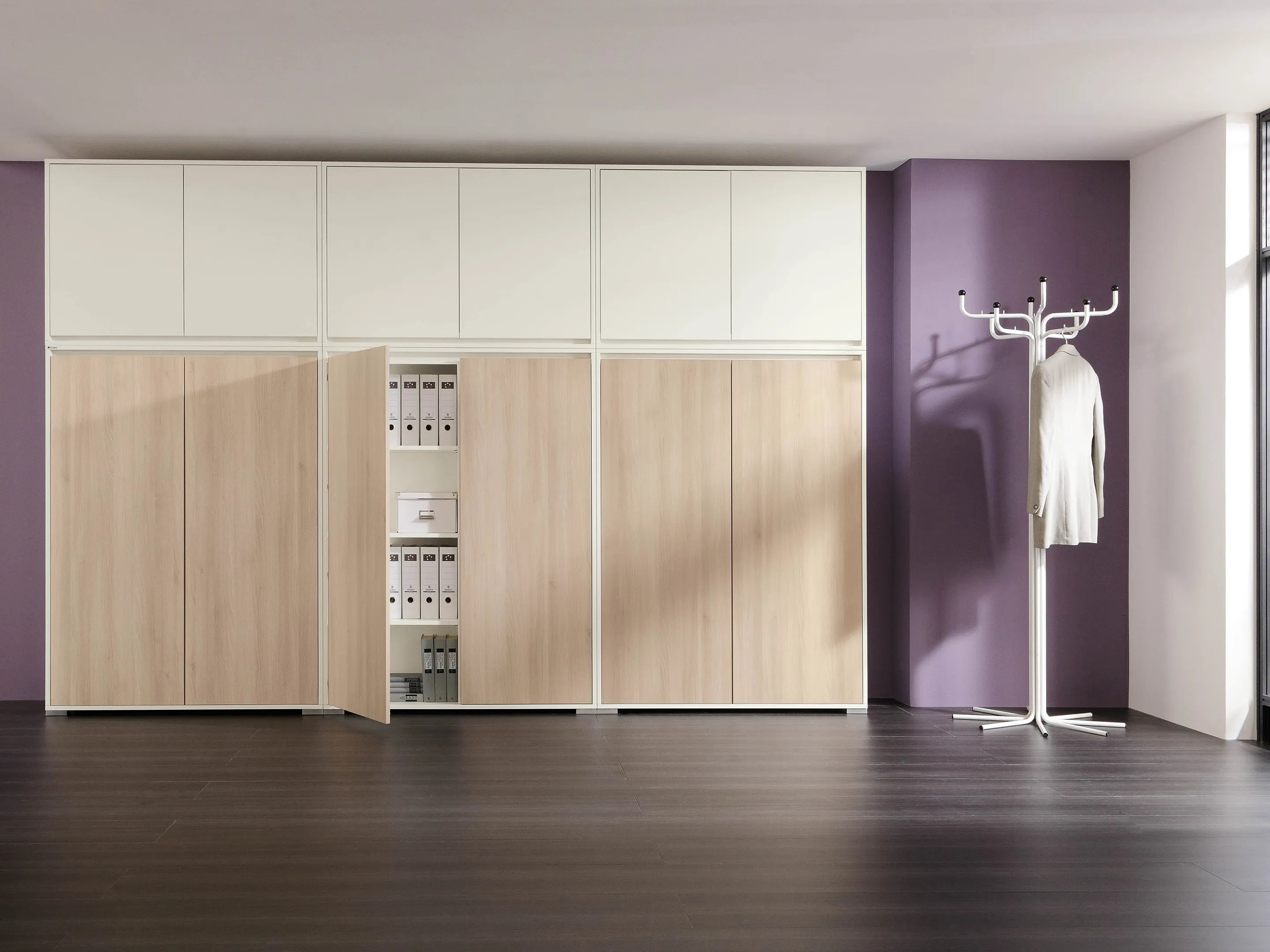 Modulekast met 4 draaideuren, waarvan 2 linksdraaiend en 2 rechtsdraaiend. Achter elke deur een legbord. Op metalen hoeksokkels. Afmeting: 2343 x 640 x 441mm (BxHxD)
