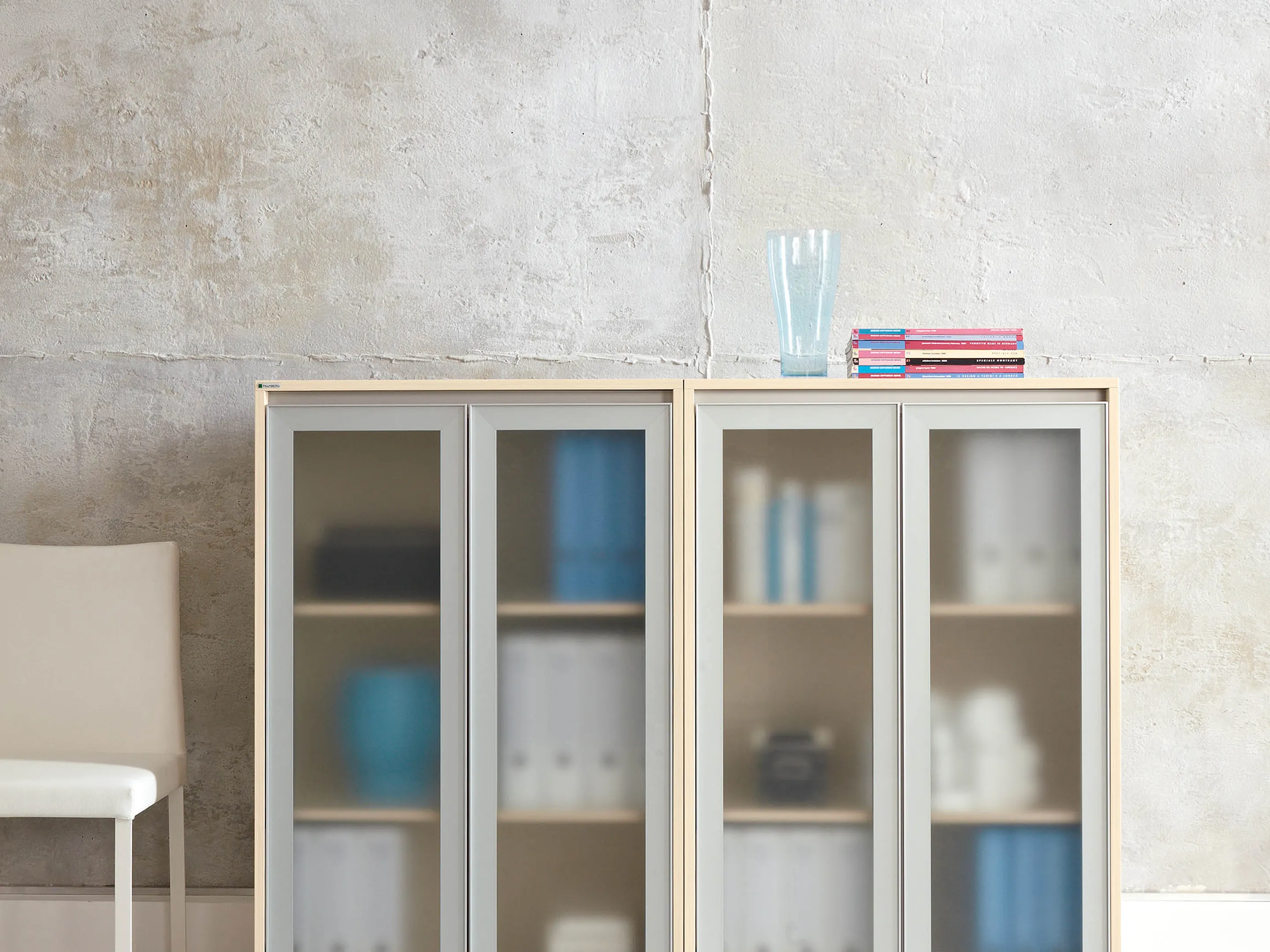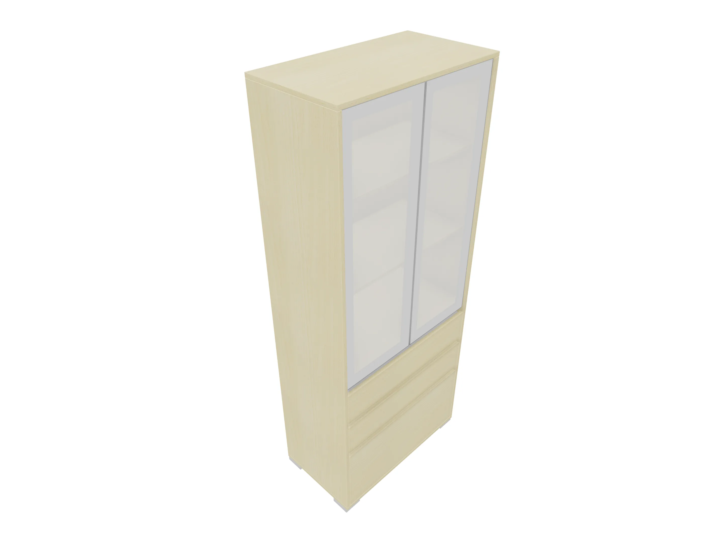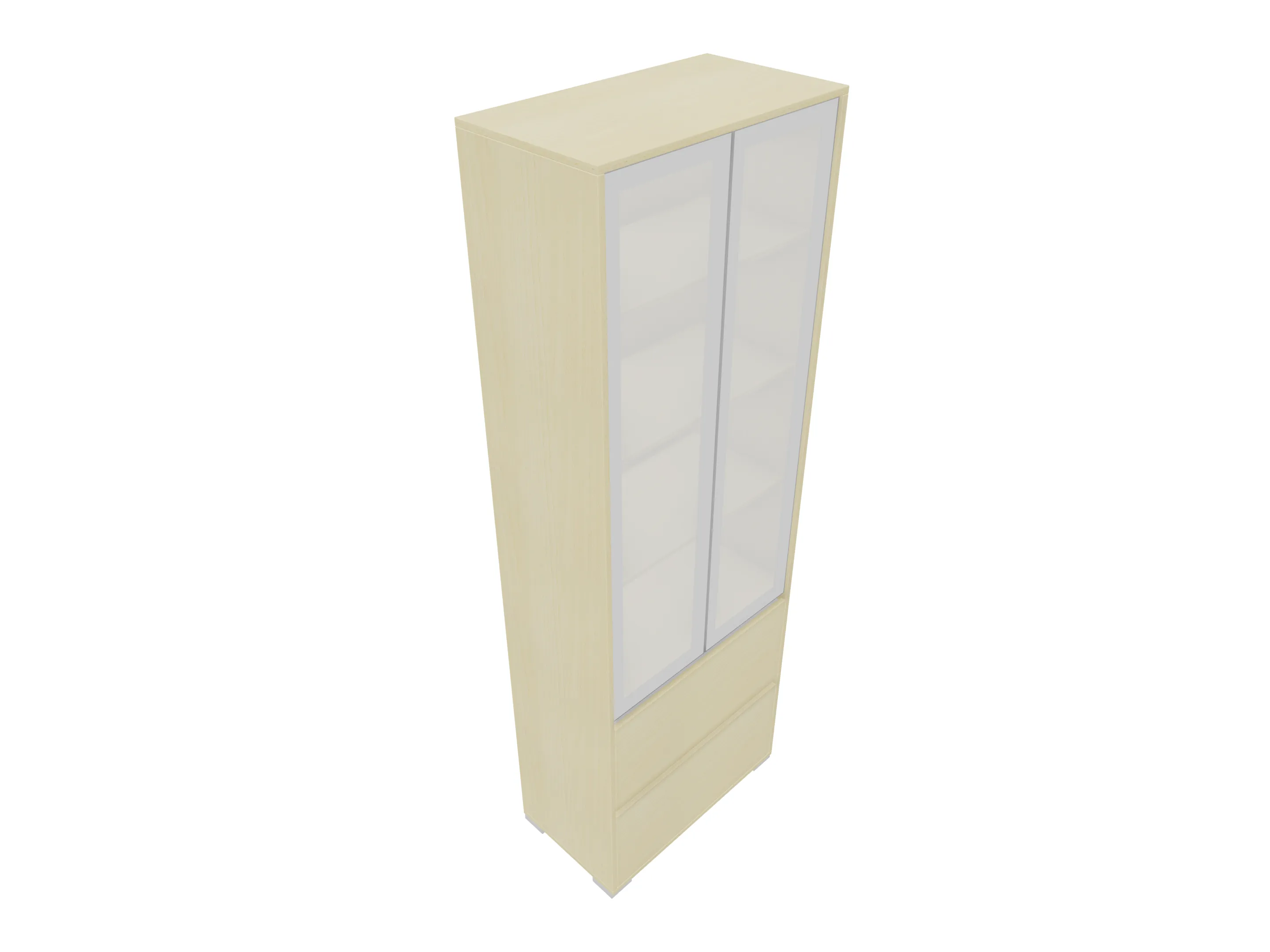 Glasdeurkast compleet met 2 systeemladen benden (gesciht voor hangmappen), boven 2 glasdeuren, 2 legborden en metalen hoeksokkels. Afmeting: 800 x 1984 x 441mm (BxHxD)