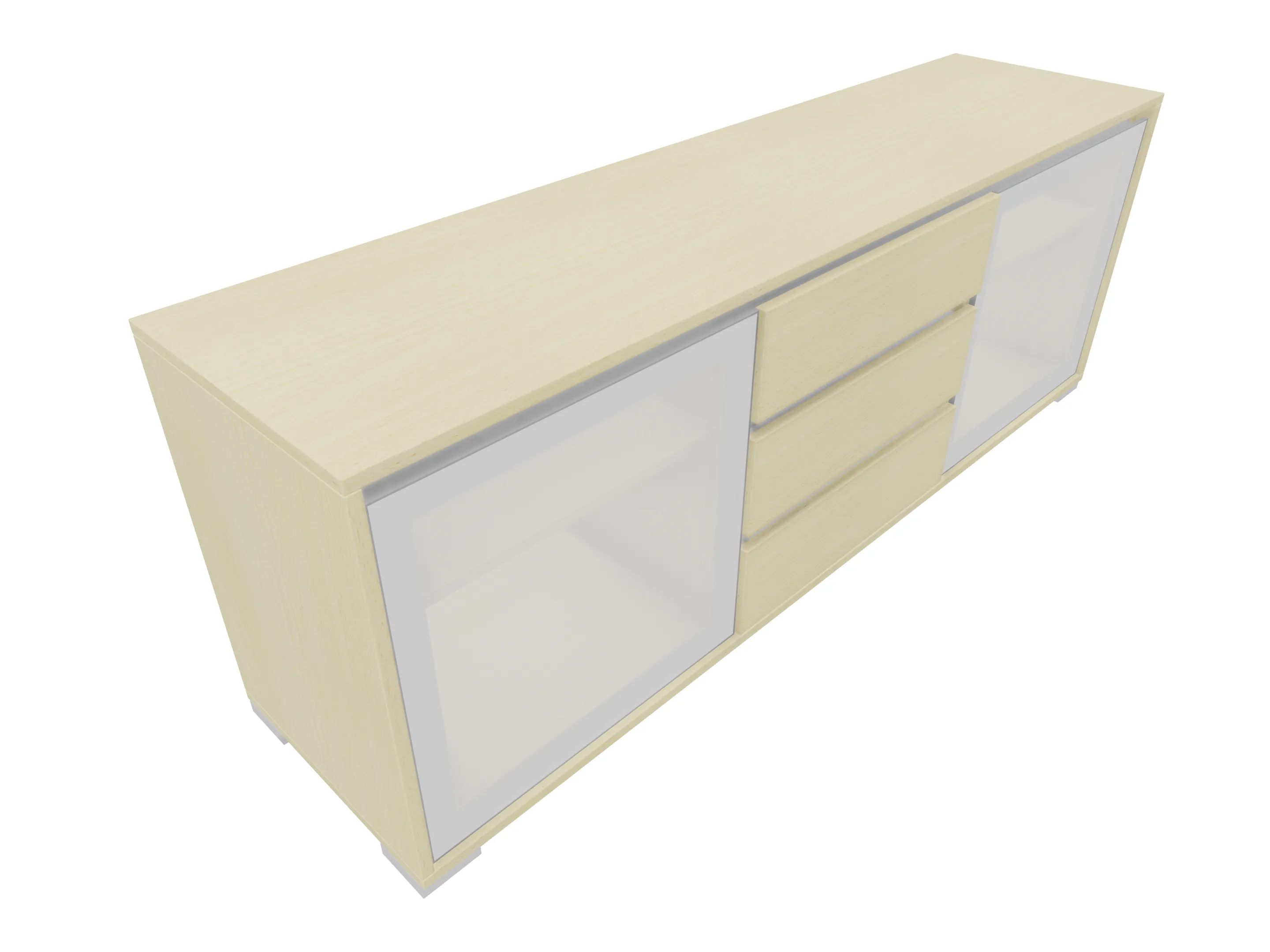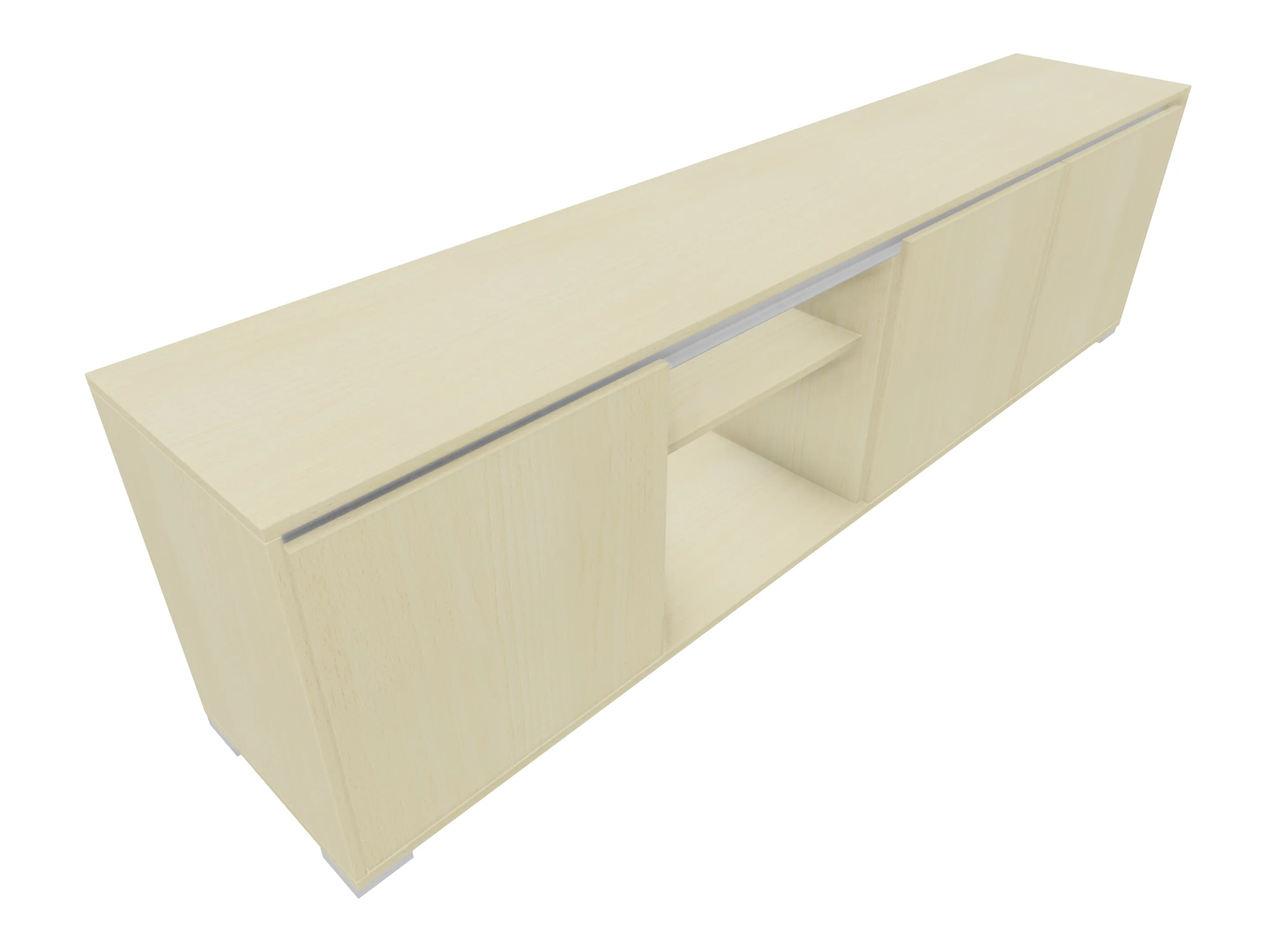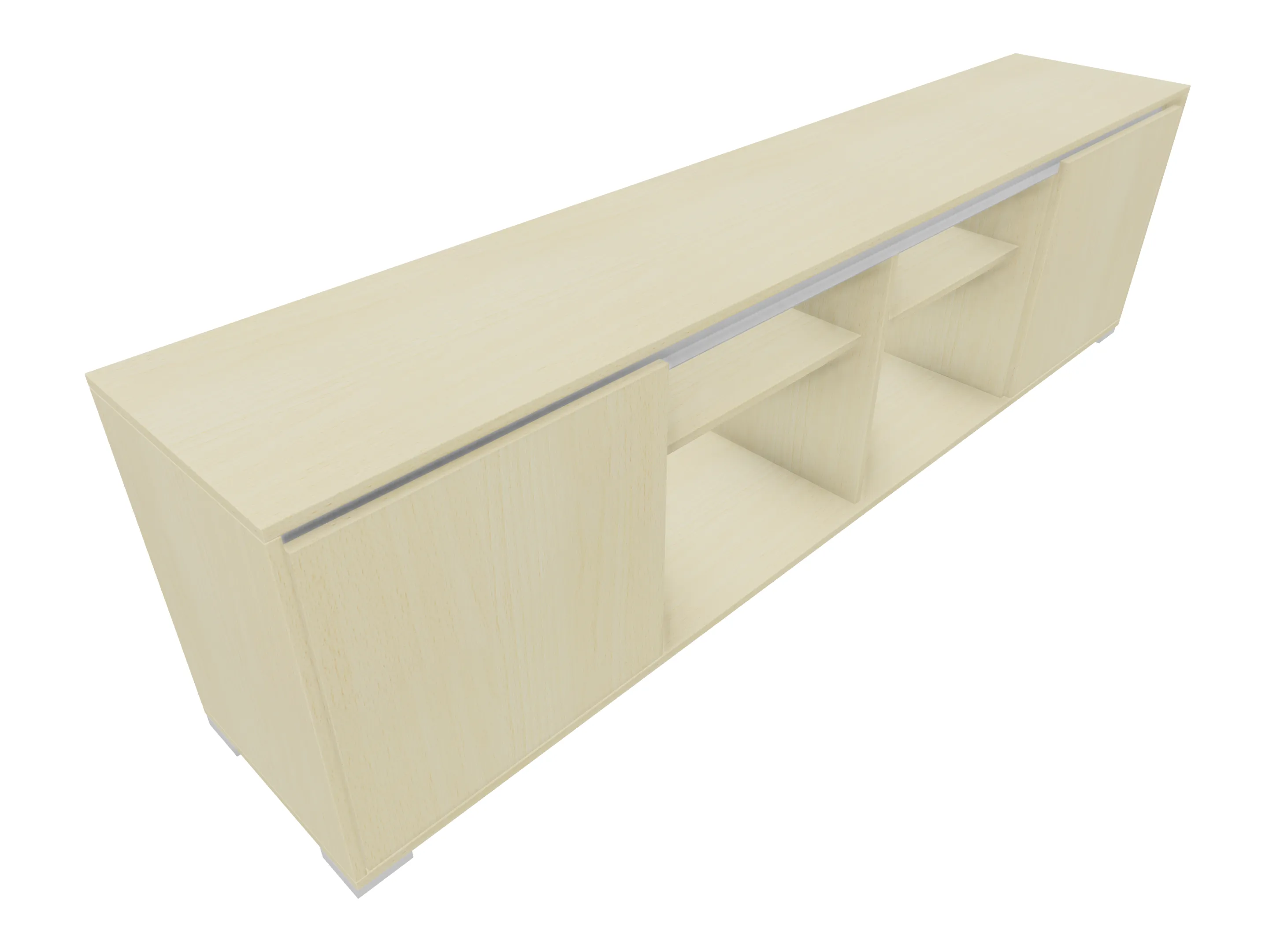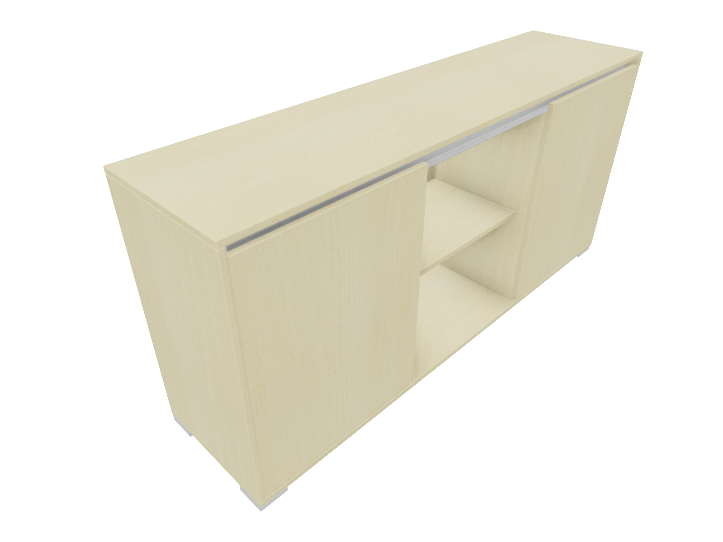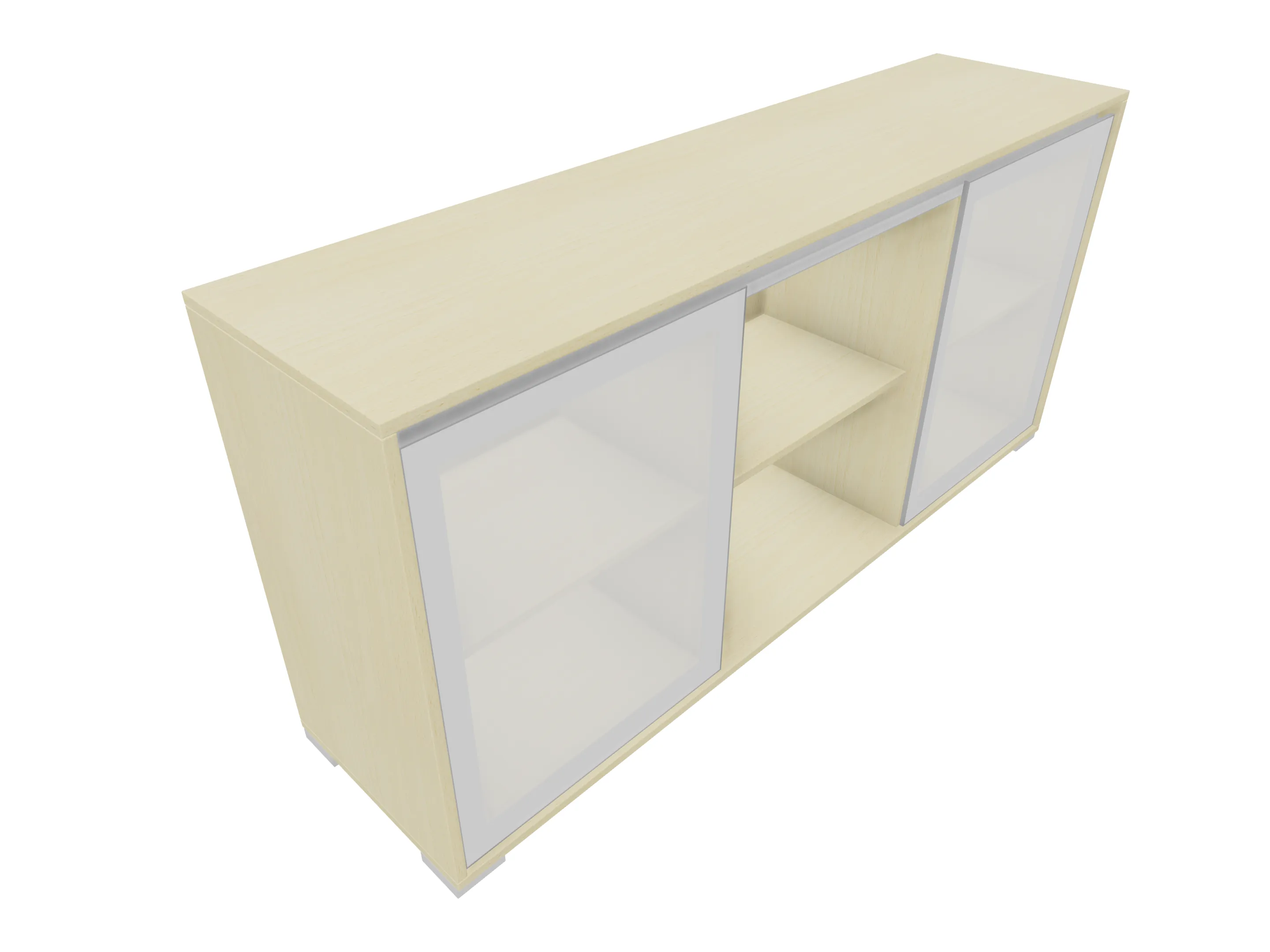 Modulekast met link en rechts een draaideur, met legbord. In de midden een openvak met legbord. Op metalen hoeksokkels. Afmeting: 1762 x 832 x 441mm (BxHxD)