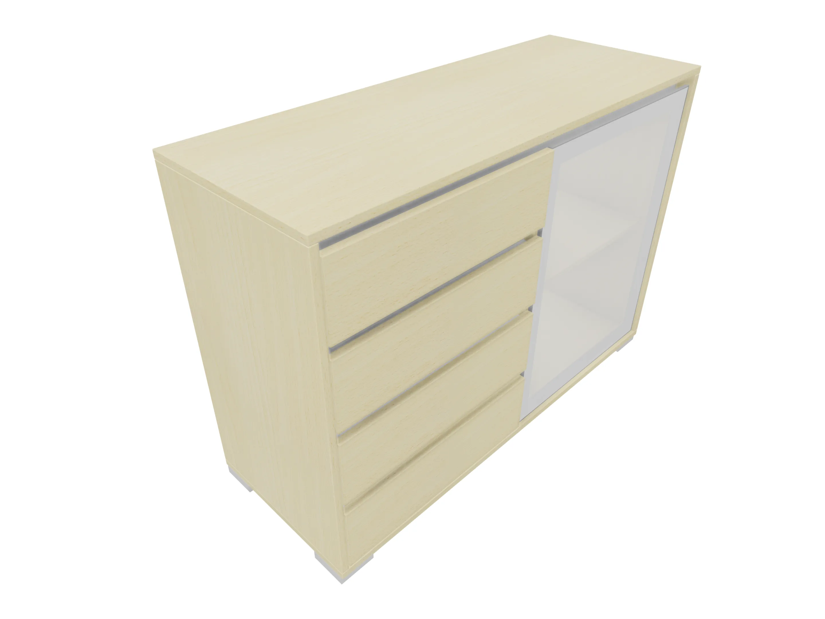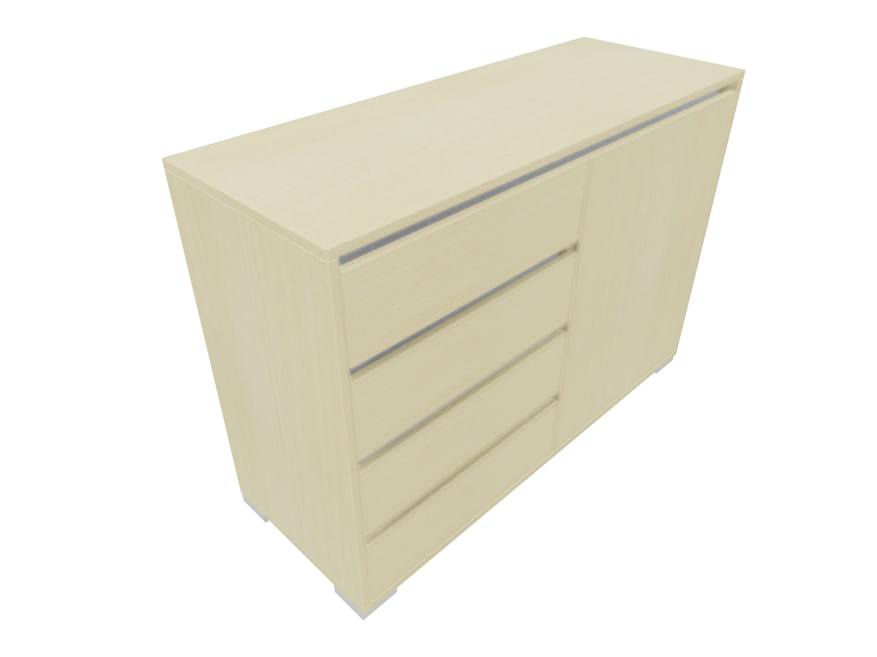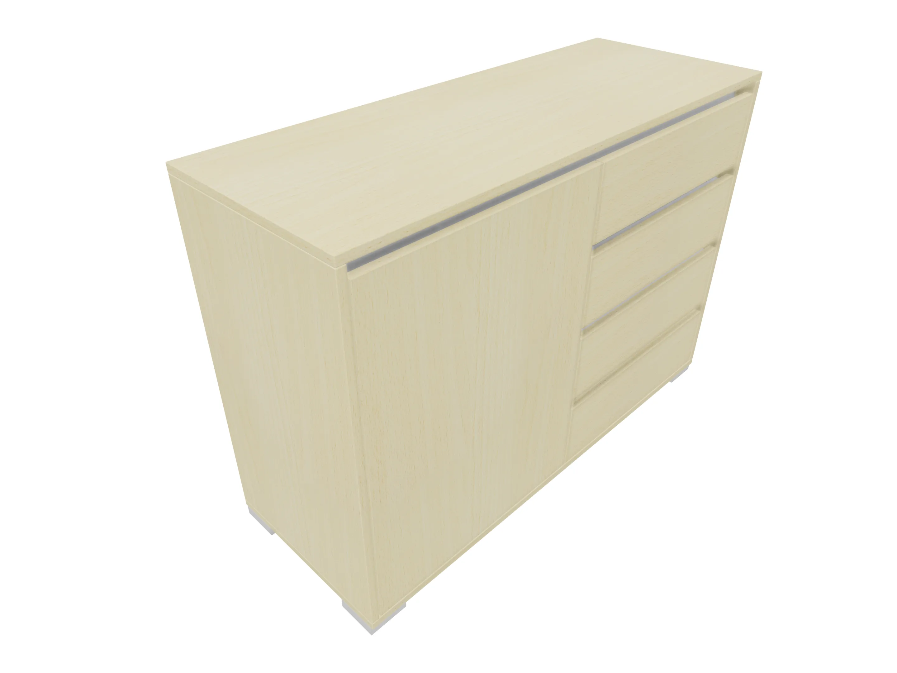Modulekast met links vier laden (4x 3HE), rechts een draaideur en 1 legbord, compleet met softclose, uittrekbeveiliging en metalen hoeksokkels. Afmeting: 1181 x 832 x 441mm (BxHxD)