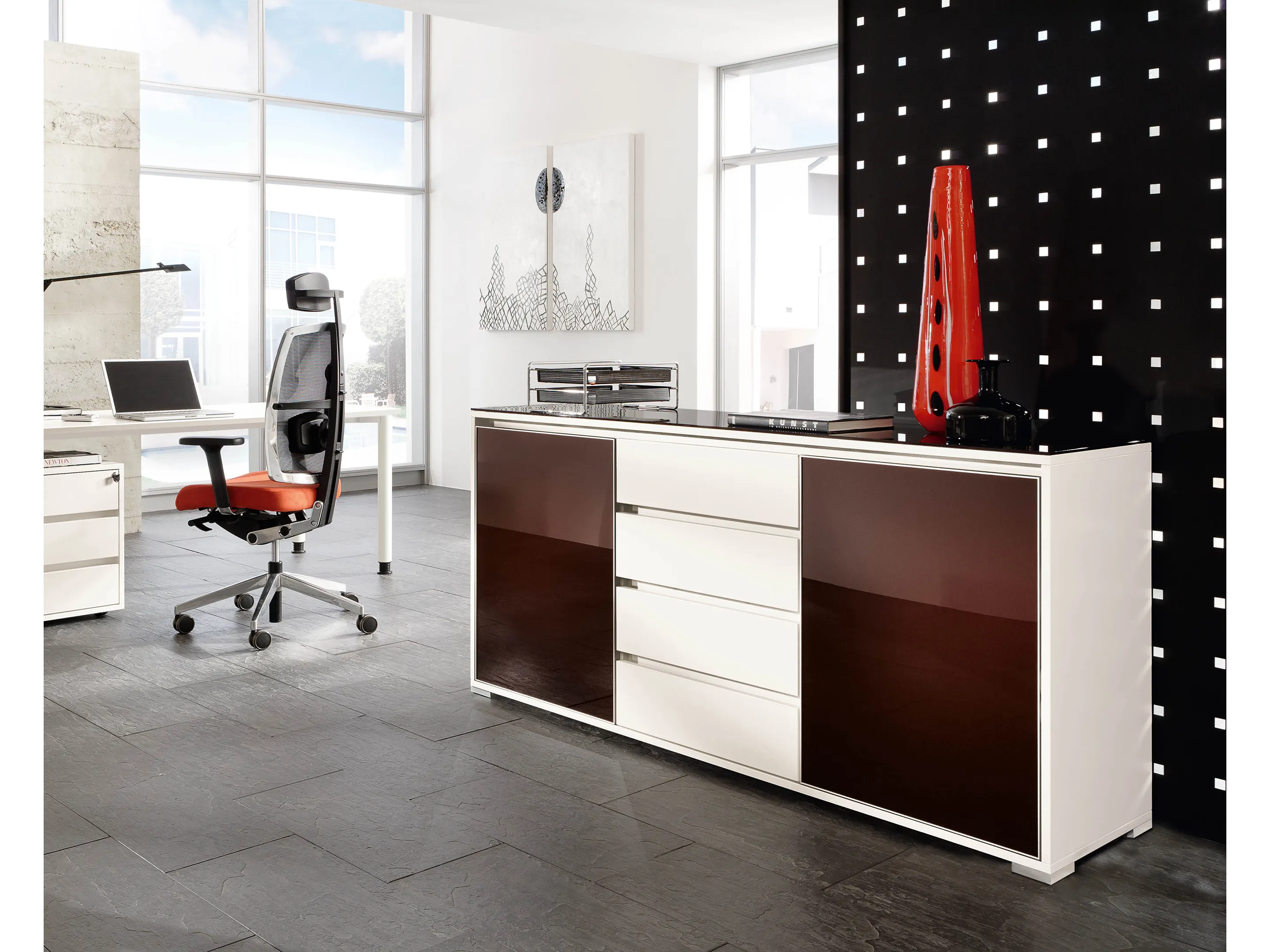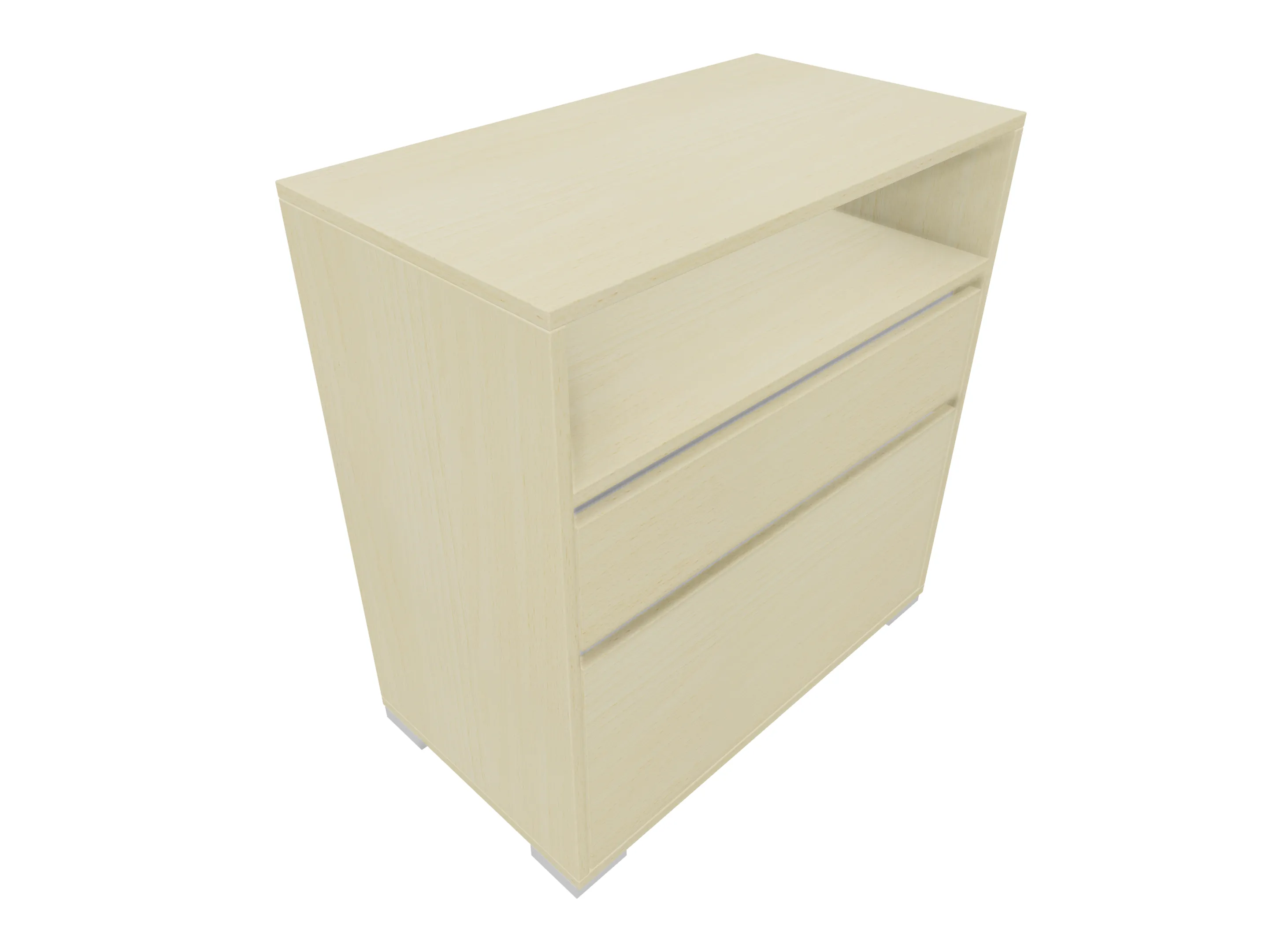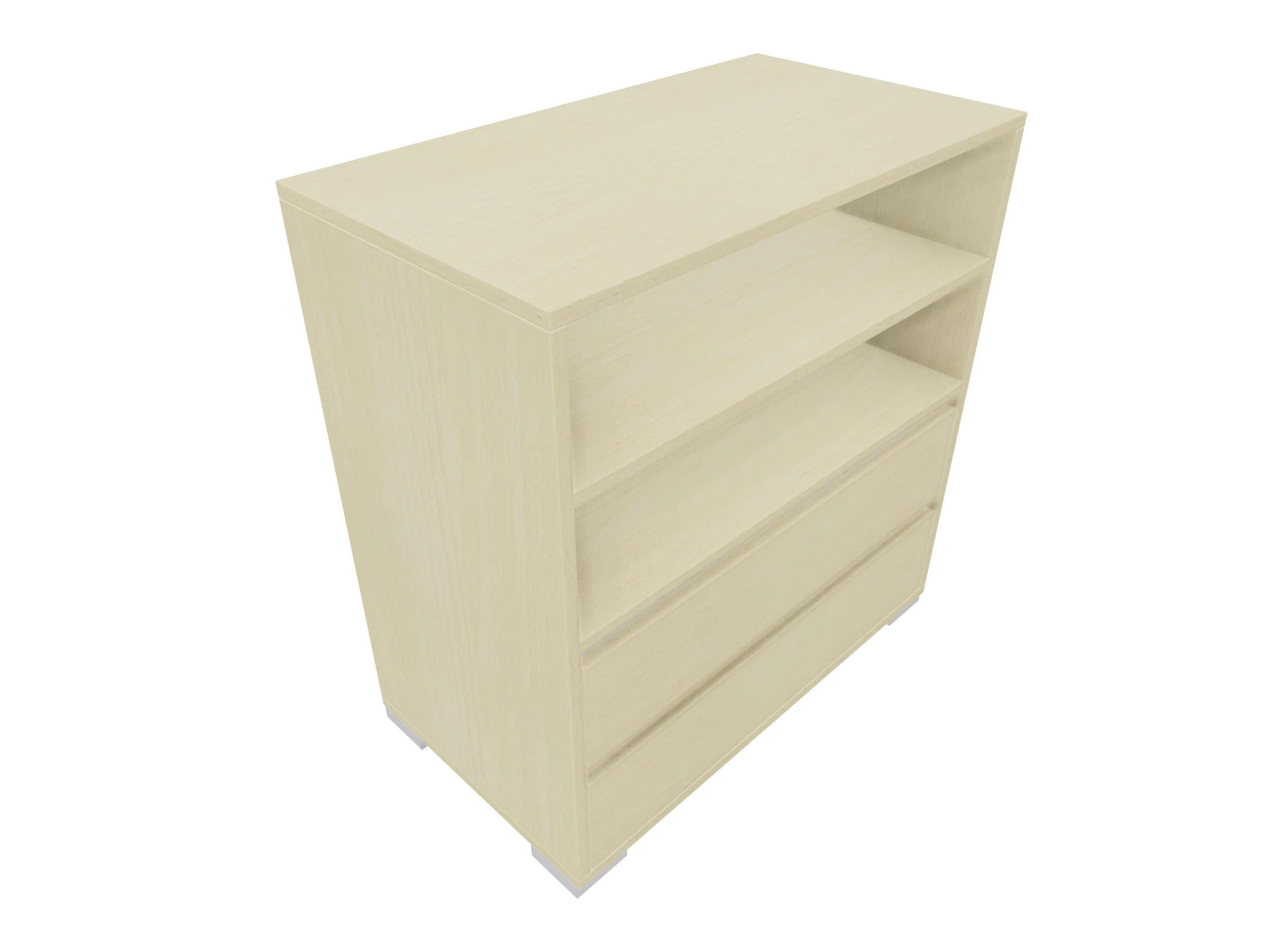 Ladenkast met twee laden (2x 3HE) en daarboven gesloten vak met draaideuren, gescheiden door en middenwand. Bruikbare hoogtes; onderste lade: 125mm, bovenste lade: 90mm, dossiergedeelte: 293mm. Op hoeksokkels. Afmeting: 800 x 832 x 441mm (BxHxD)