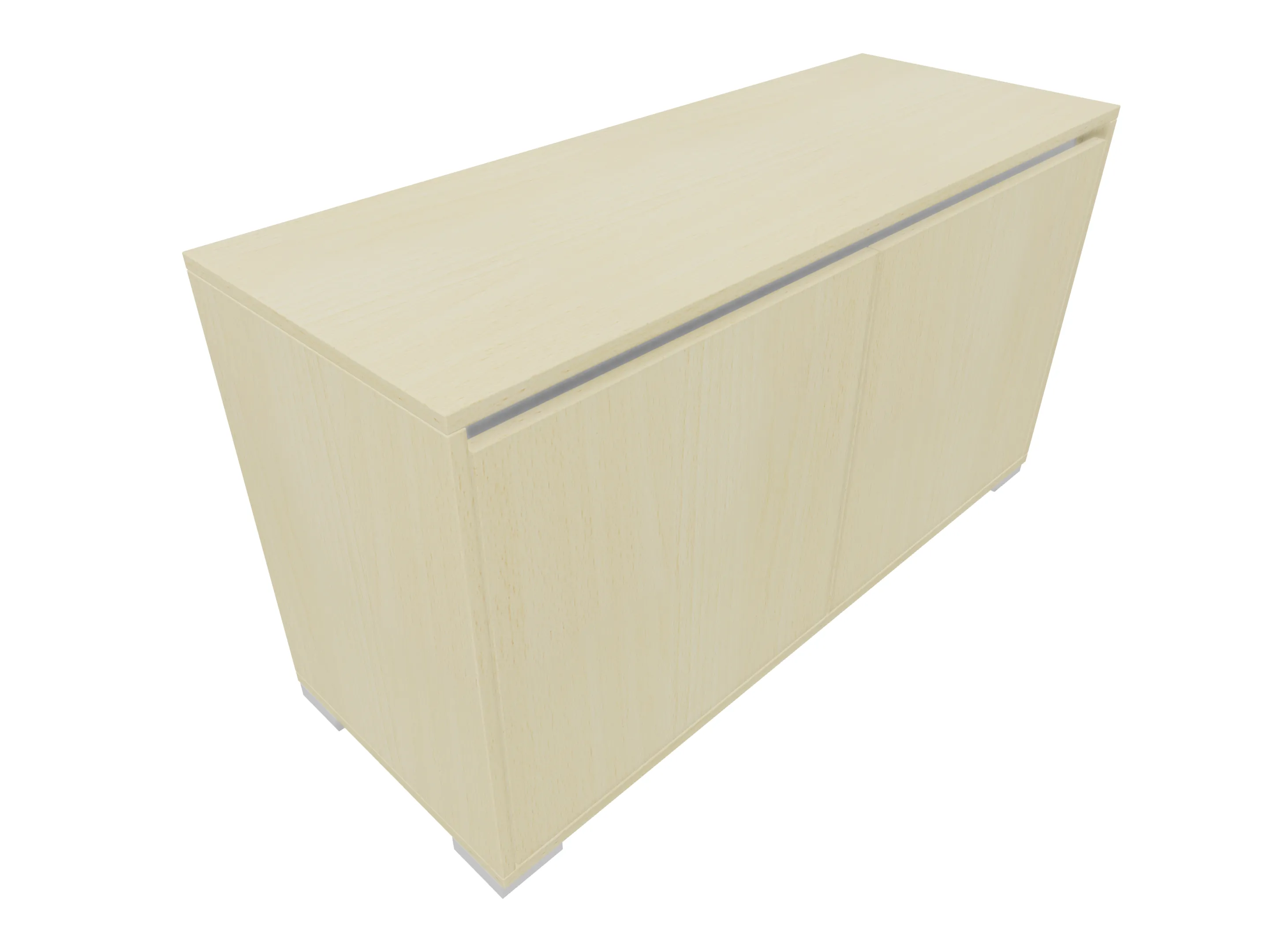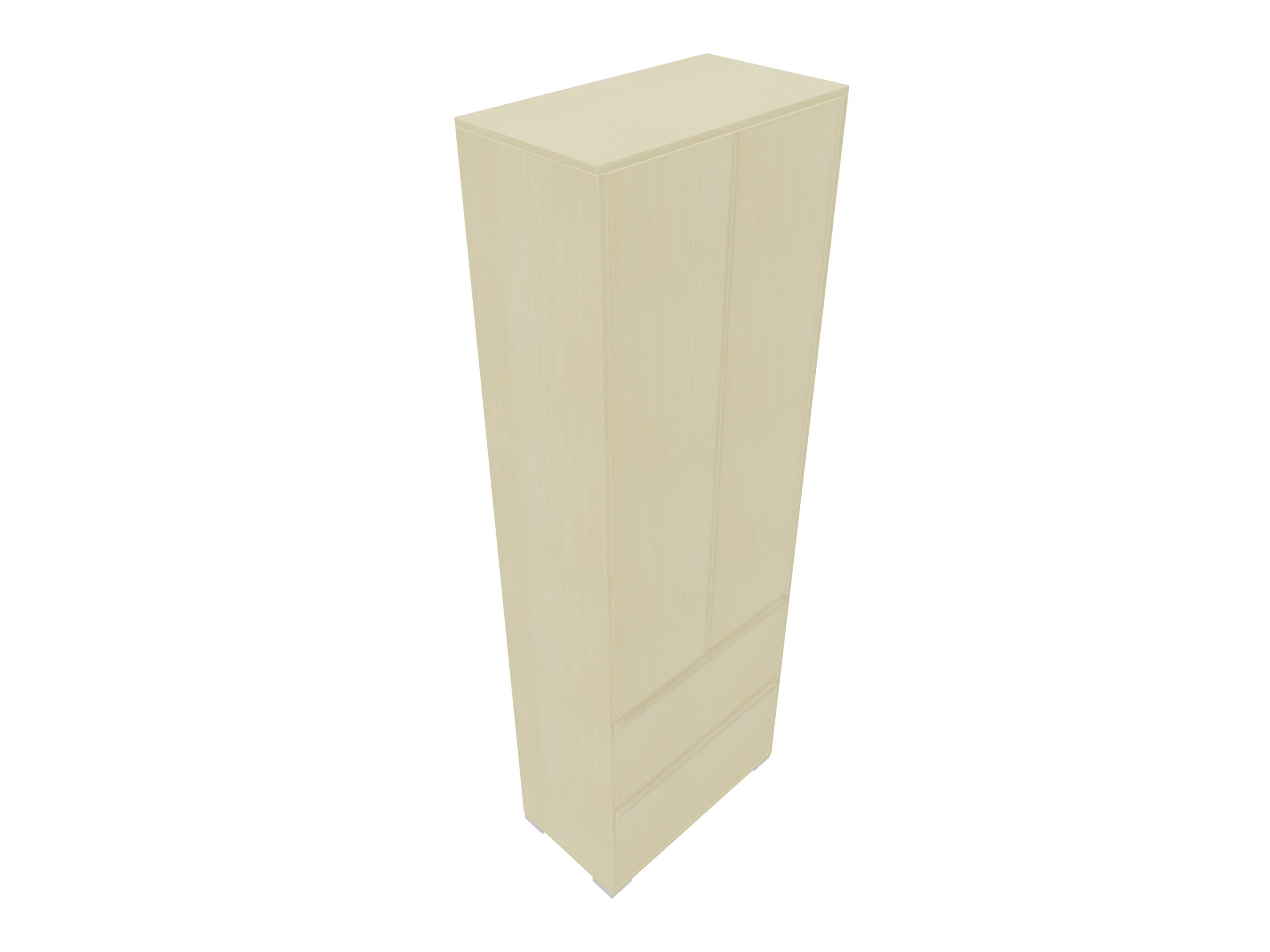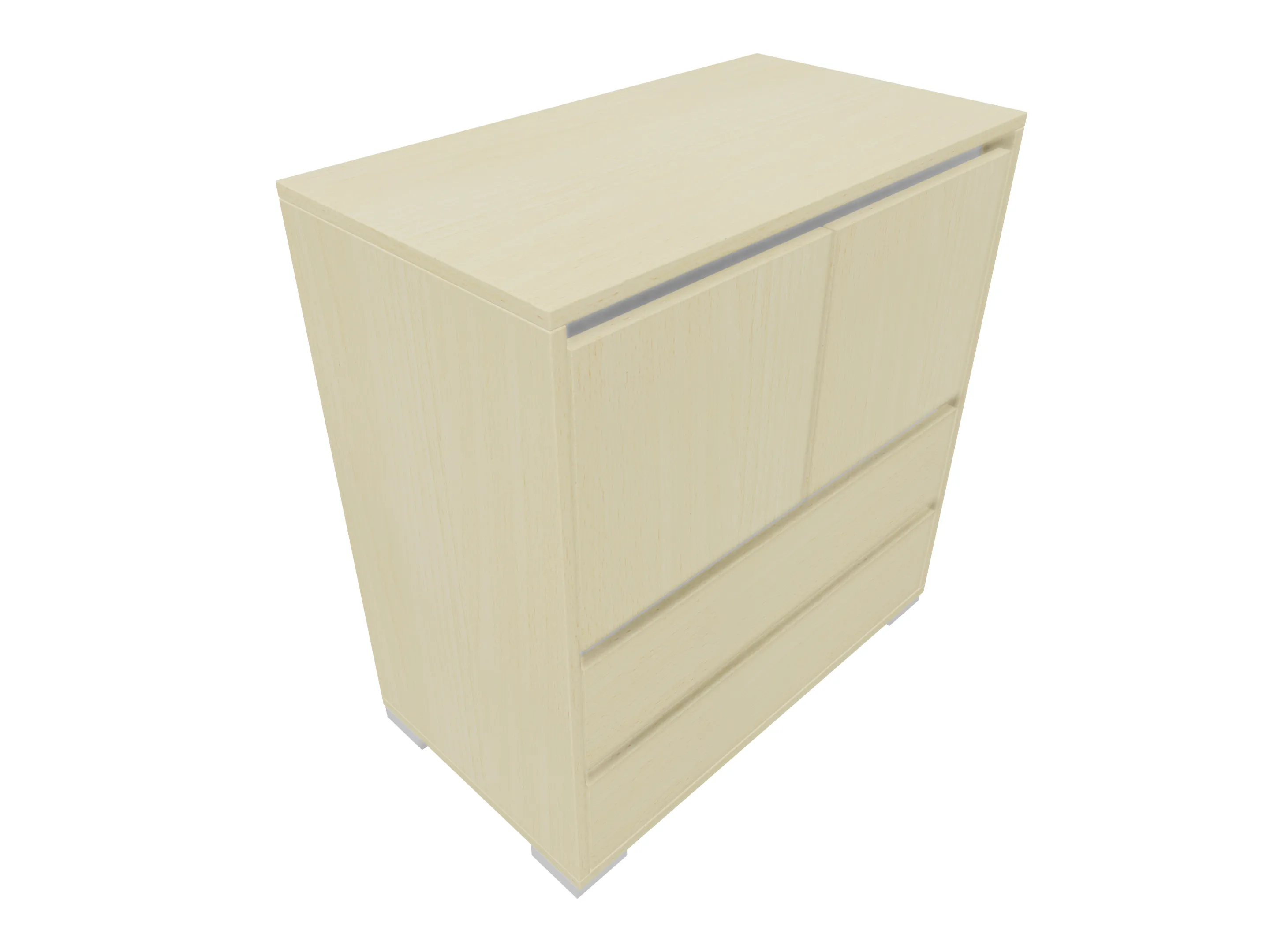 Ladenkast met twee laden (2x 3HE) en daarboven gesloten vak met draaideuren gescheiden door een middenwand. Bruikbare hoogtes; onderste lade: 125mm, bovenste lade: 90mm, dossiergedeelte: 677mm. Op hoeksokkels. Afmeting: 800 x 1216 x 441mm (BxHxD)