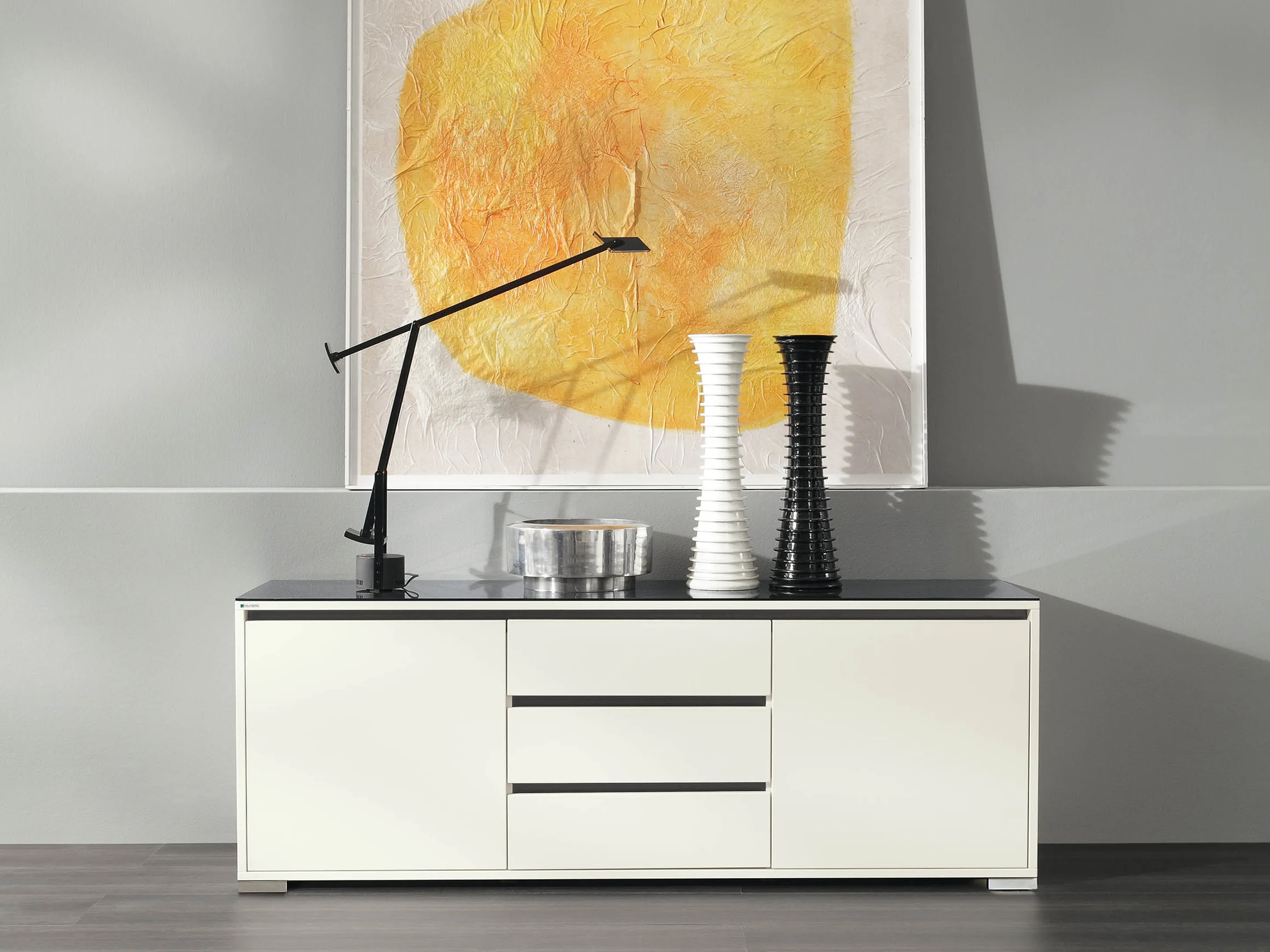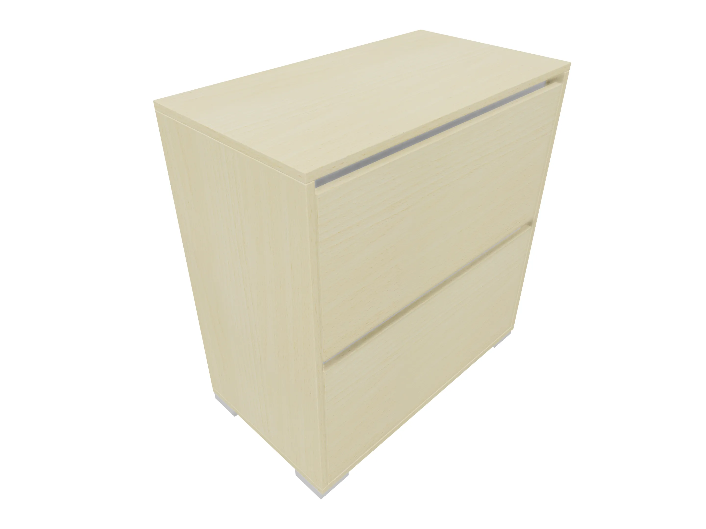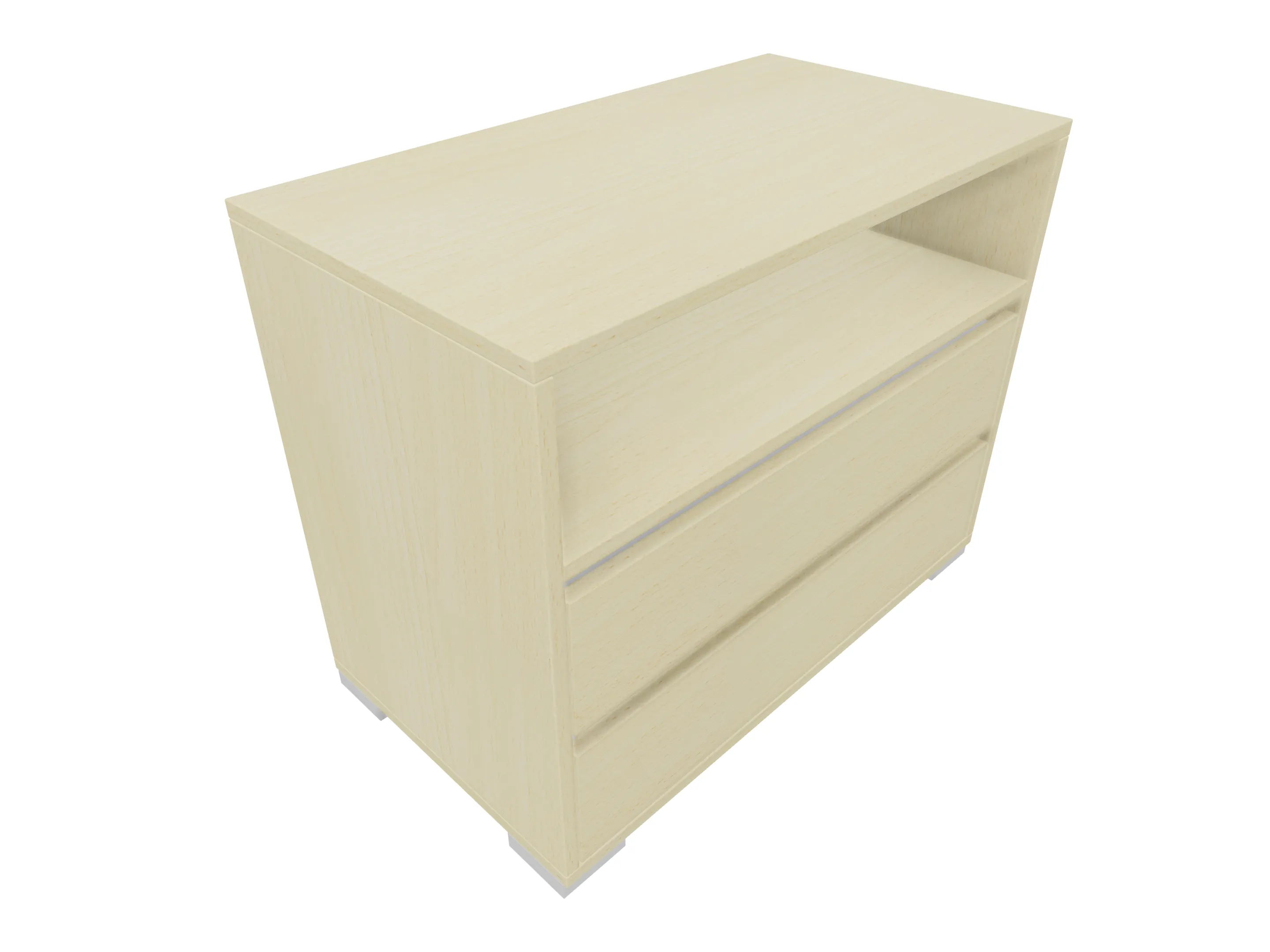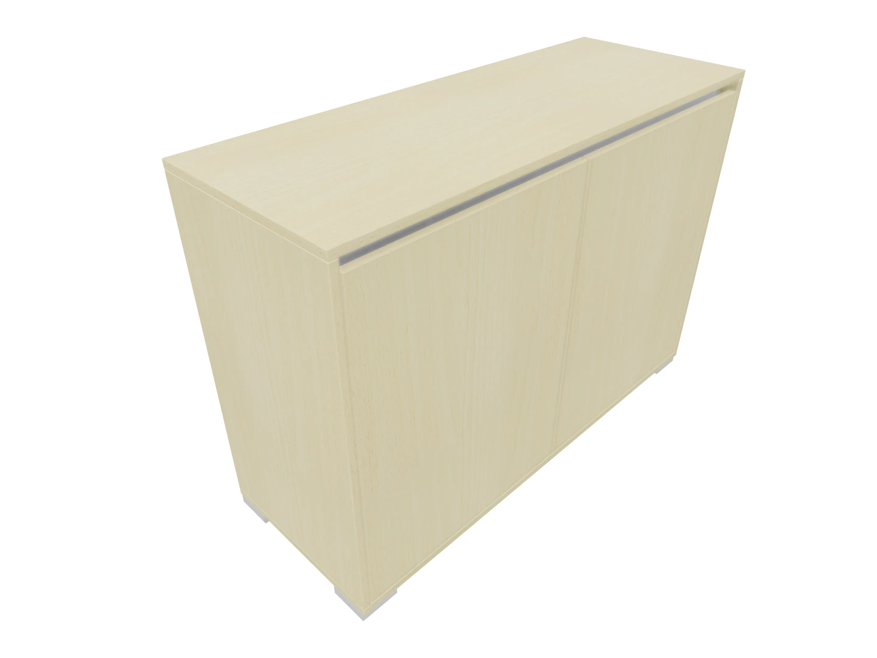 Ladenkast met twee laden (2x 3HE) en daarboven gesloten vak met draaideuren gescheiden door een middenwand. Bruikbare hoogtes; onderste lade: 125mm, bovenste lade: 90mm, dossiergedeelte: 677mm. Op hoeksokkels. Afmeting: 800 x 1216 x 441mm (BxHxD)