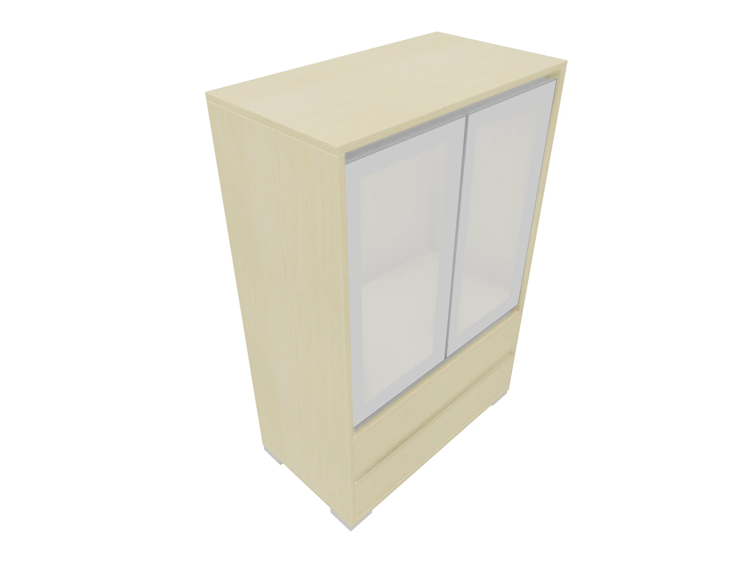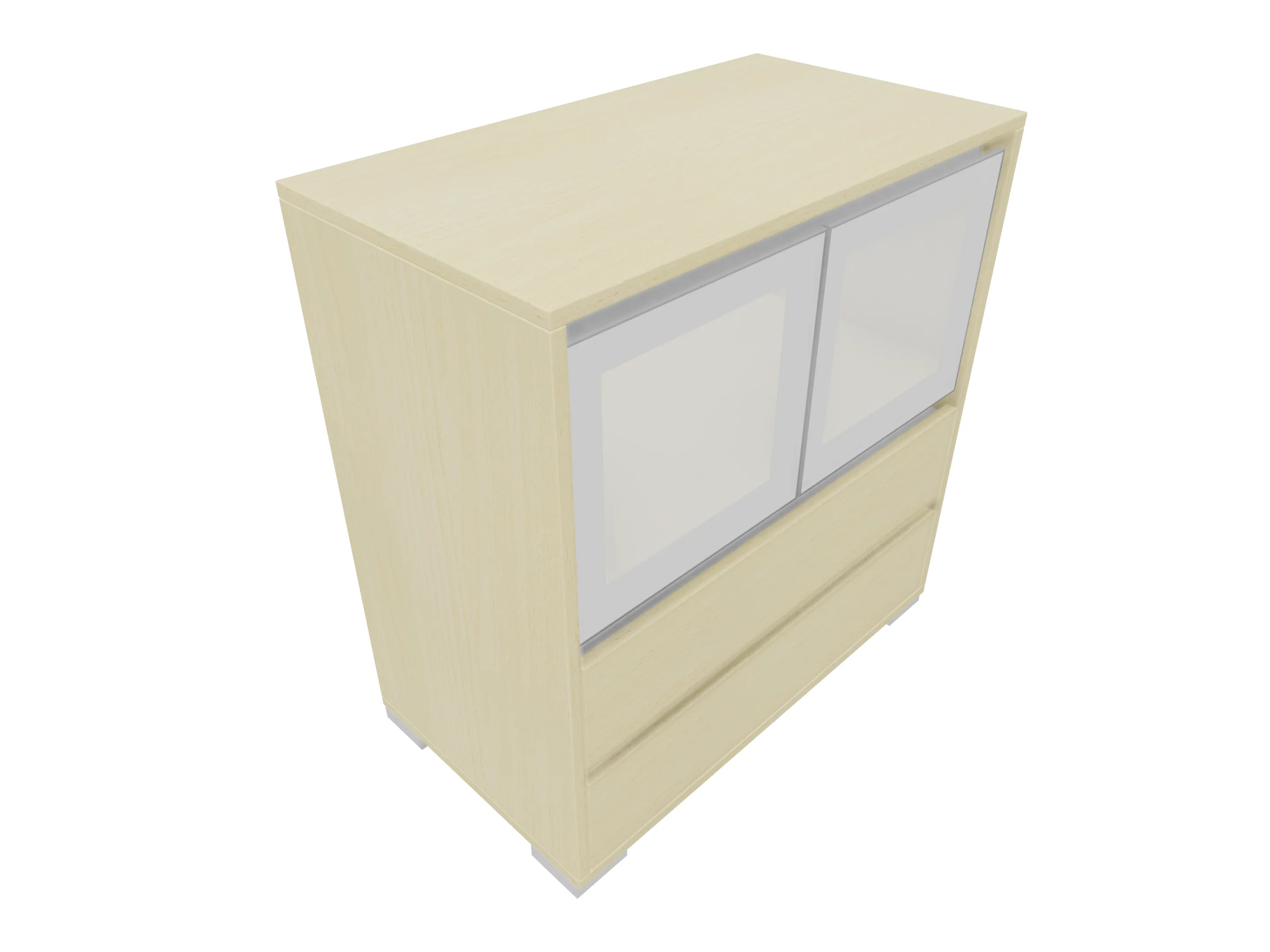 Ladenkast met twee laden (2x 3HE) en daarboven gesloten vak met glasdeuren. Bruikbare hoogtes; onderste lade: 125mm, bovenste lade: 90mm, dossiergedeelte: 677mm. Op hoeksokkels. Afmeting: 800 x 1216 x 441mm (BxHxD)