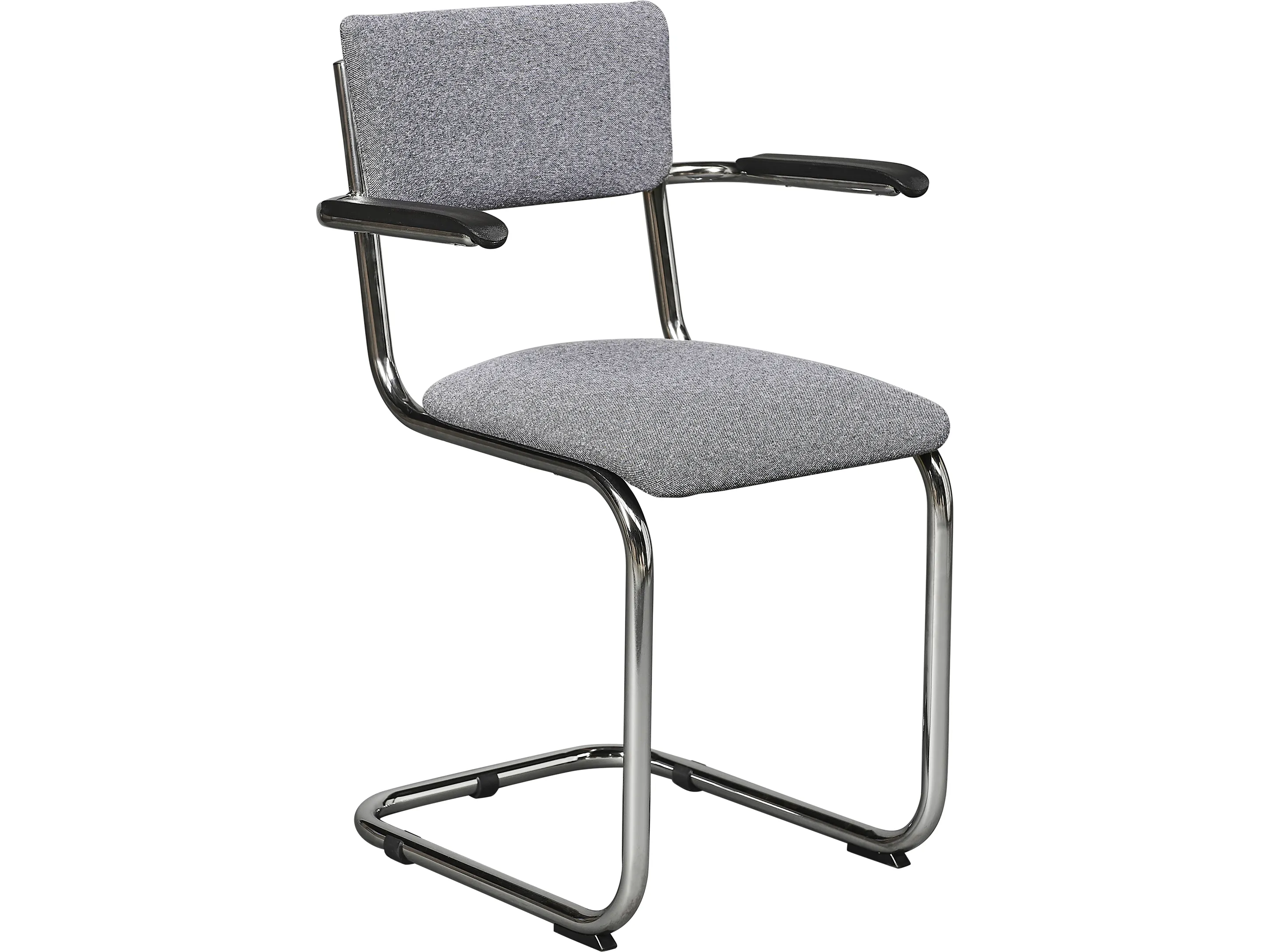 Kantinestoel met gestoffeerde zitschalen, sledeframe afgewerkt met glijdoppen in kleur zwart. Inclusief armleggers uit zwart polypropyleen.