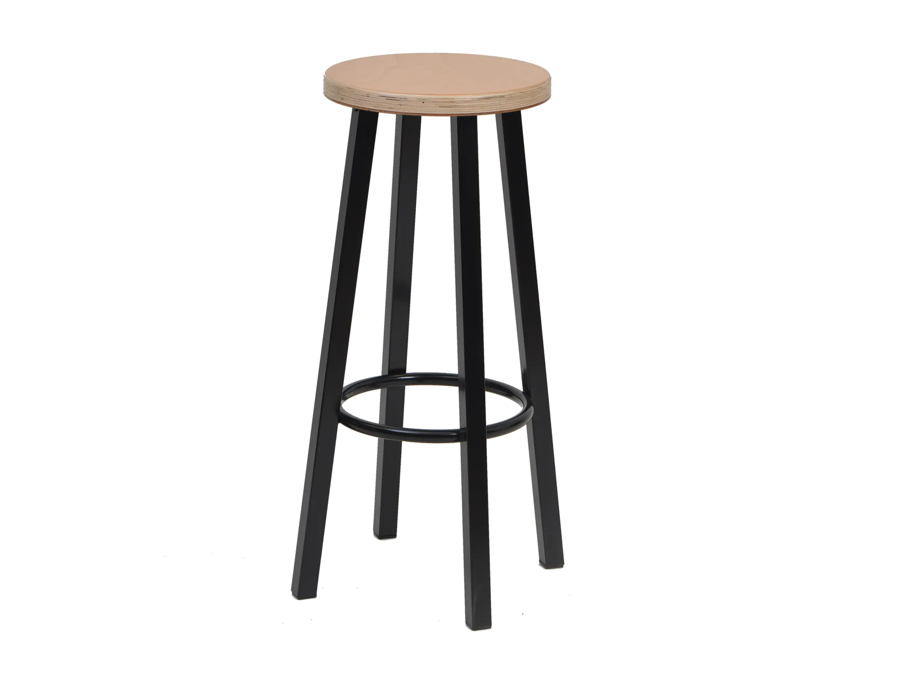 Barkruk op 4 poten (ronde buis), met voetensteun en houten zitting.