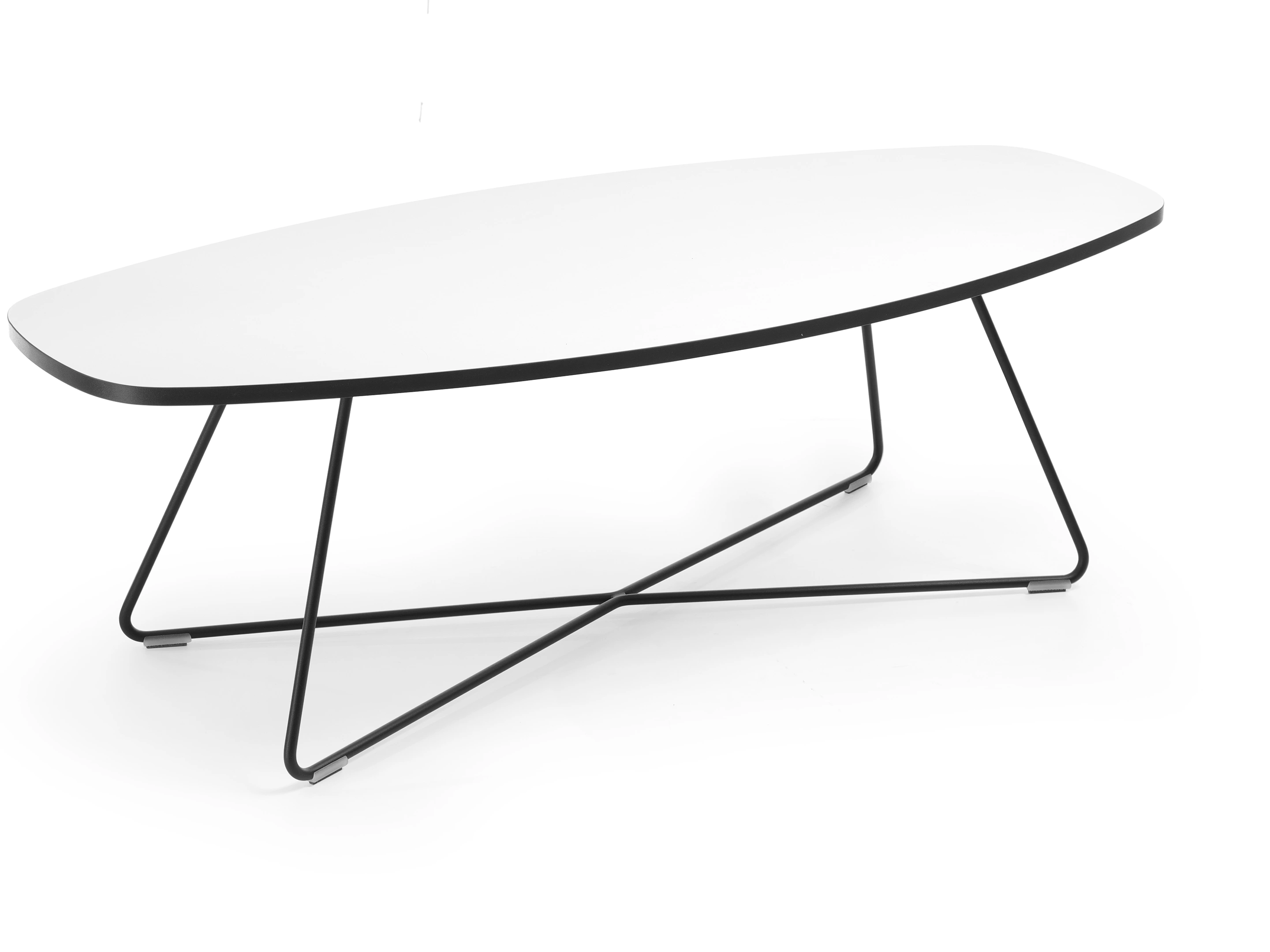 Bijzettafel met asymetrische voerhoekige melamine tafelblad van (670mmx775mm) breed en 18mm dik en een 505mm hoog kruis frame