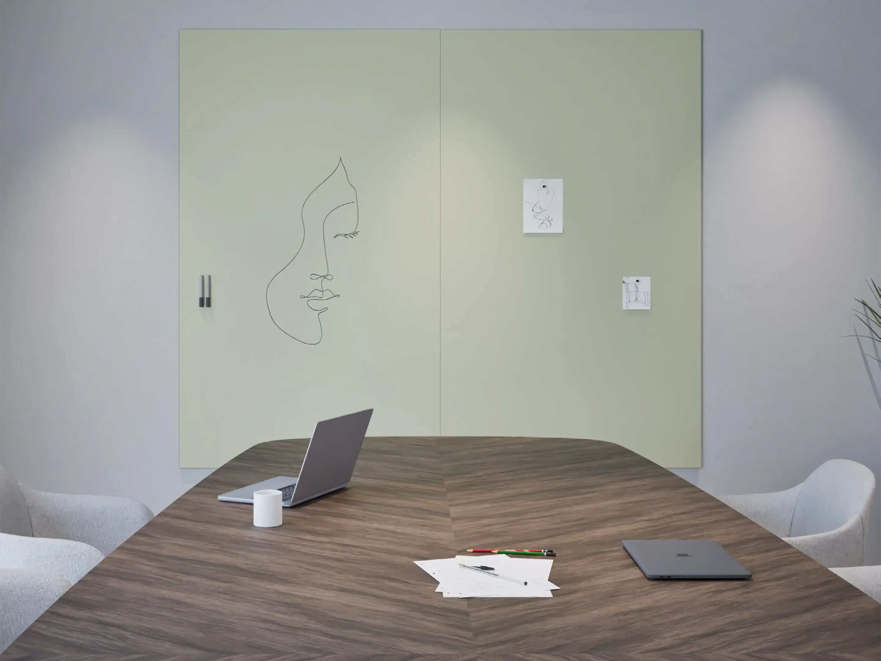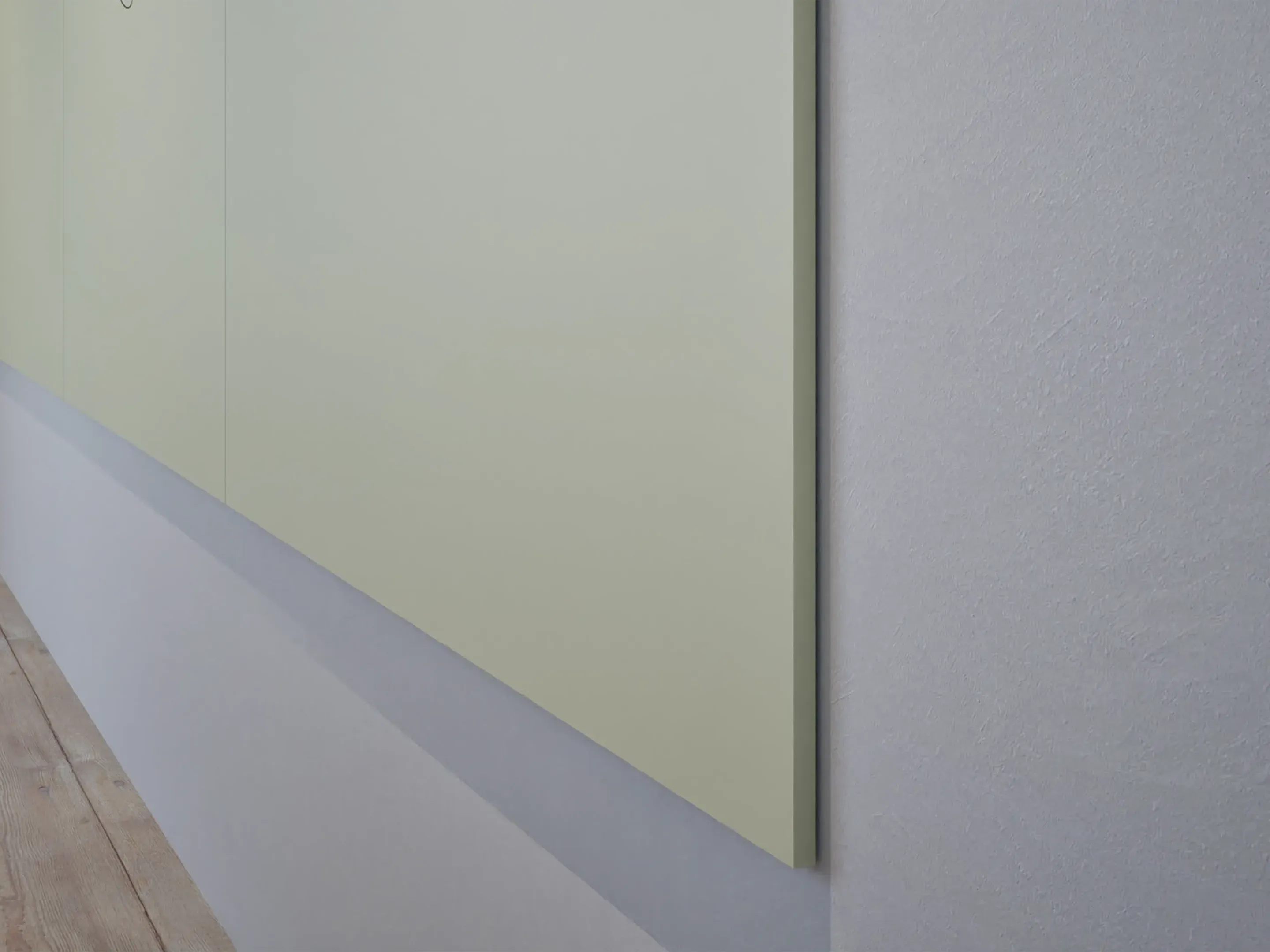Rechthoekig whiteboard bestaande uit 3 panelen met rechte hoeken zonder frame. Door de haarscherpe randafwerking sluiten de panelen nauwkeurig op elkaar aan met een minimale naad. Afmeting: 3540 x 1980mm (B x H).