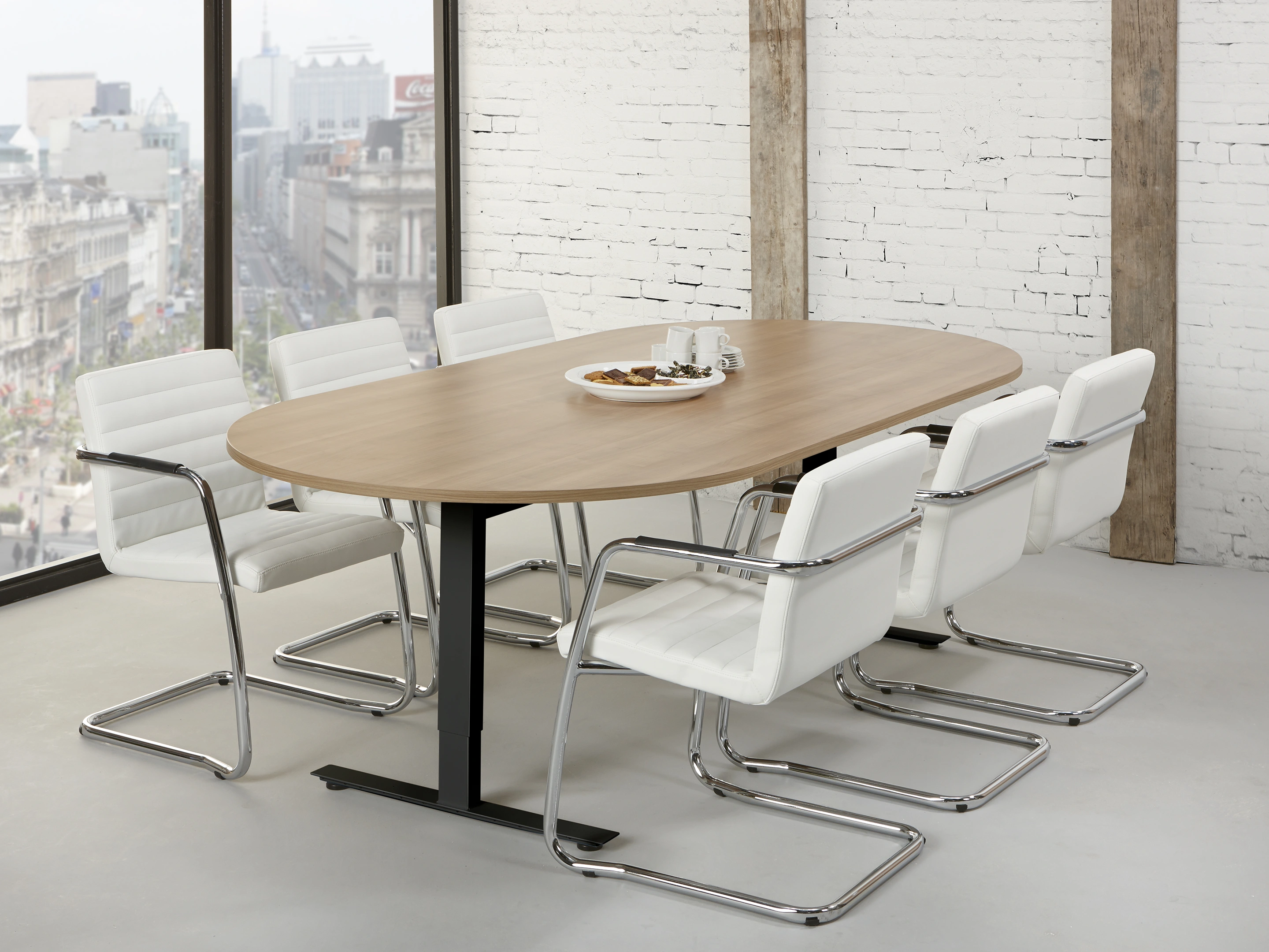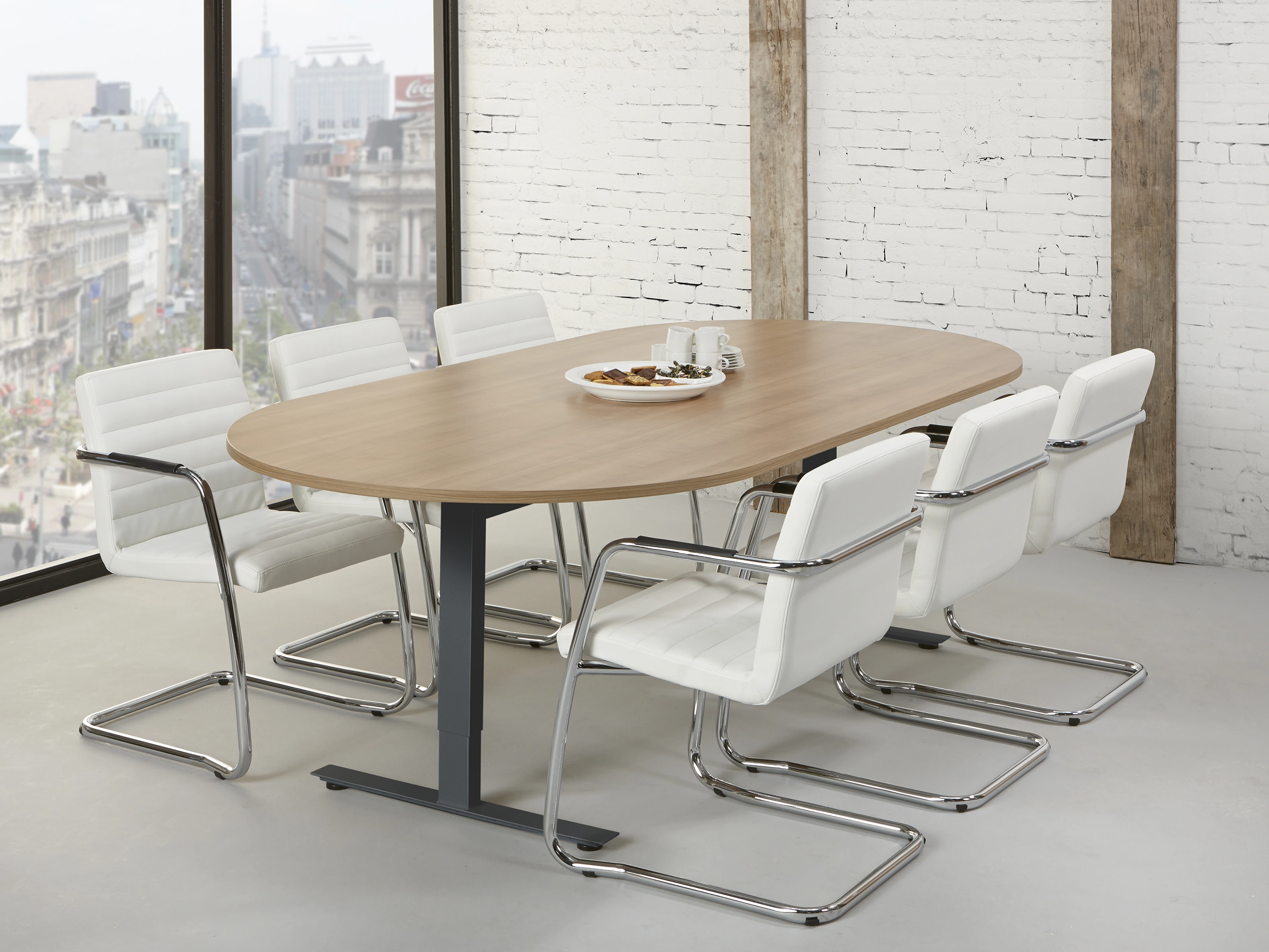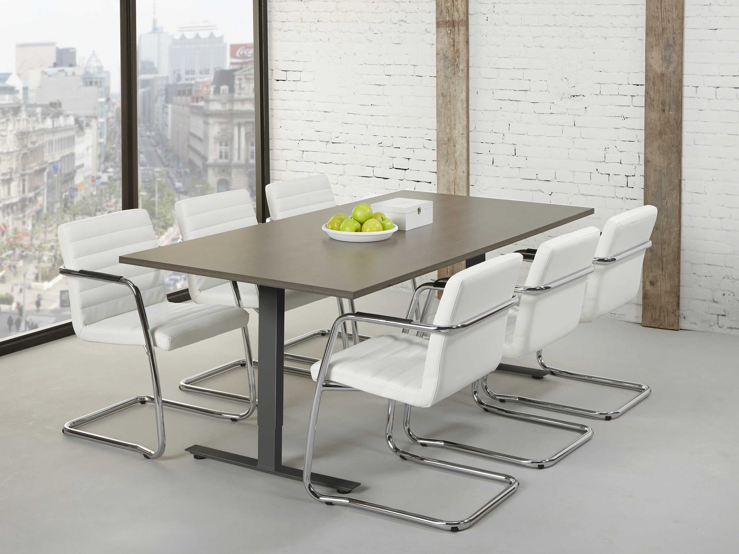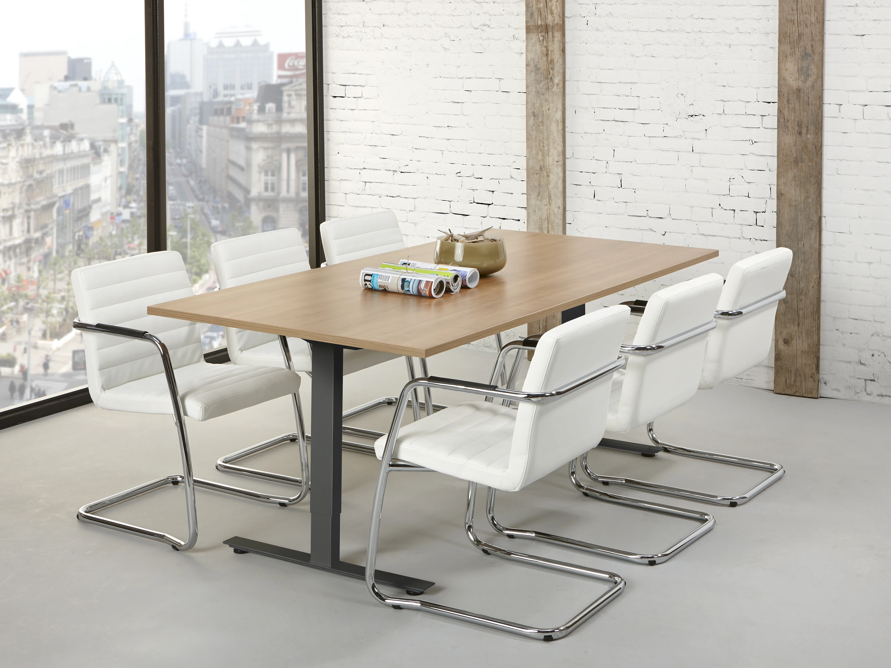 Vergadertafelframe bestaande uit 3 gebogen tenen van 90cm, in breedte verstelbaar van 200-300cm, in hoogte verstelbaar van 62,5 tot 127,5cm. 3 koloms onderstel en 3 motoren. Excl. bedieningspaneel