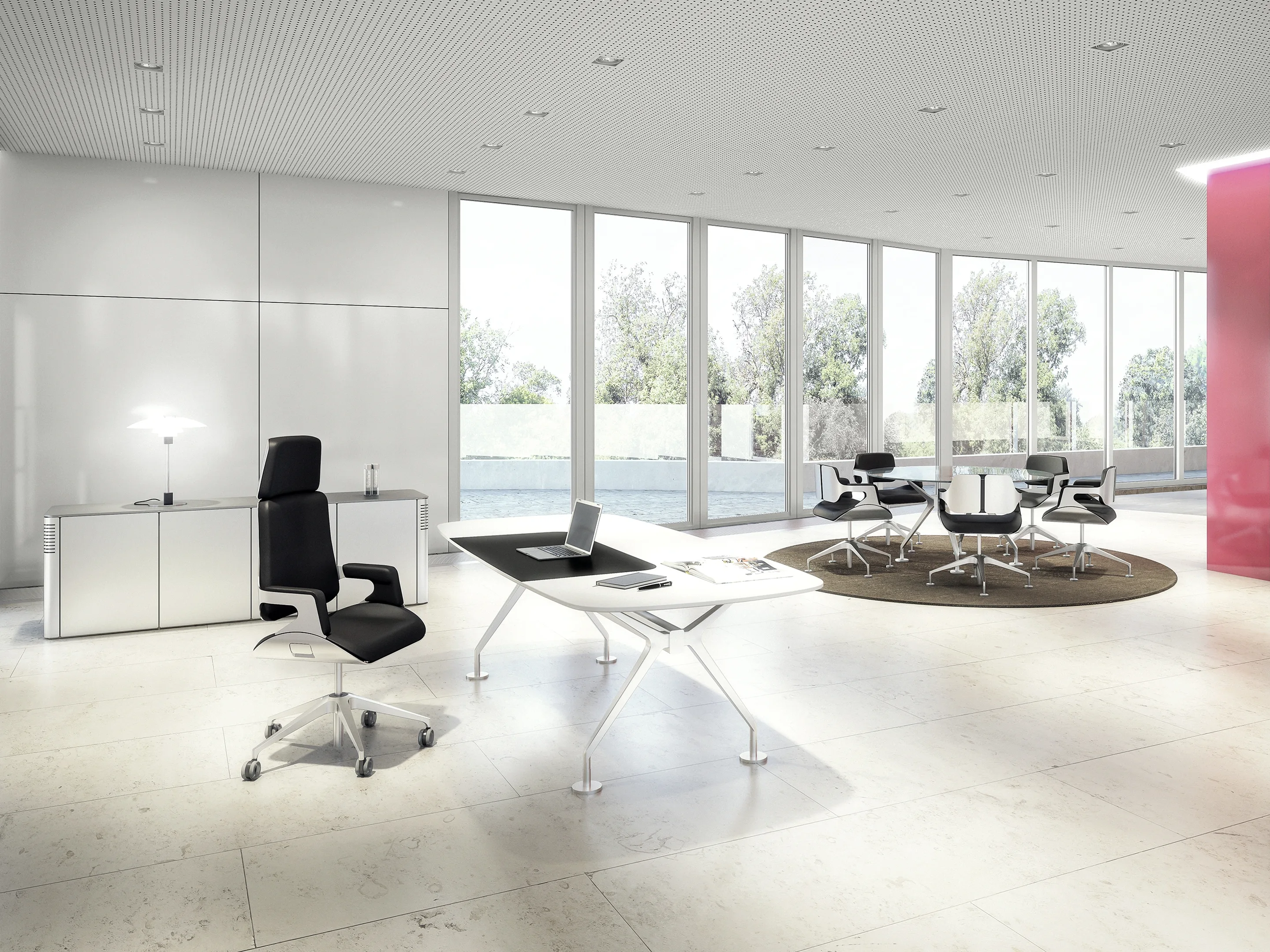 Bureaustoel incl. synchroonmechaniek (vergrendelbaar), gewichtregeling (traploos), Aluminium voetkruis (5-teens), gestoffeerde armleggers, gemonteerd in doos. Zithoogte 410-510mm. Standaard is het frame gepoedercoat.