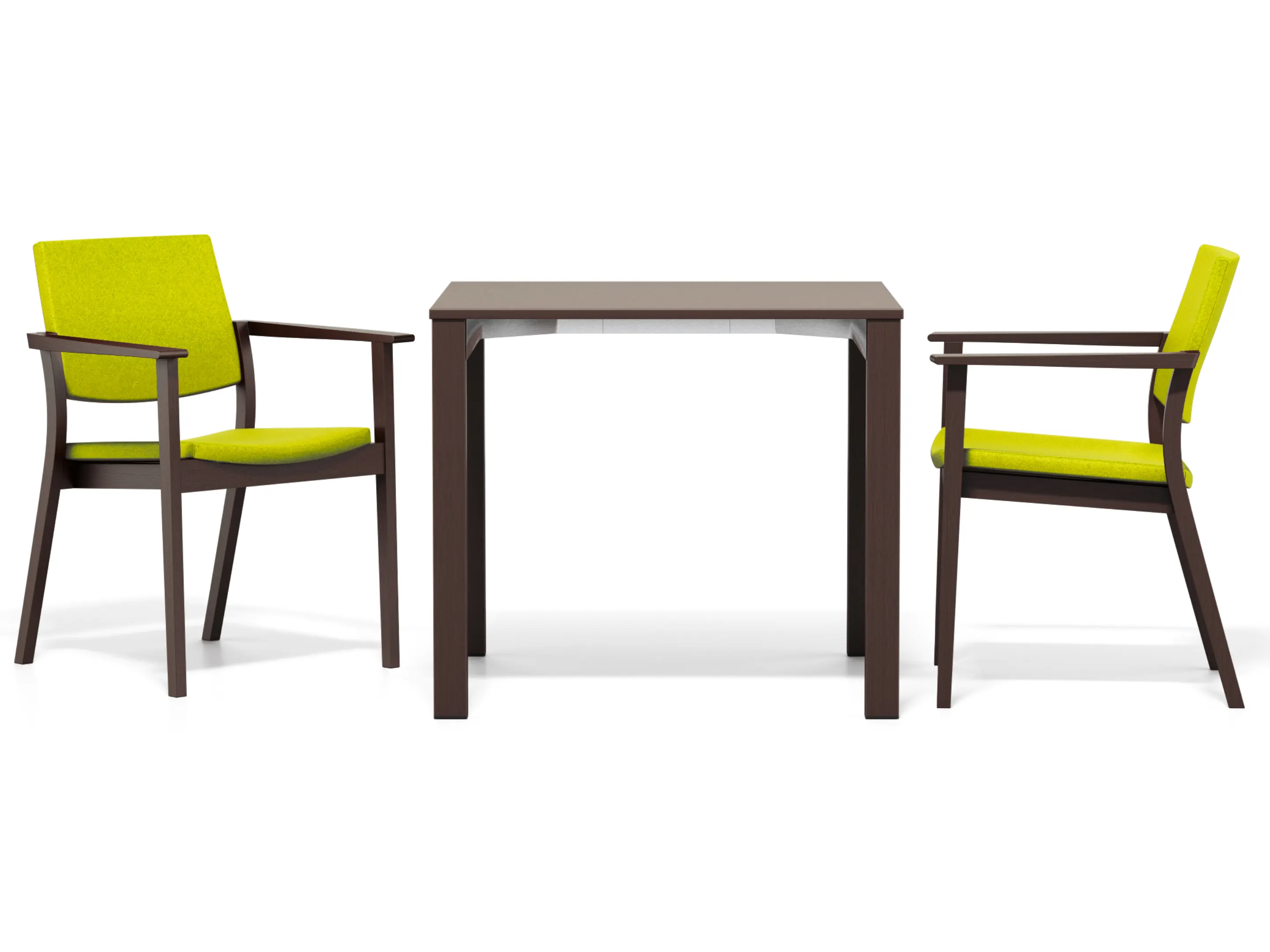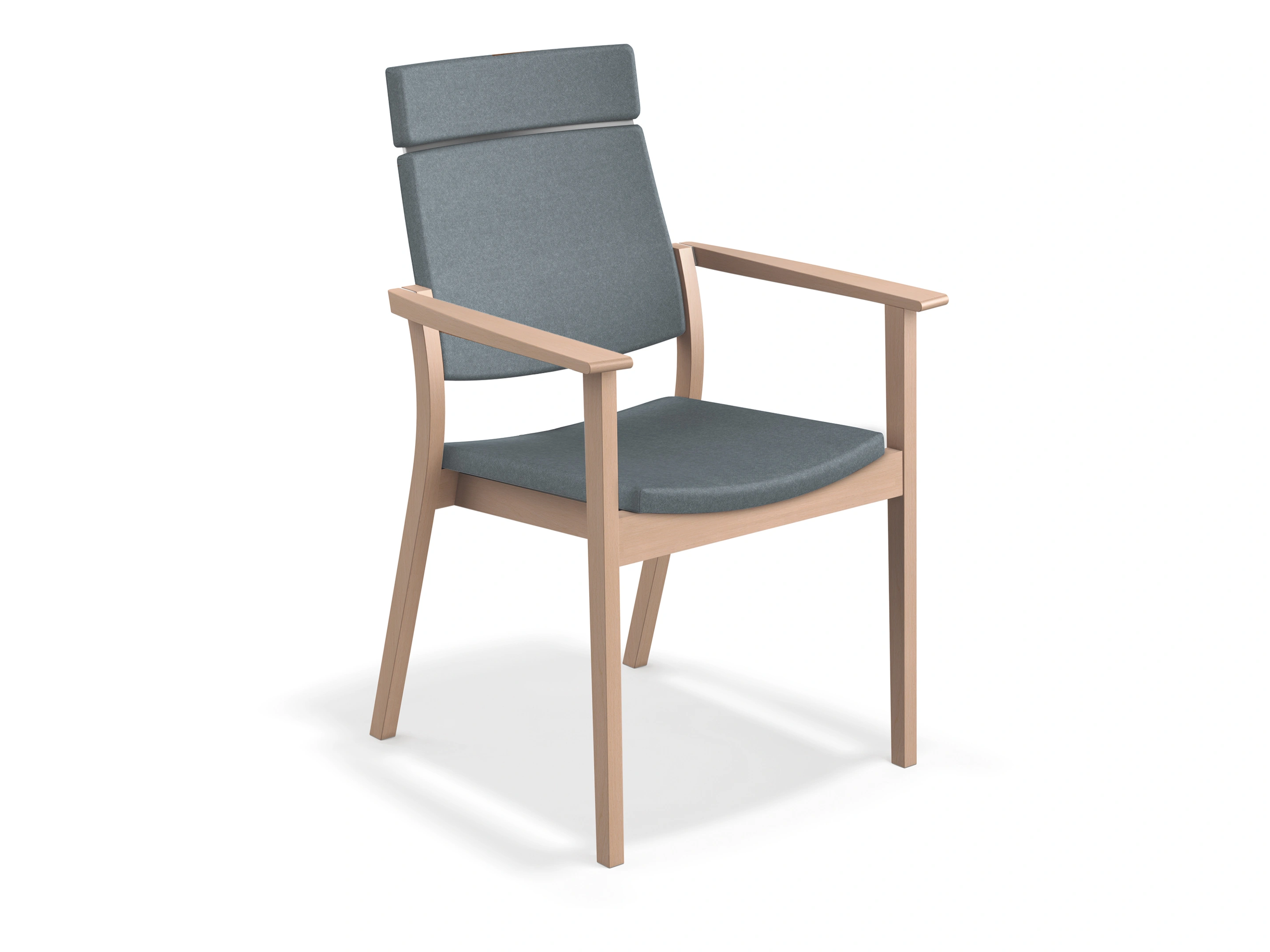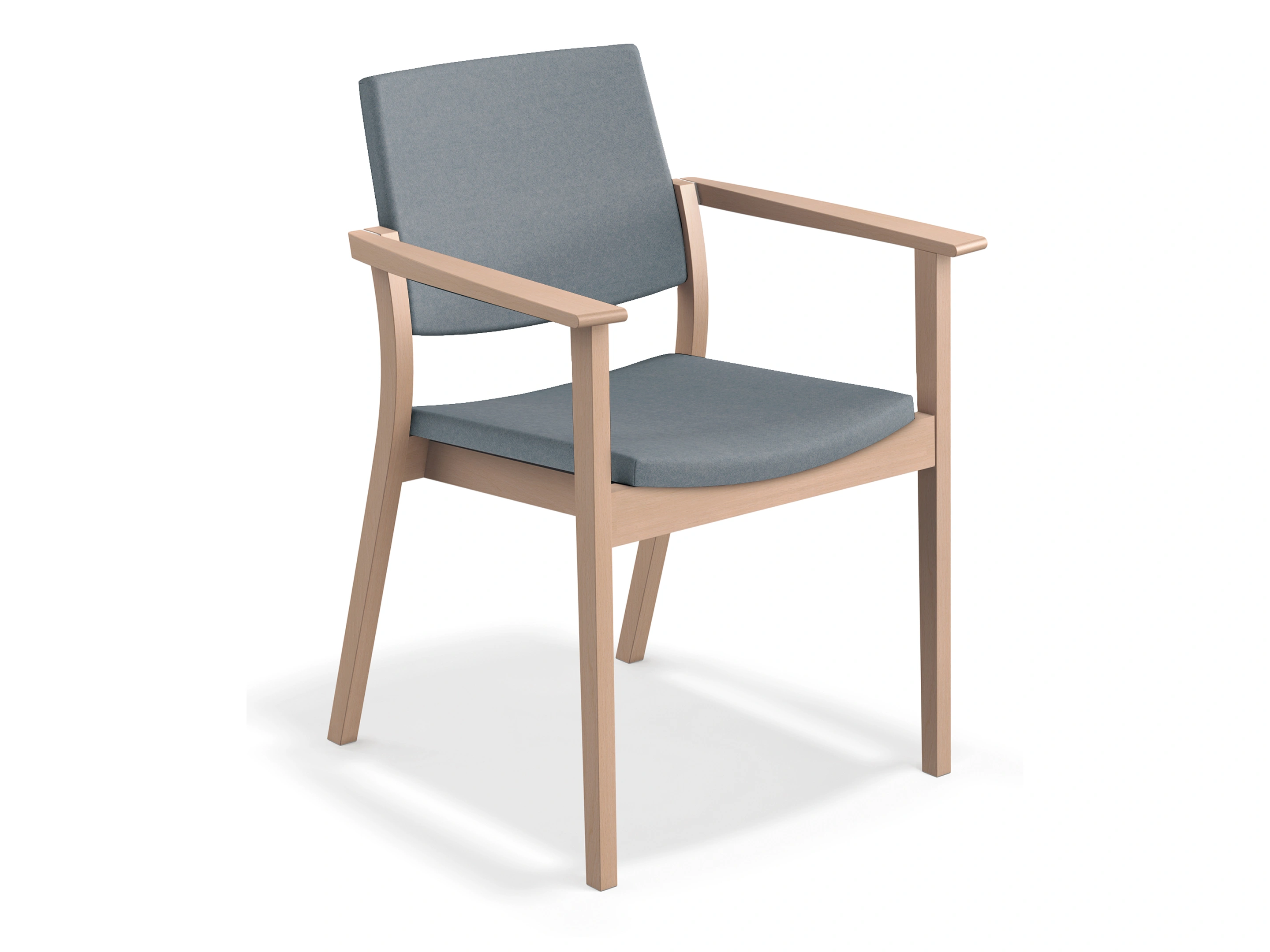 Een houten 4-poots frame met gestoffeerde zitting en rug met een hoogte van 82cm. Exclusief verende beugel. Stapelbaar tot 6 stuks.