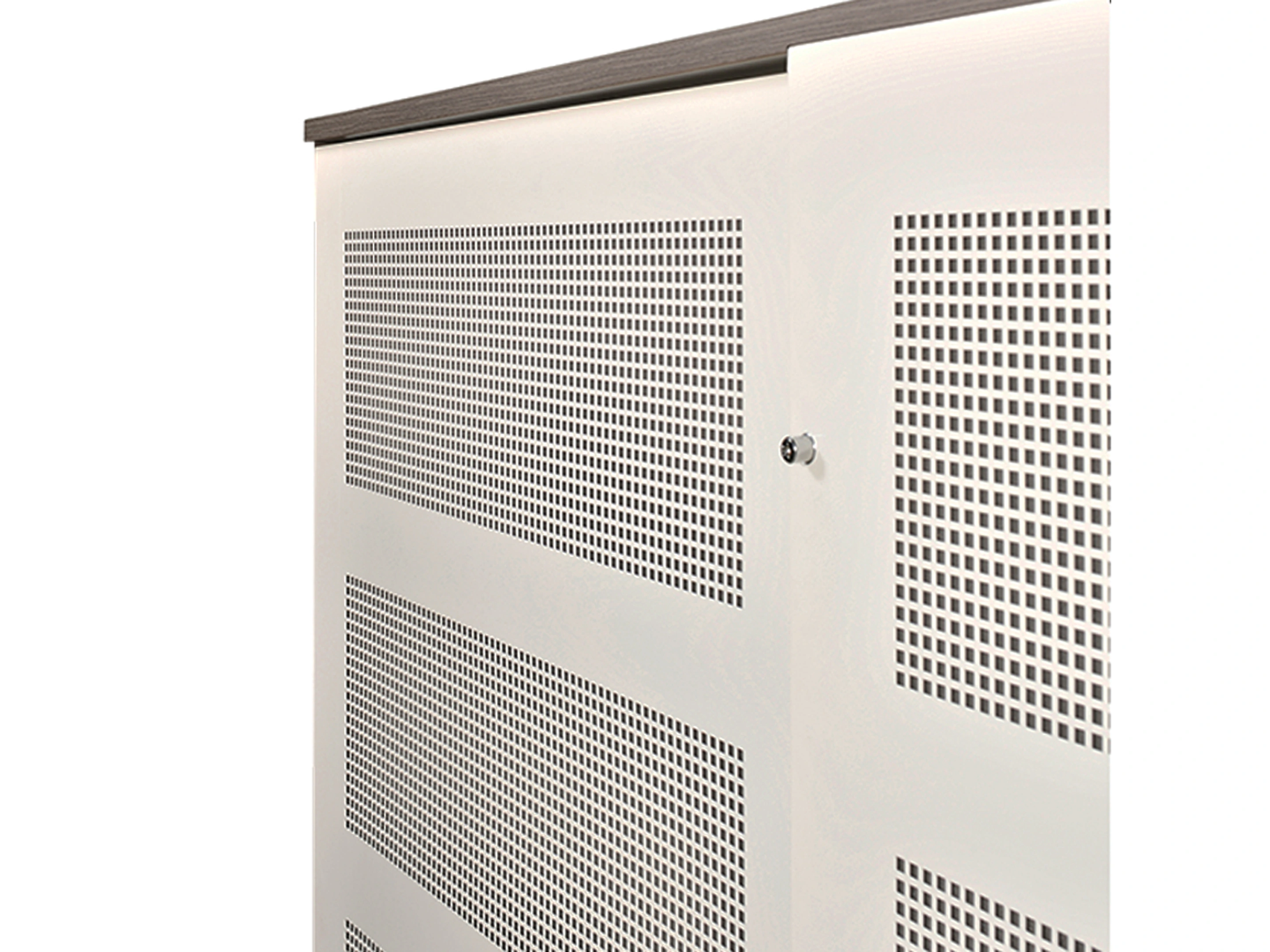 123cm hoog en 160cm breed schuifdeurkast voorzien van deuren met akoestische ECO-screen. Let op, geleverd zonder topblad, deze moet los besteld worden!