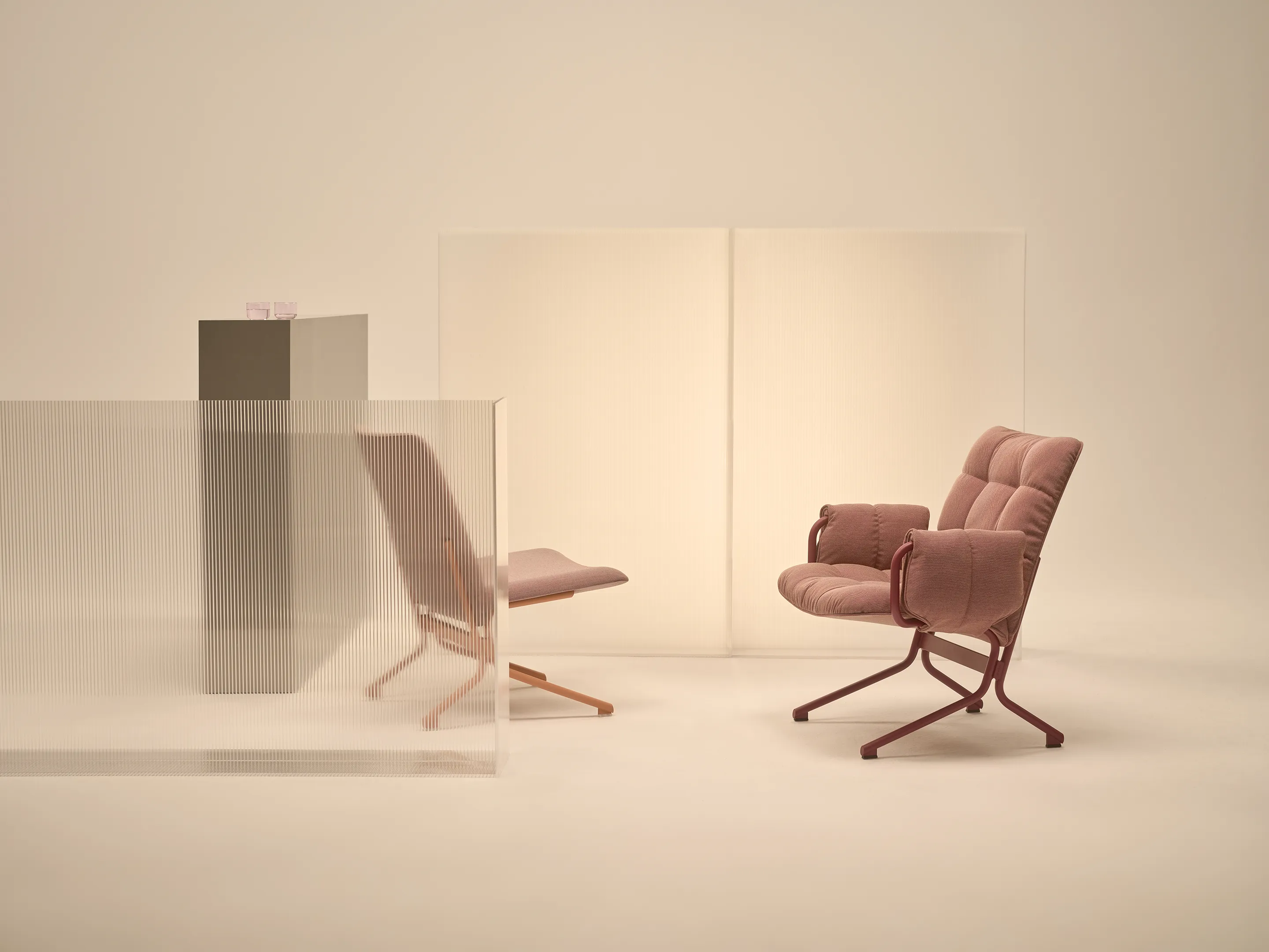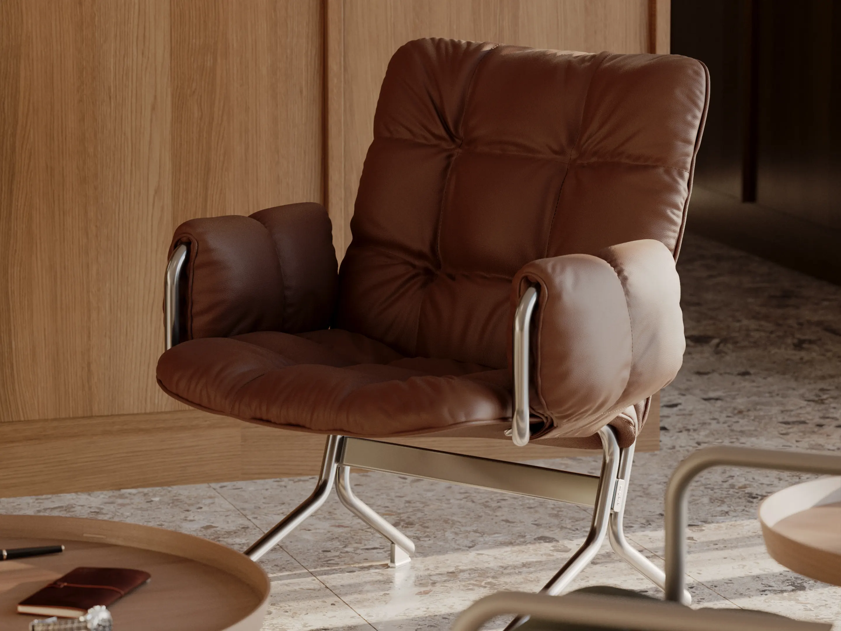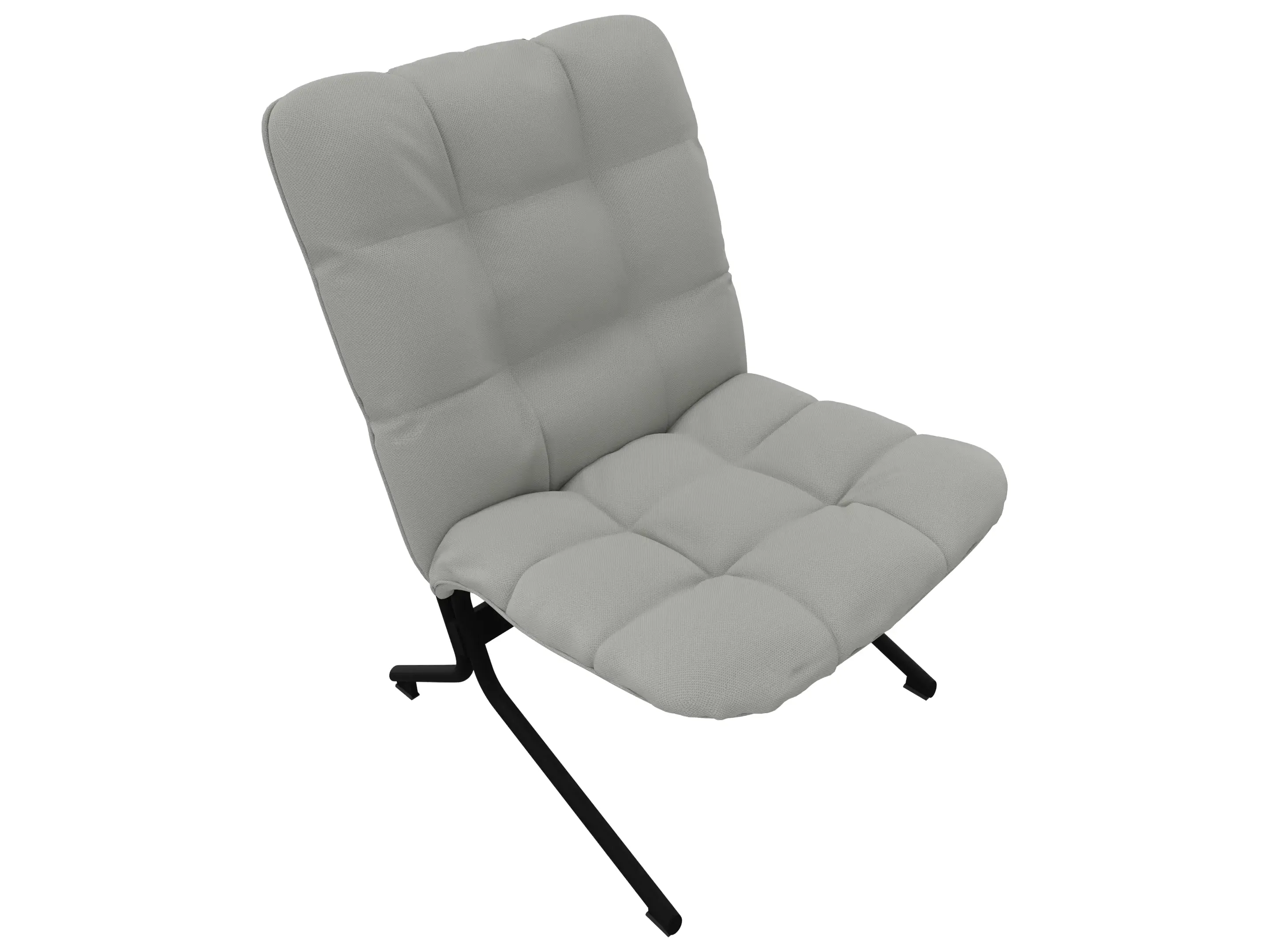 Fauteuil met gestoffeerde zitting en rug met extra vulling zonder armsteunen op een metalen 4-poots frame.