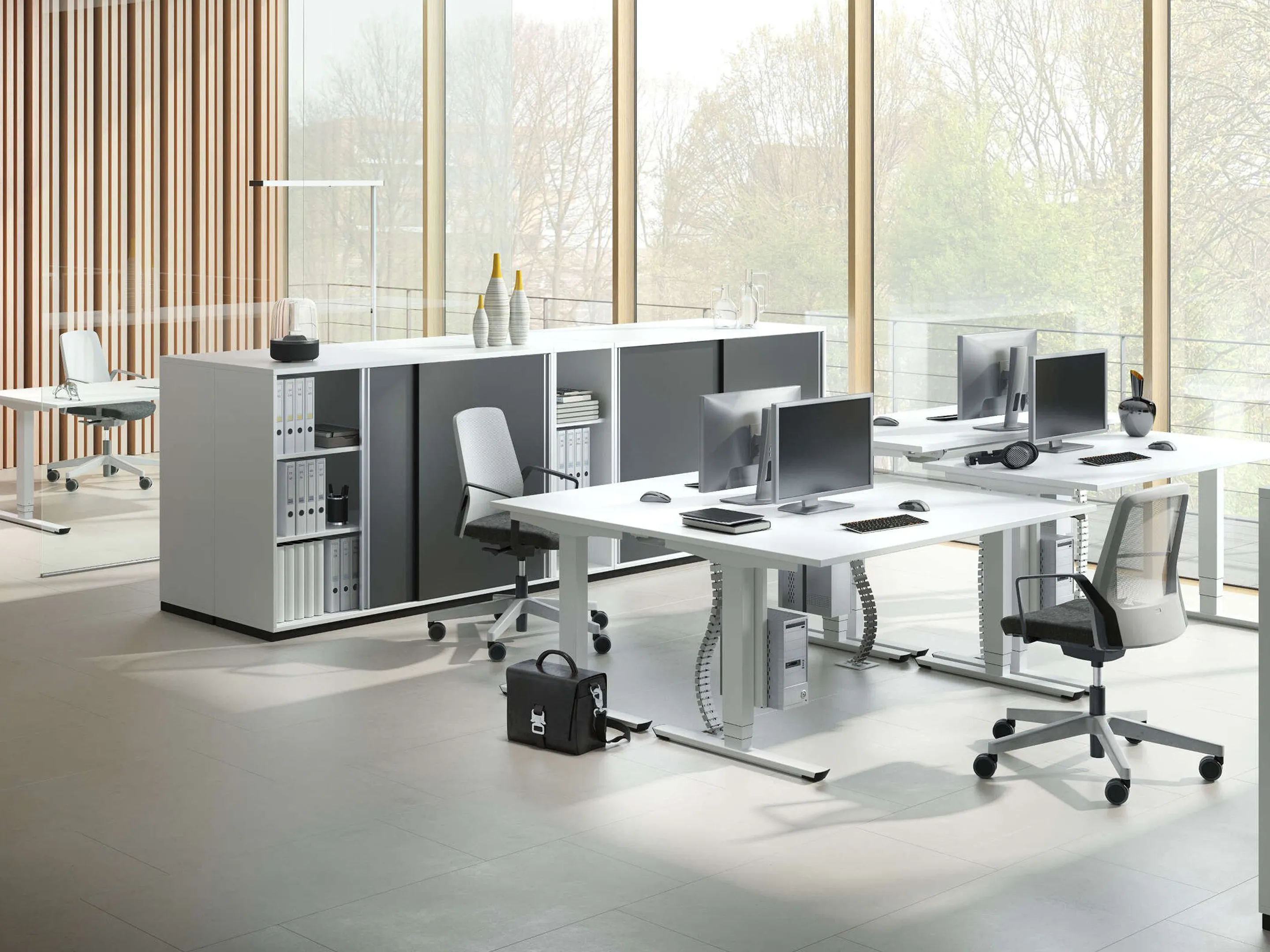 Bureau met twee poten (T-poot, elektrisch hoogte instelbaar tussen 650-1250mm d.m.v. bediening) in de afmeting: 2000 x 900mm (BxD)
