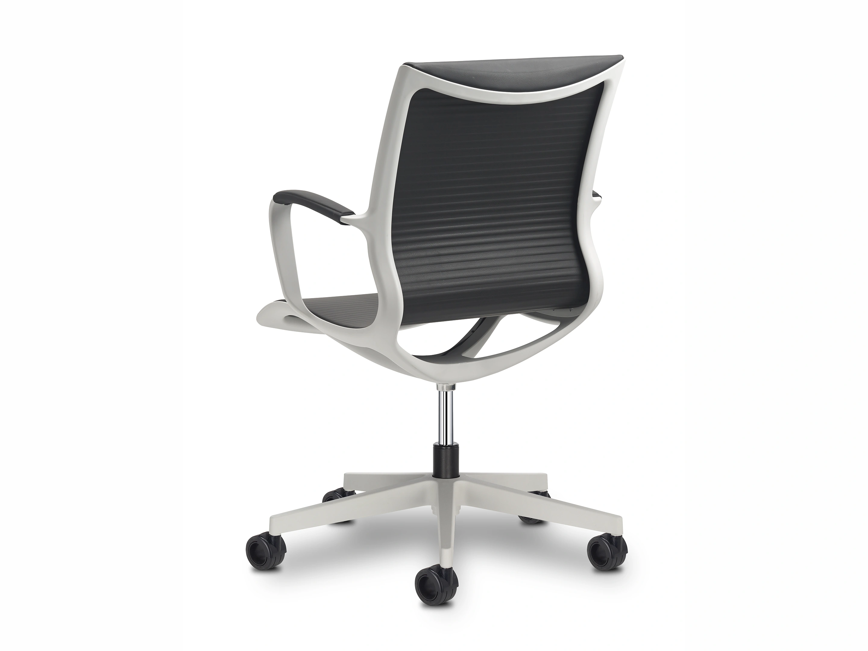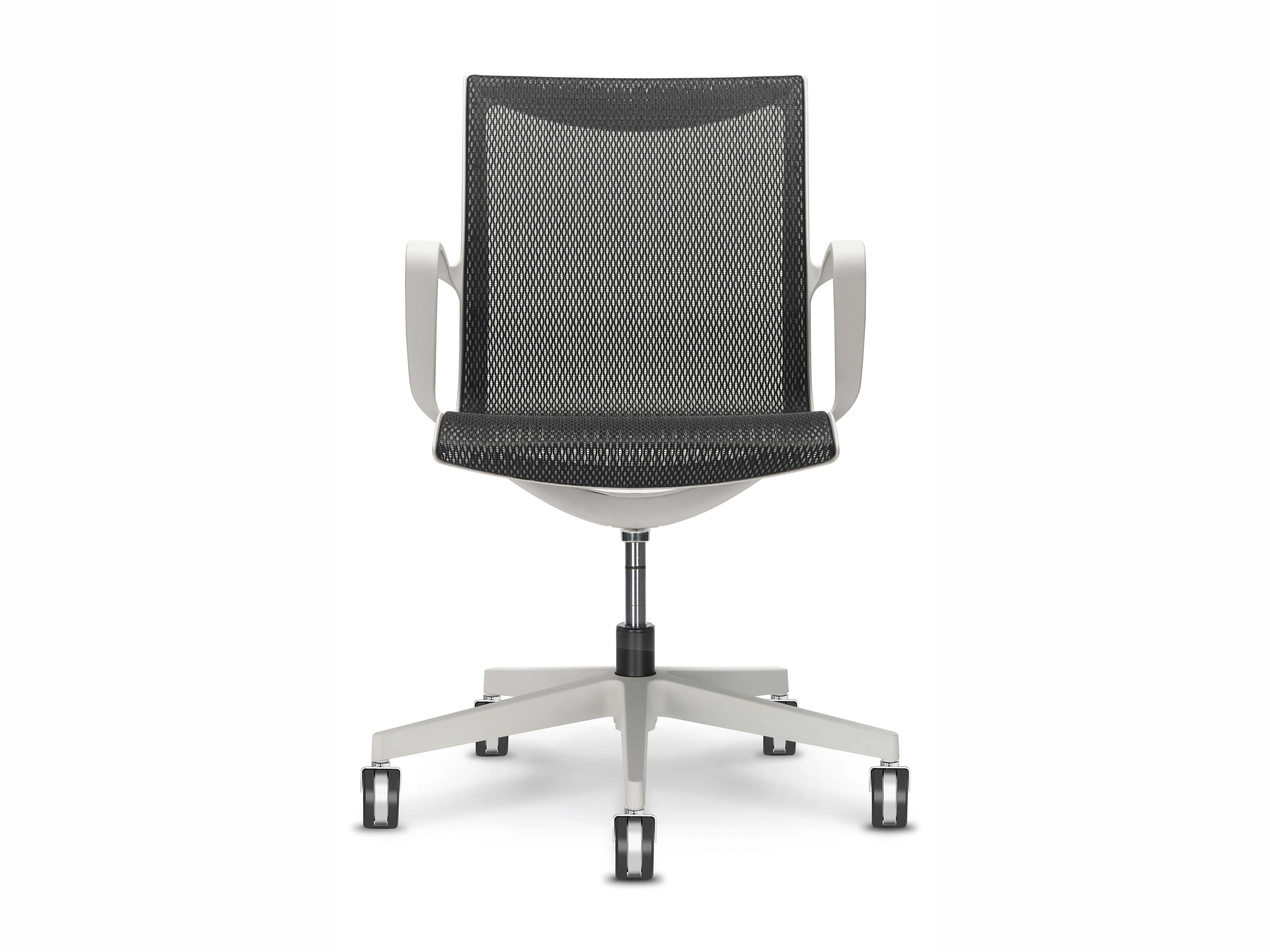 Vergaderstoel met zitting en rug mesh of themisch gevormd, gaslift hoogte verstelling en gewicht onafhankelijk neig mechaniek. Op een witgrijze 5-teen voetkruis voorzien van wielen, exclusief armleggers.