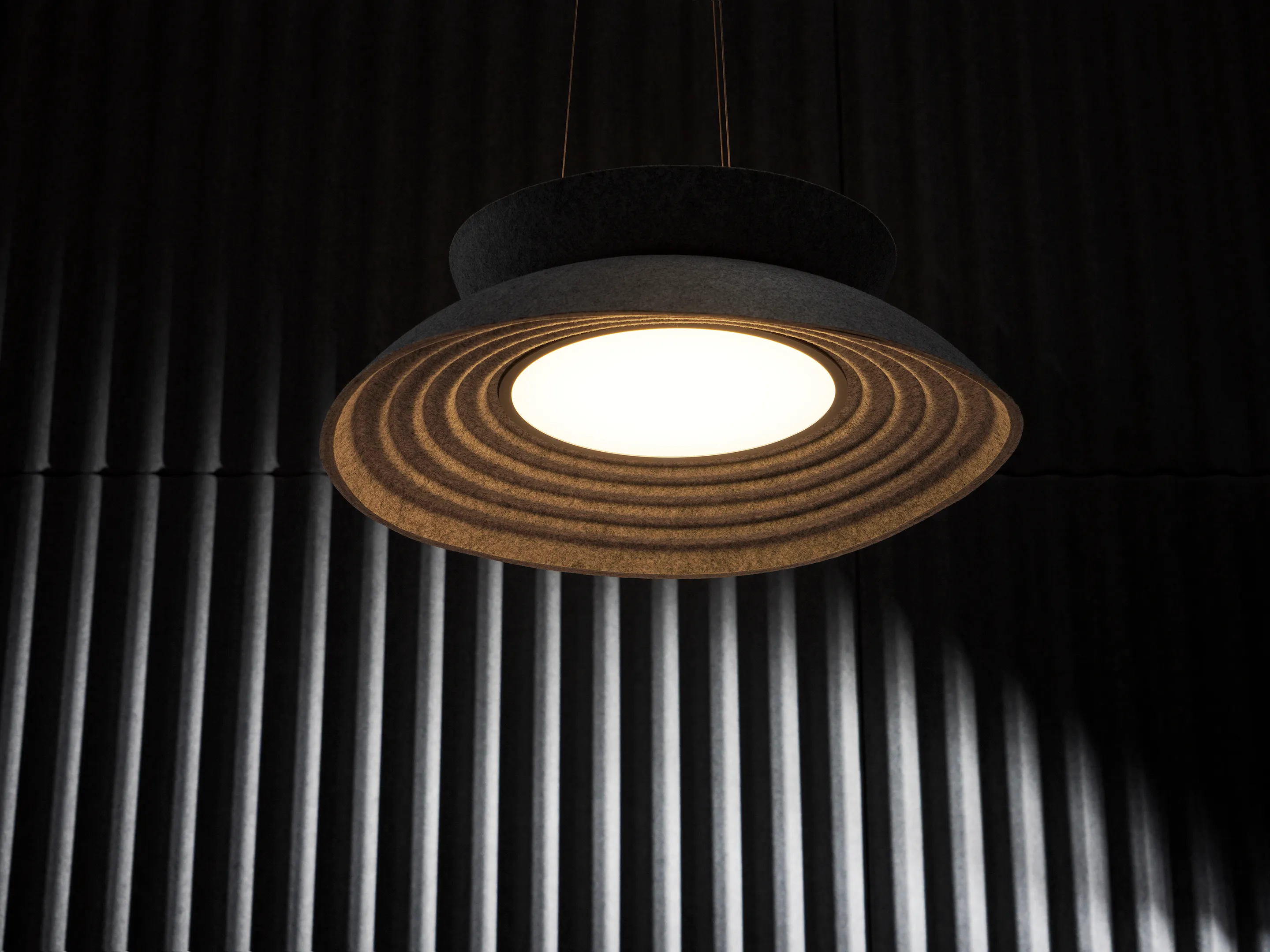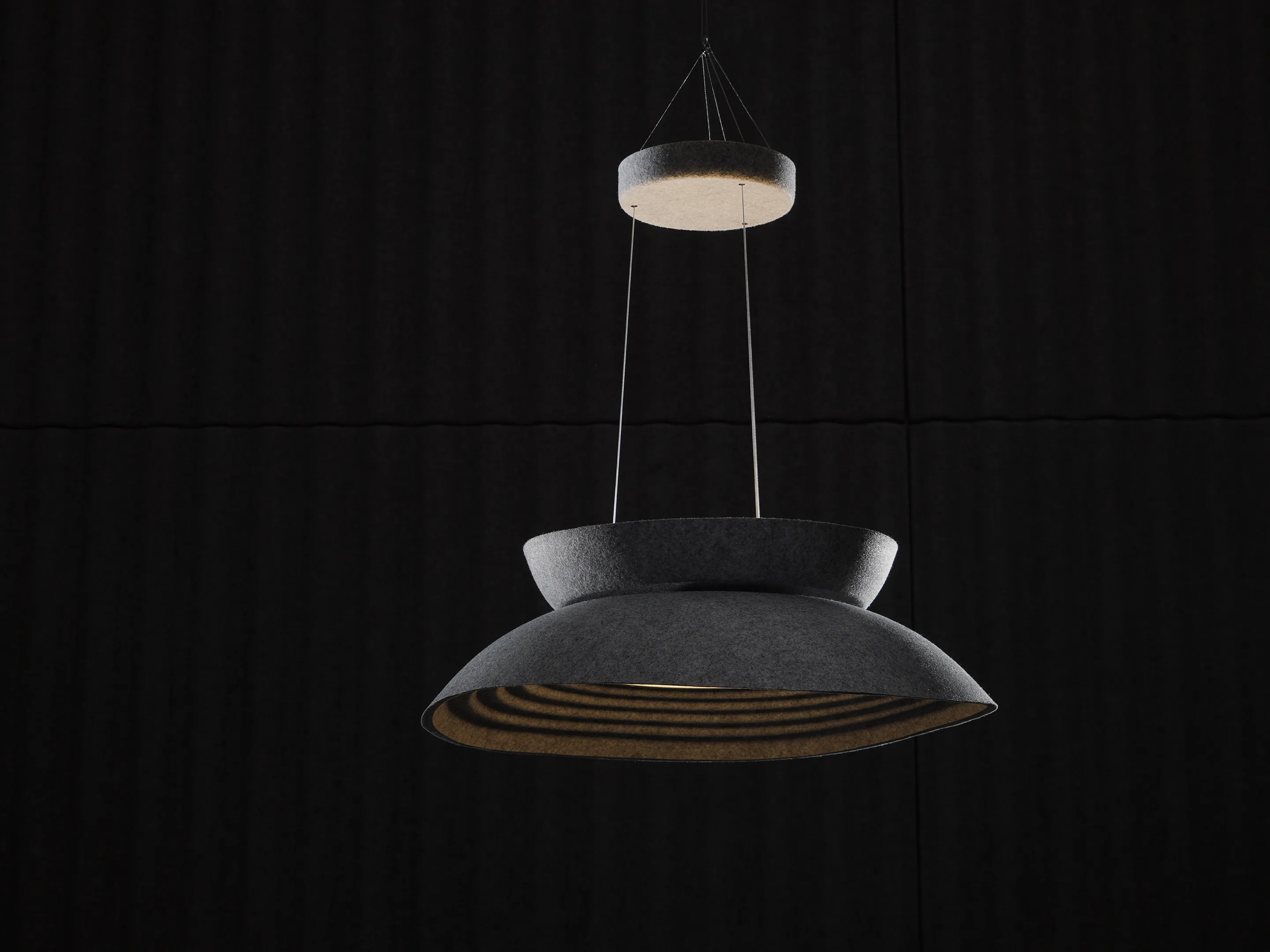 Akoestische hanglamp incl. 25W LED lamp van Ø30cm. Verlichting komt vanaf de onderzijde. De lamp wordt opgehangen met een ophangbuis.