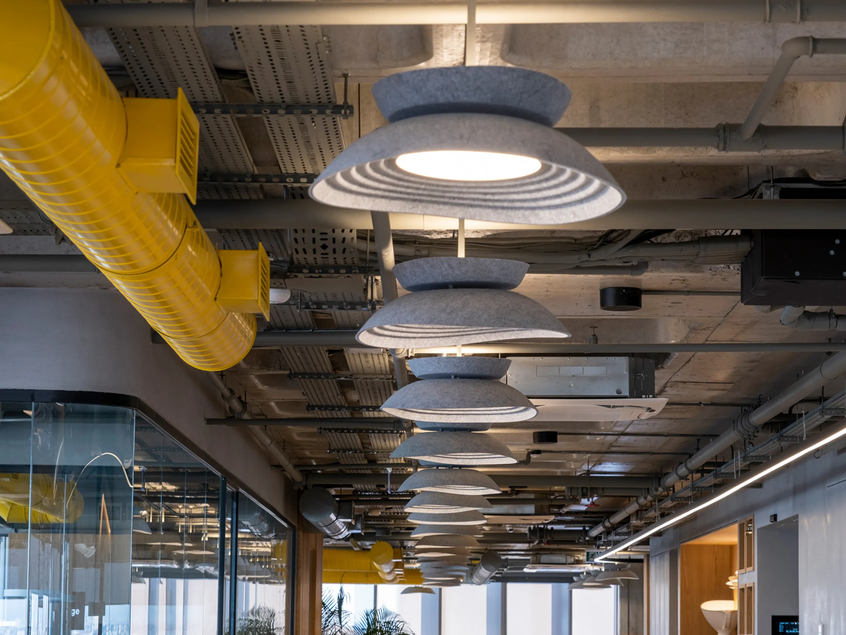Akoestische lamp opbouw incl. 40W LED lamp met directe en indirecte verlichting van Ø30cm. Verlichting komt vanaf de onder- en bovenzijde. Bevestiging aan het plafond.