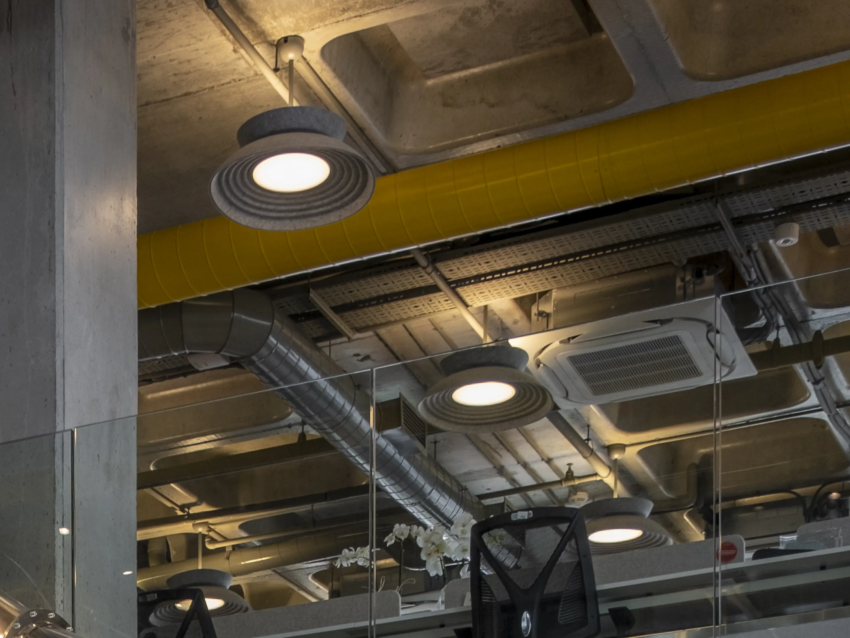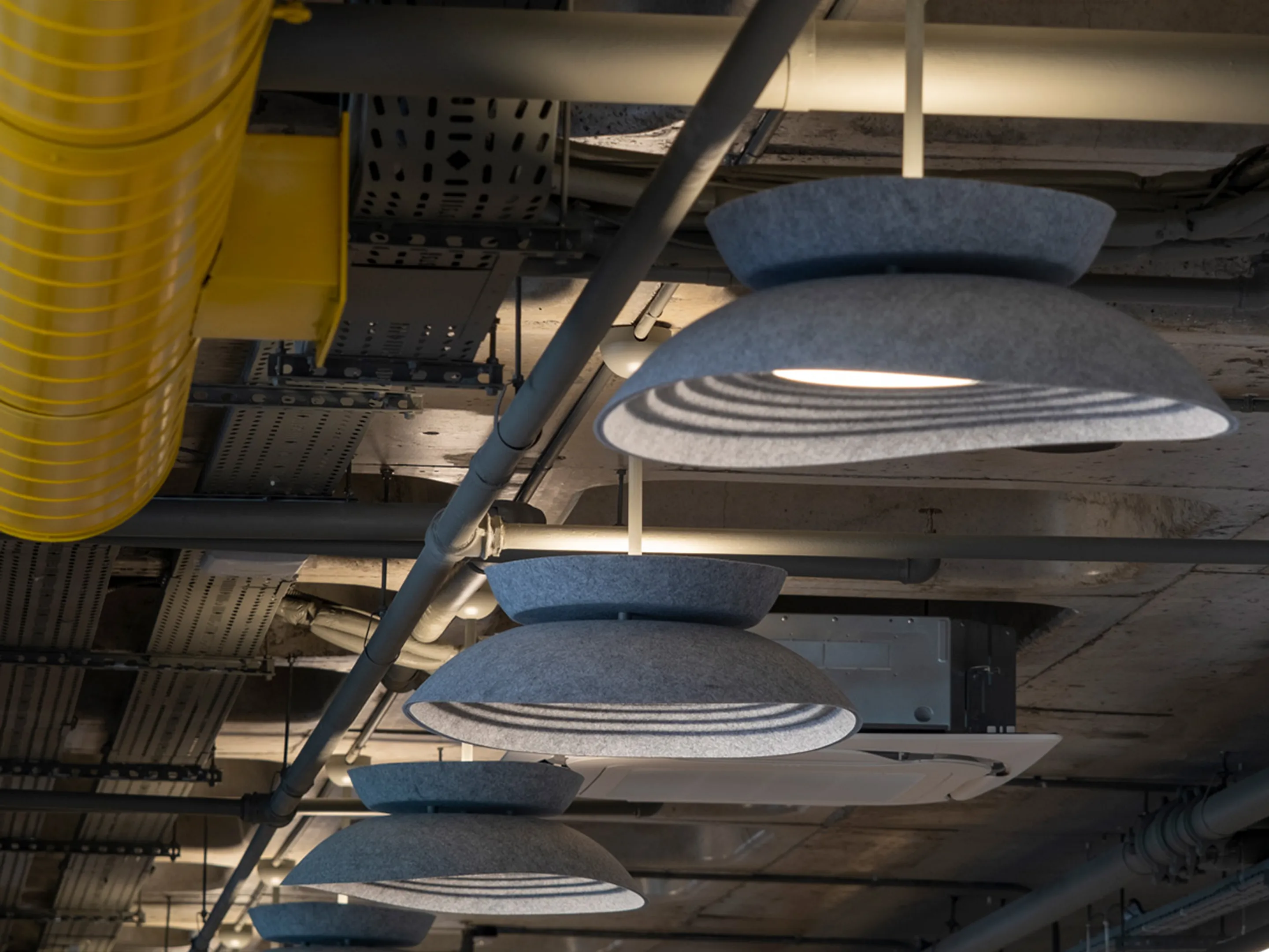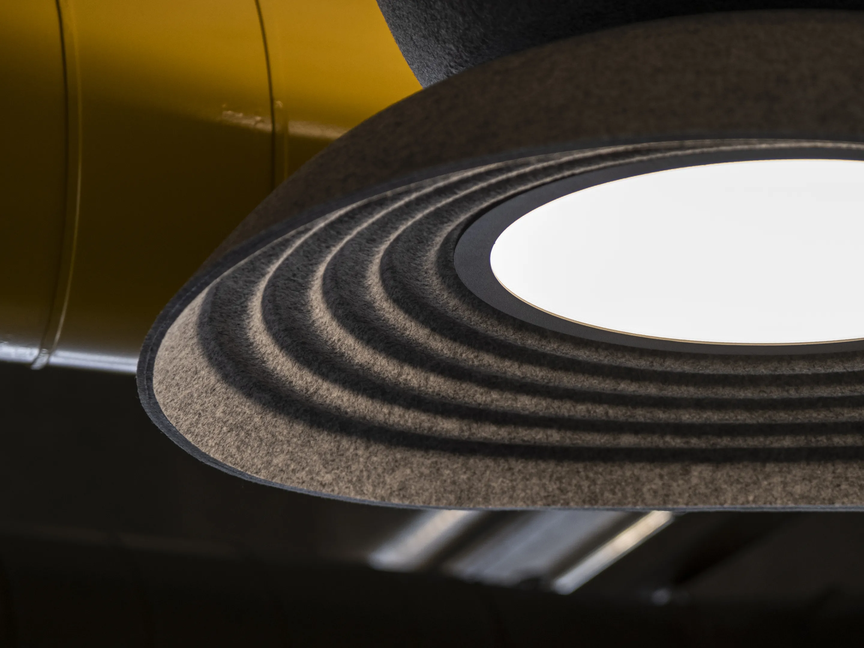 Akoestische lamp opbouw incl. 25W LED lamp van Ø30cm. Verlichting komt vanaf de onderzijde. Bevestiging aan het plafond.
