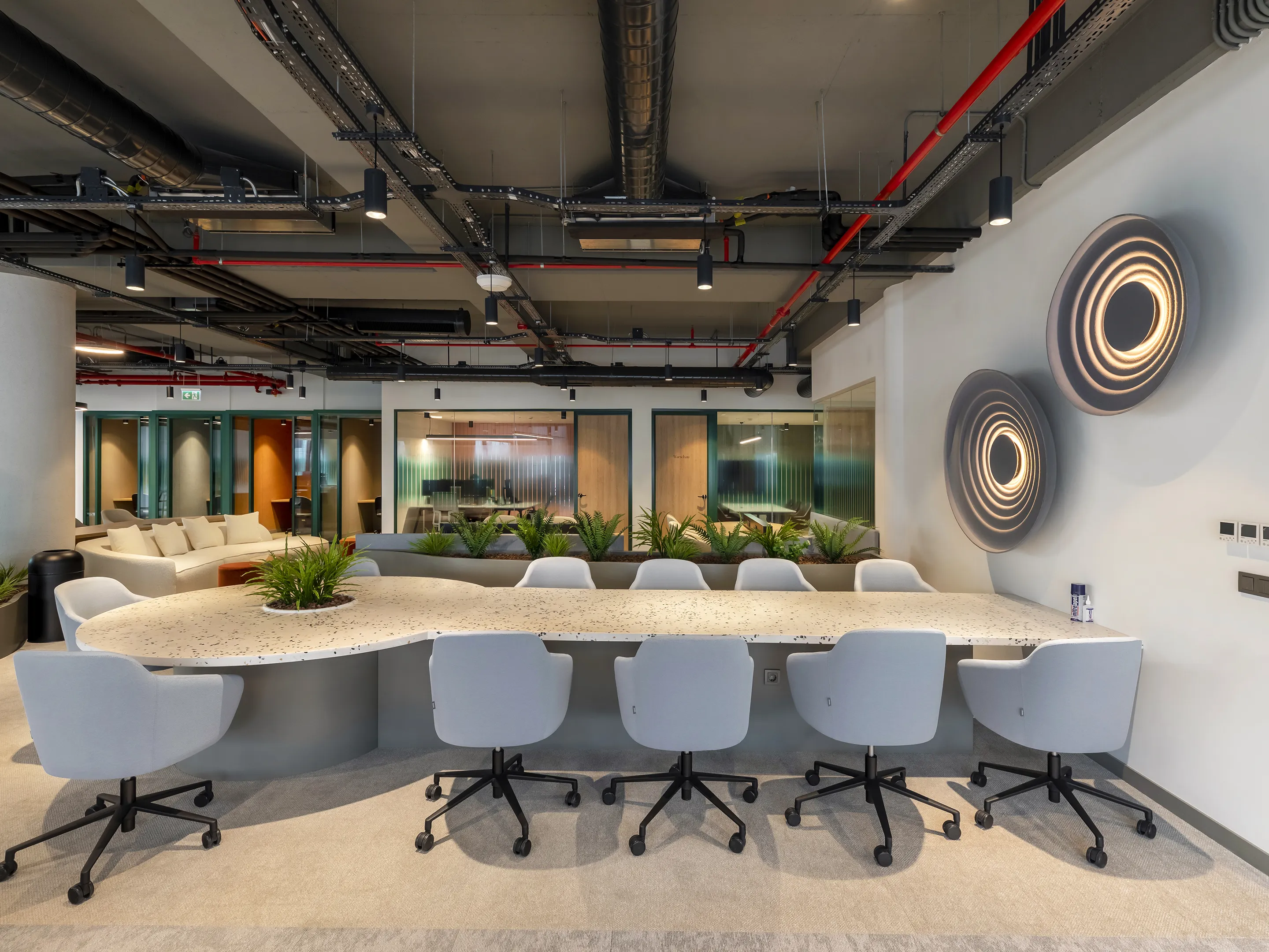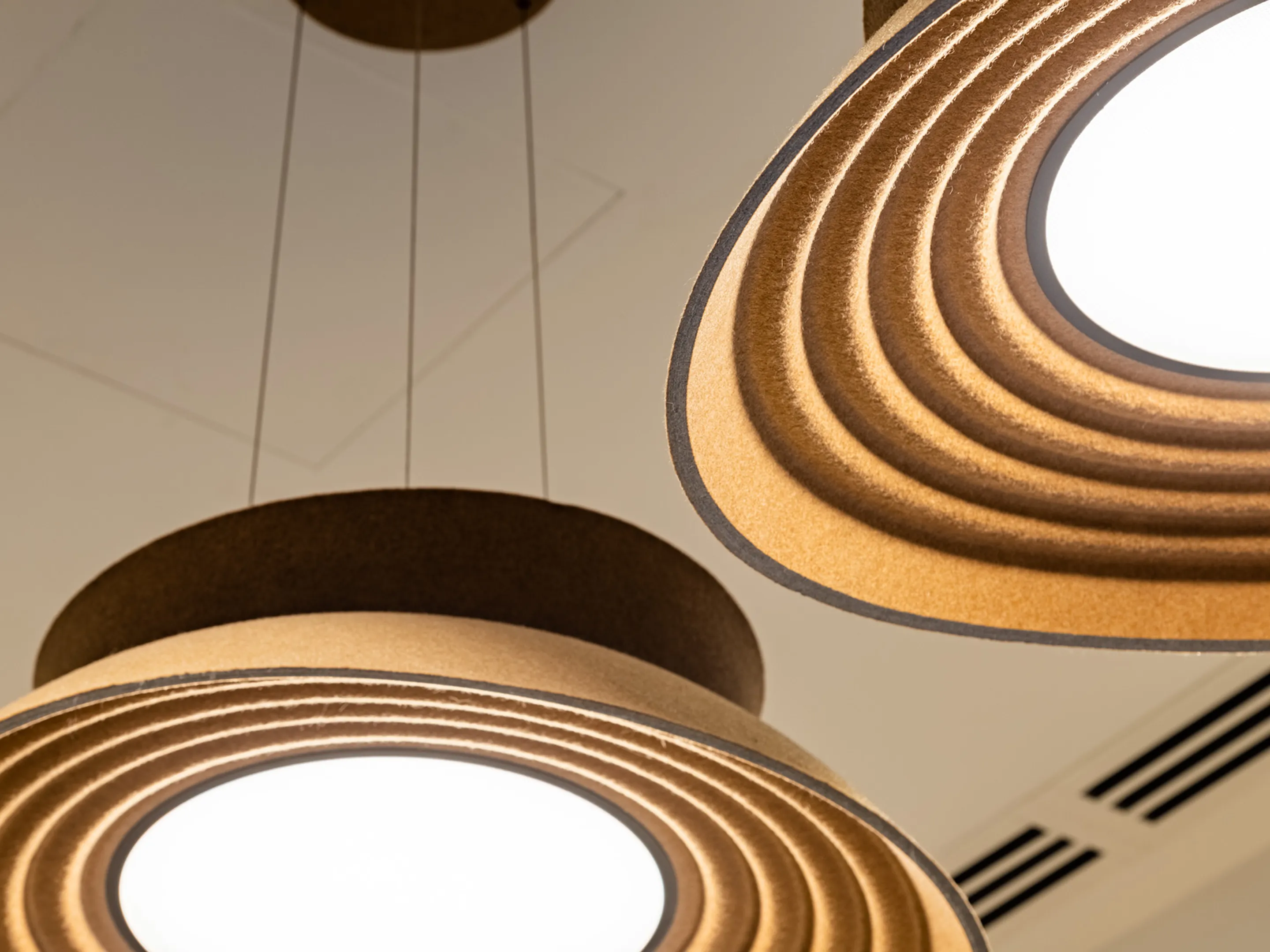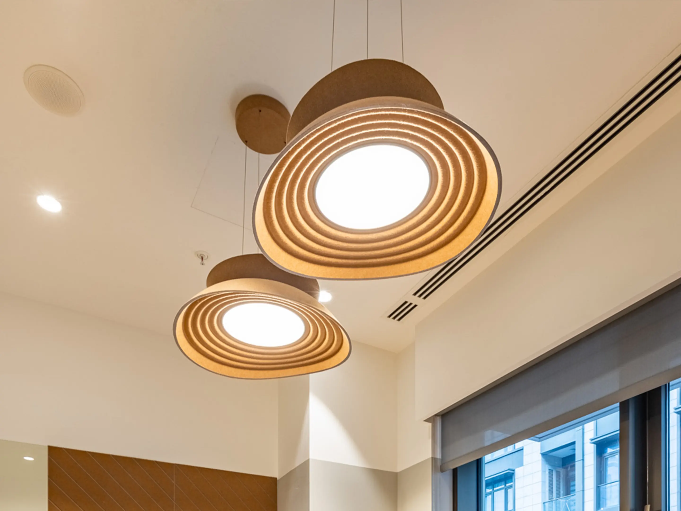 Akoestische hanglamp met taakverlichting incl. 25W LED lamp van Ø22cm. Verlichting komt vanaf de onderzijde. De lamp wordt opgehangen met stalen ophangdraad.