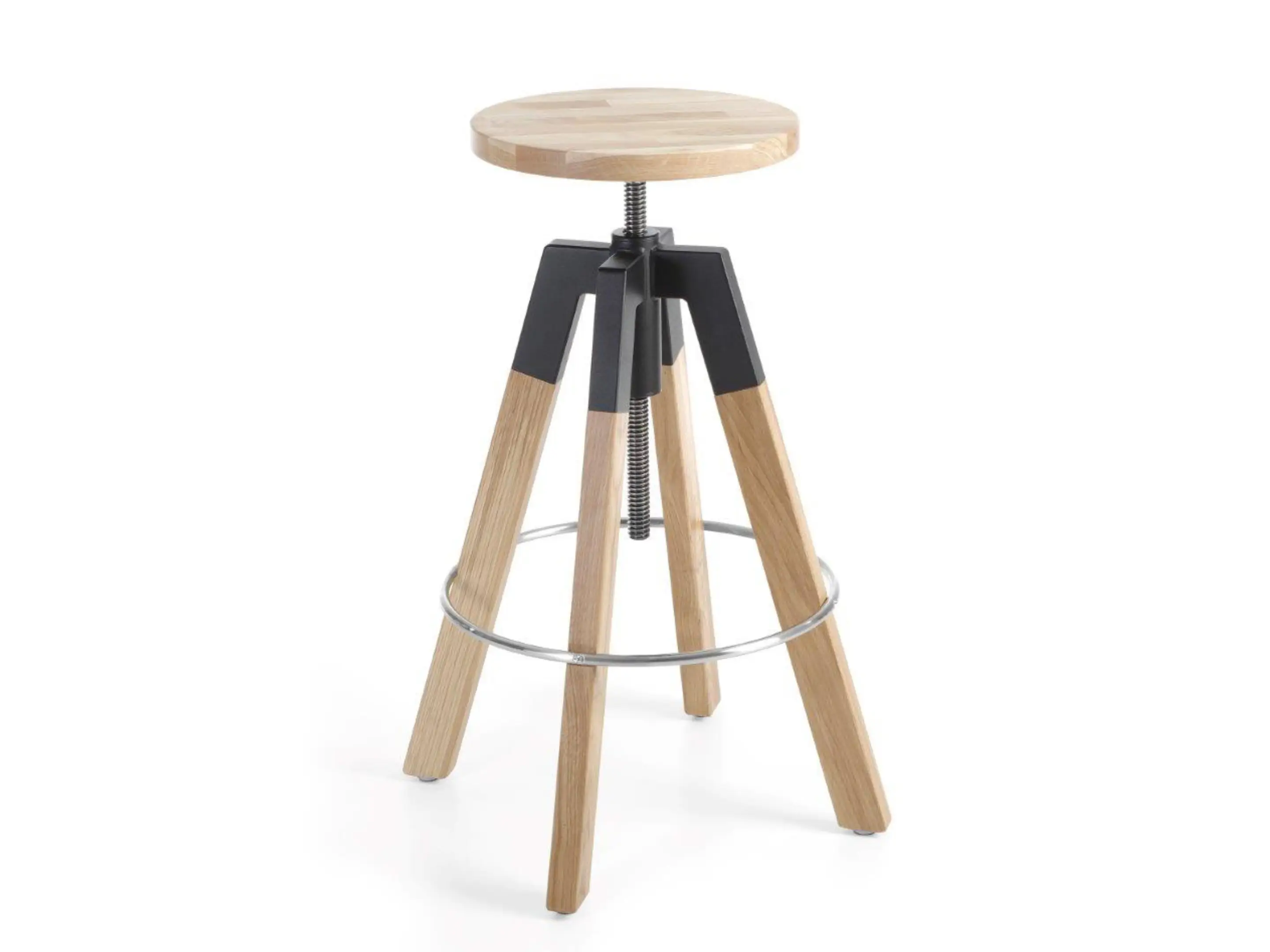 Barkruk met een zithoogte van 950mm hoog met 4-teens voetkruis en een houten zitting met hoogteinstelling