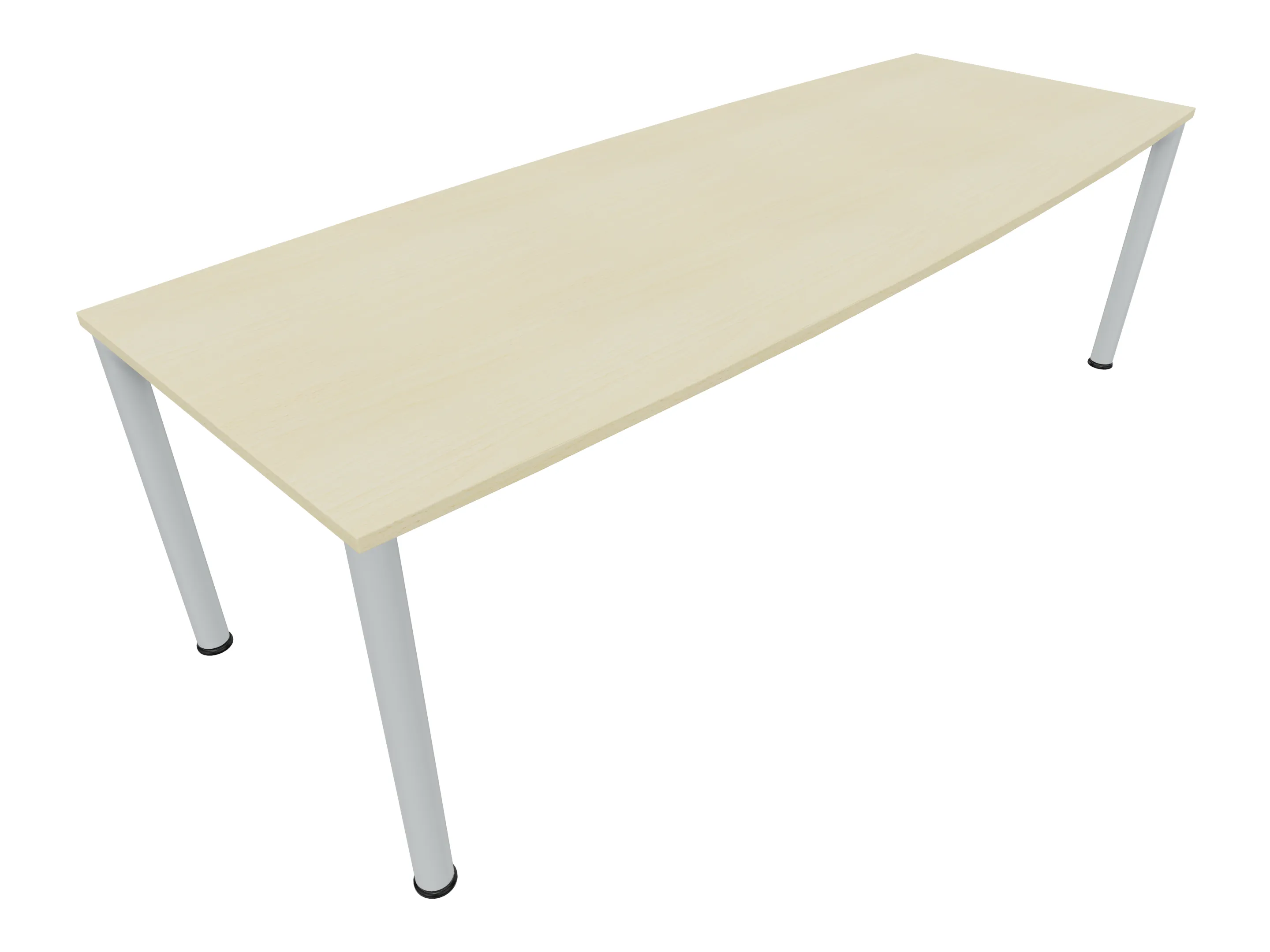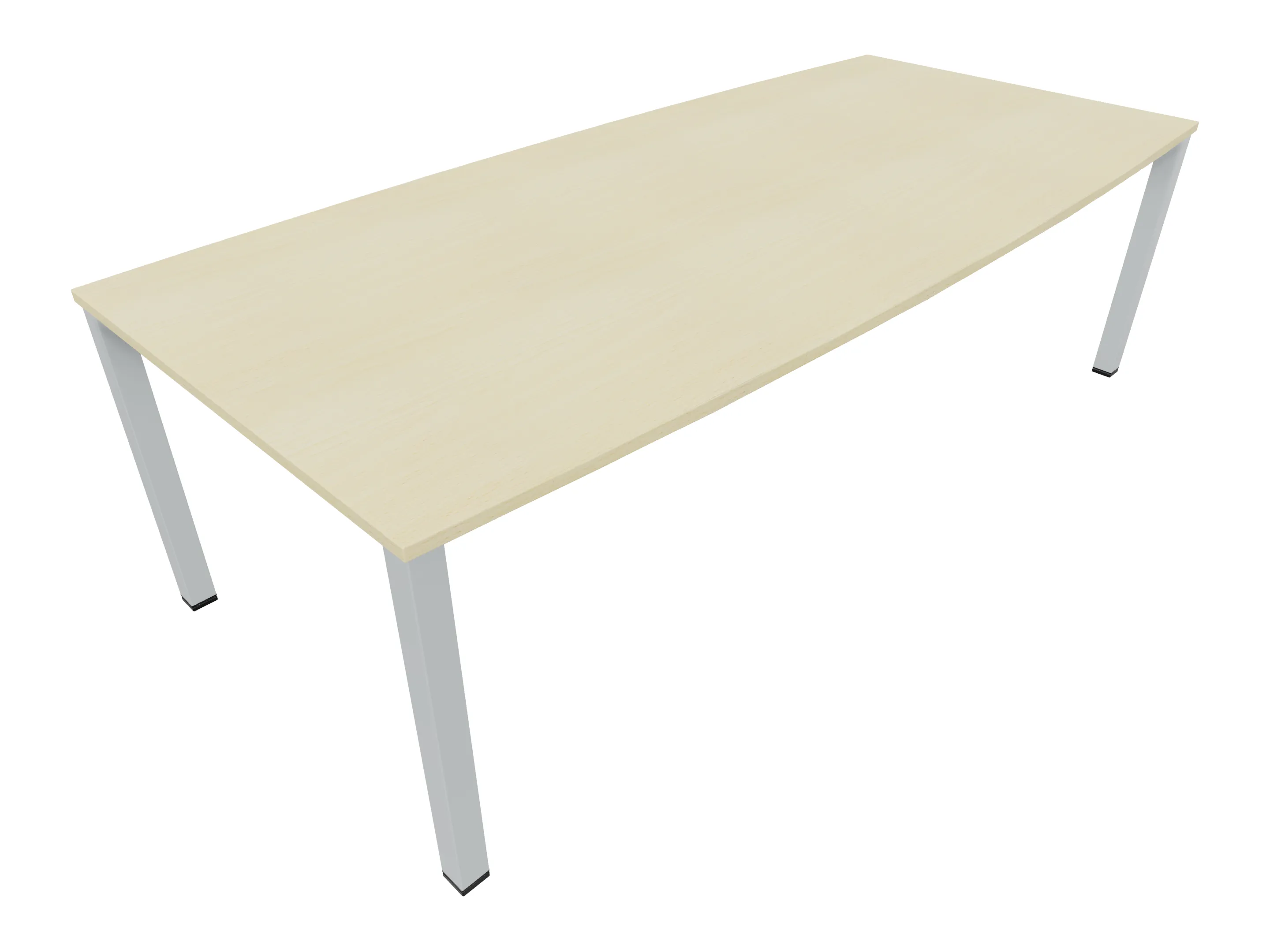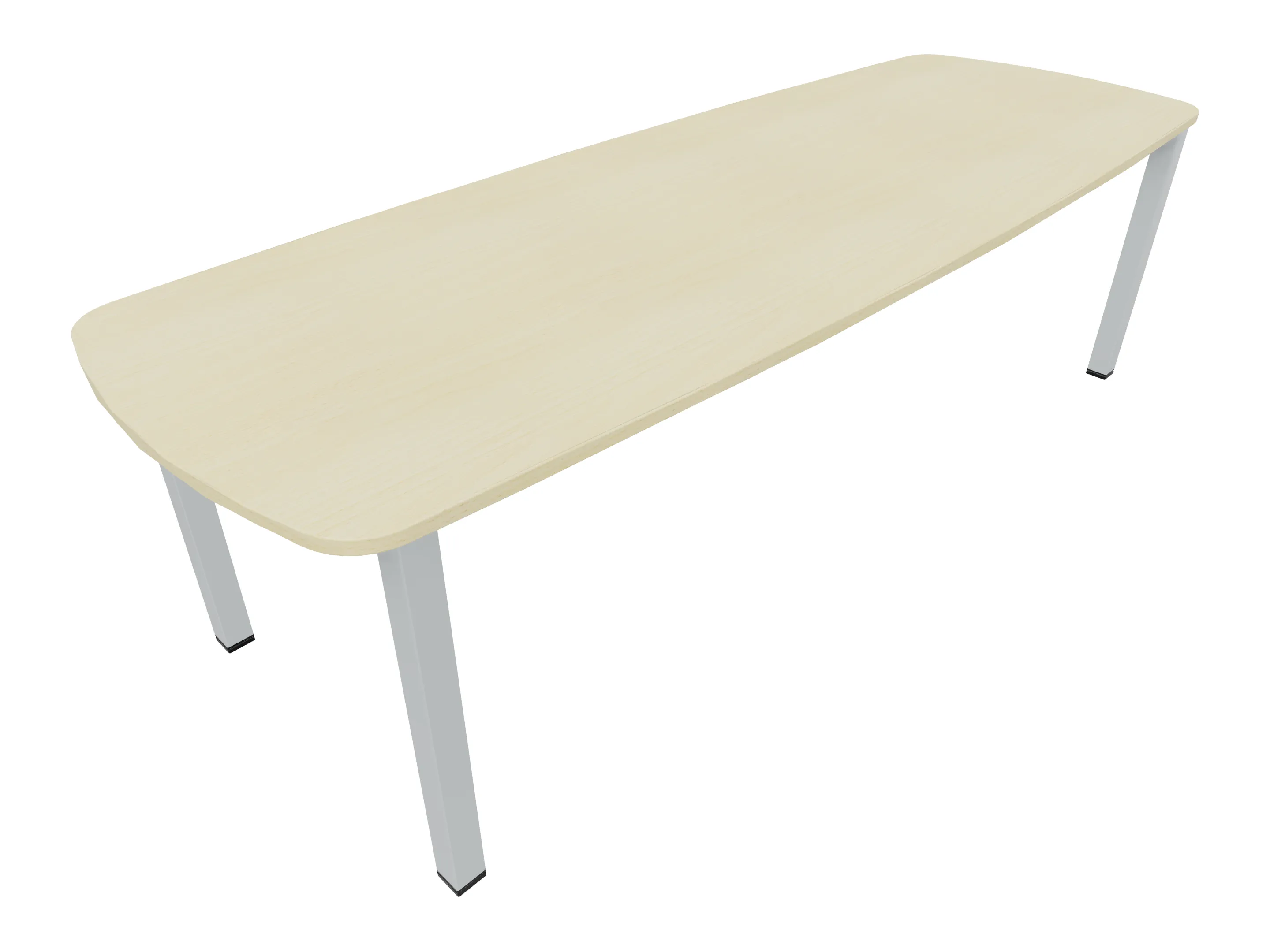 Vergadertafel op een 4-poots frame met vierkante poten 55 x 55mm (B x D) en een tonvormig blad met rechte hoeken. Hoogte-instelbaar 720-800mm. Afmeting onderstel: 2400 x 800mm (B x D). Afmeting blad: 2400 x 900mm (B x D).
