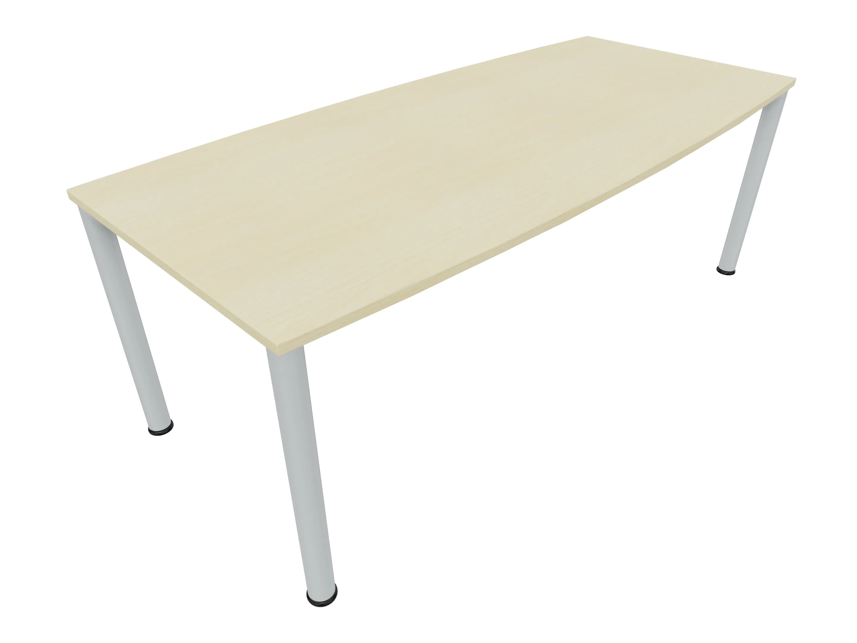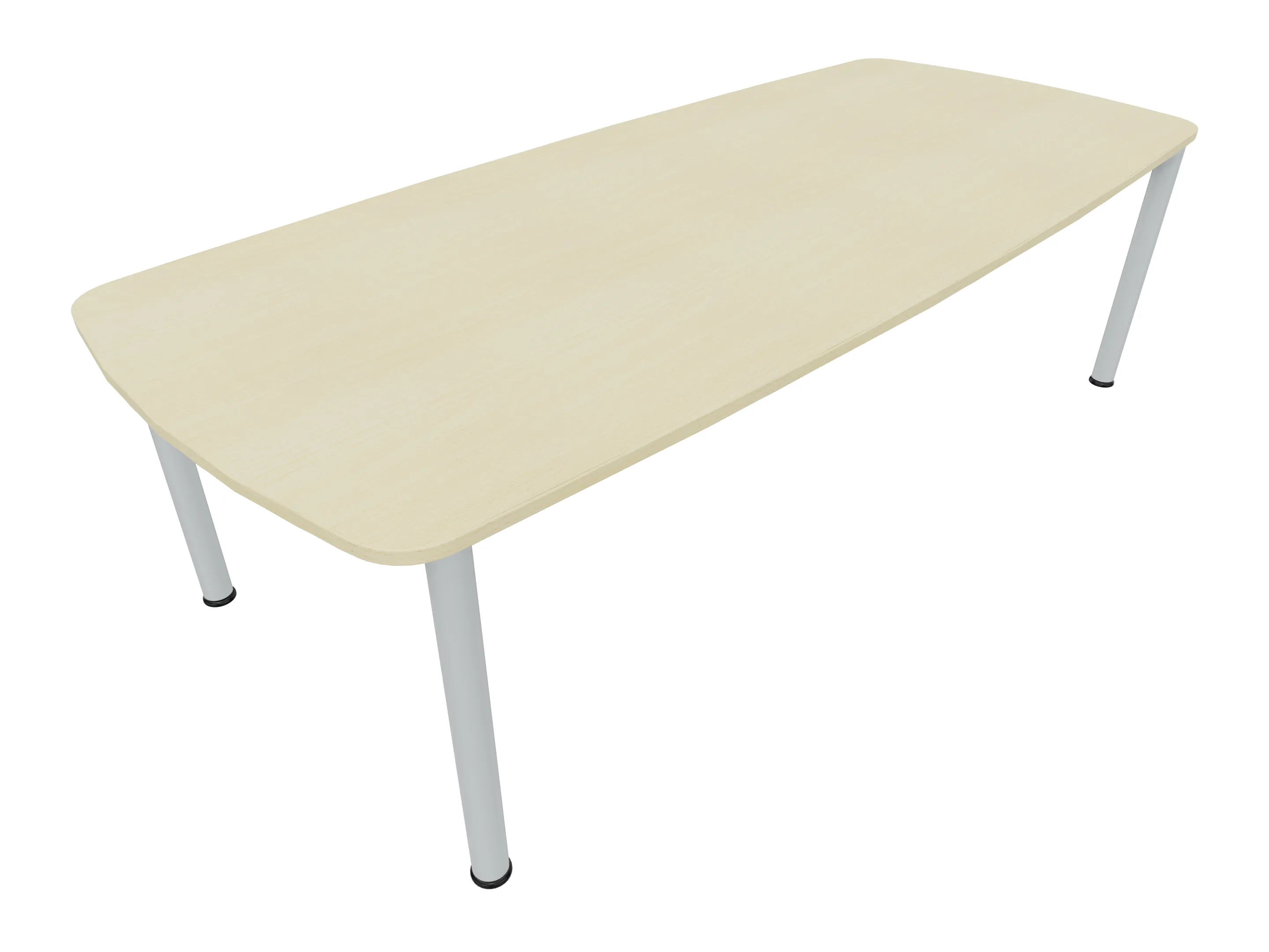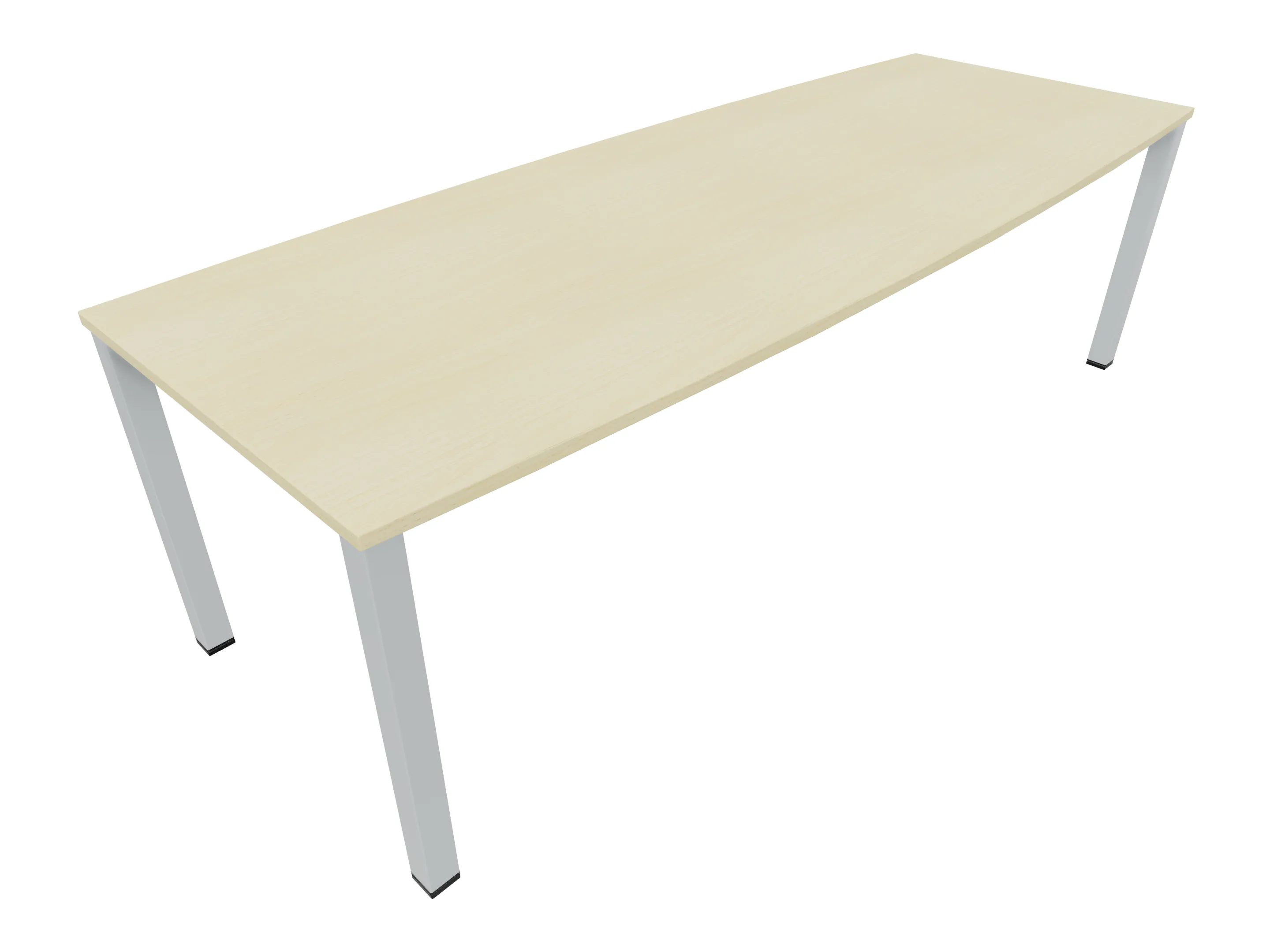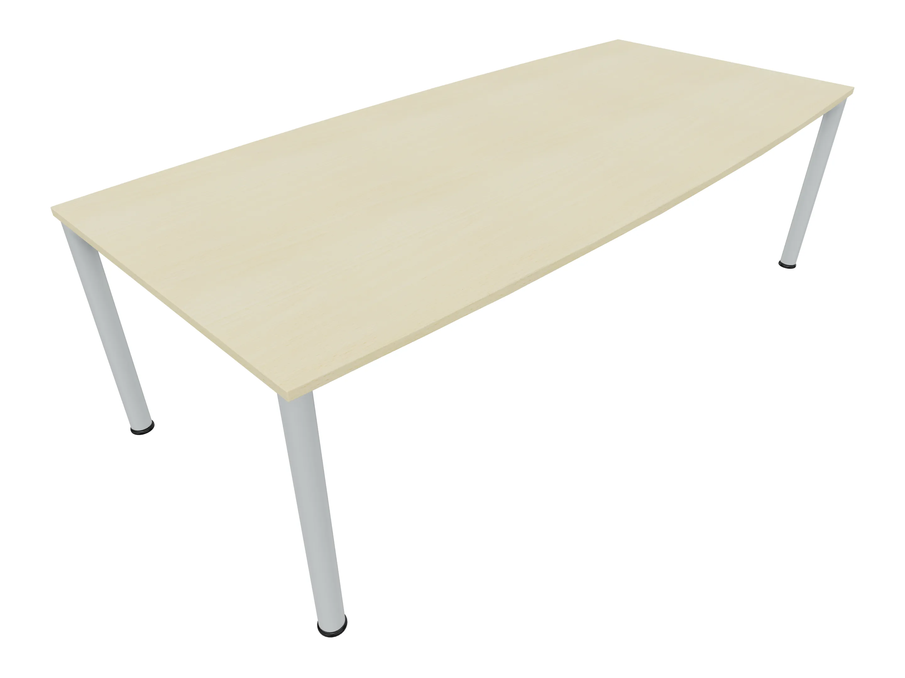 Vergadertafel op een 4-poots frame met vierkante poten 55 x 55mm (B x D) en een tonvormig blad met rechte hoeken. Hoogte-instelbaar 720-800mm. Afmeting onderstel: 2400 x 800mm (B x D). Afmeting blad: 2400 x 900mm (B x D).