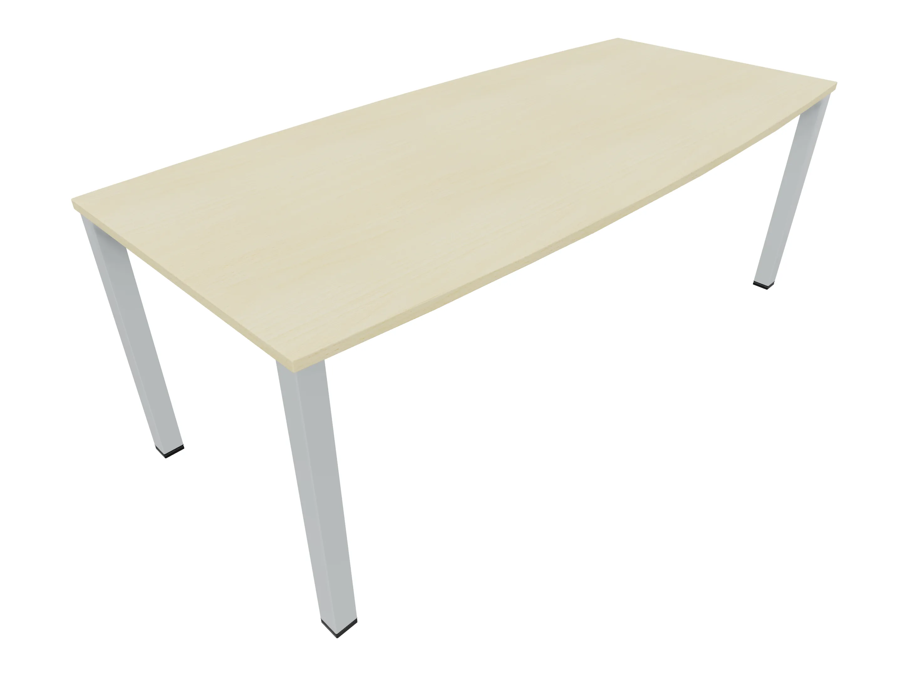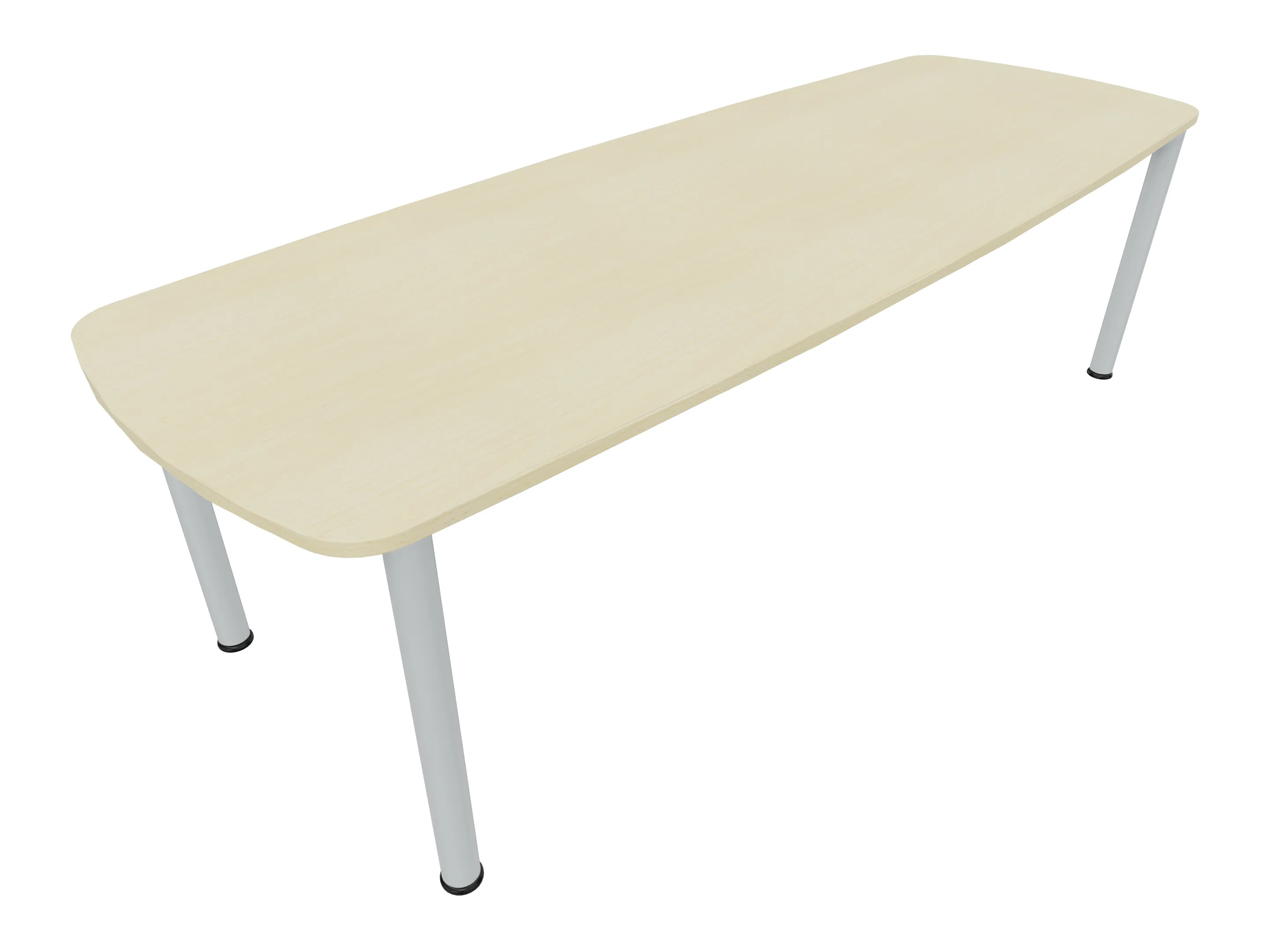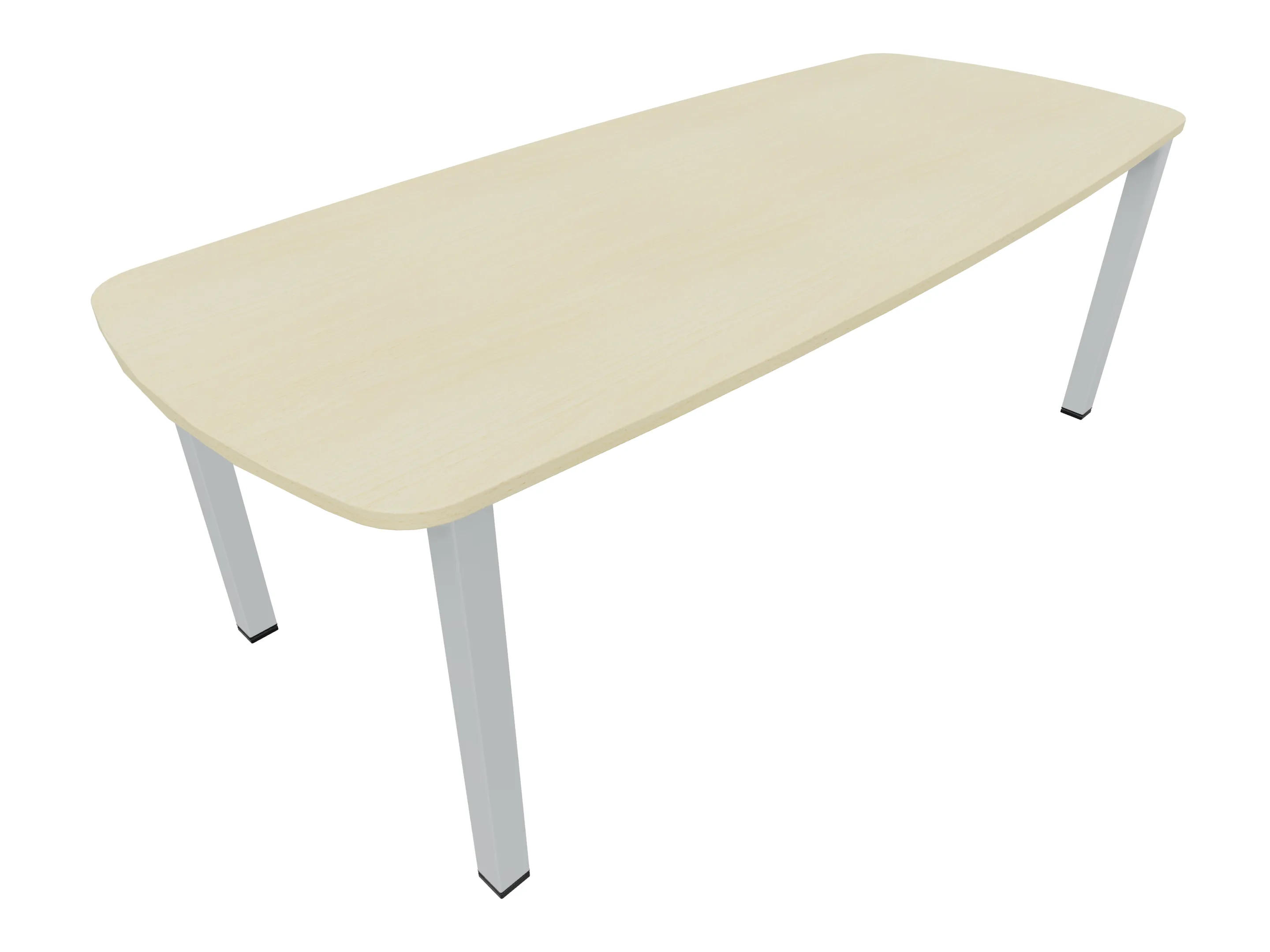 Vergadertafel op een 4-poots frame met vierkante poten 55 x 55mm (B x D) en een tonvormig blad met geronde hoeken. Hoogte-instelbaar 720-800mm. Afmeting onderstel: 1900 x 800mm (B x D). Afmeting blad: 2137 x 900mm (B x D).