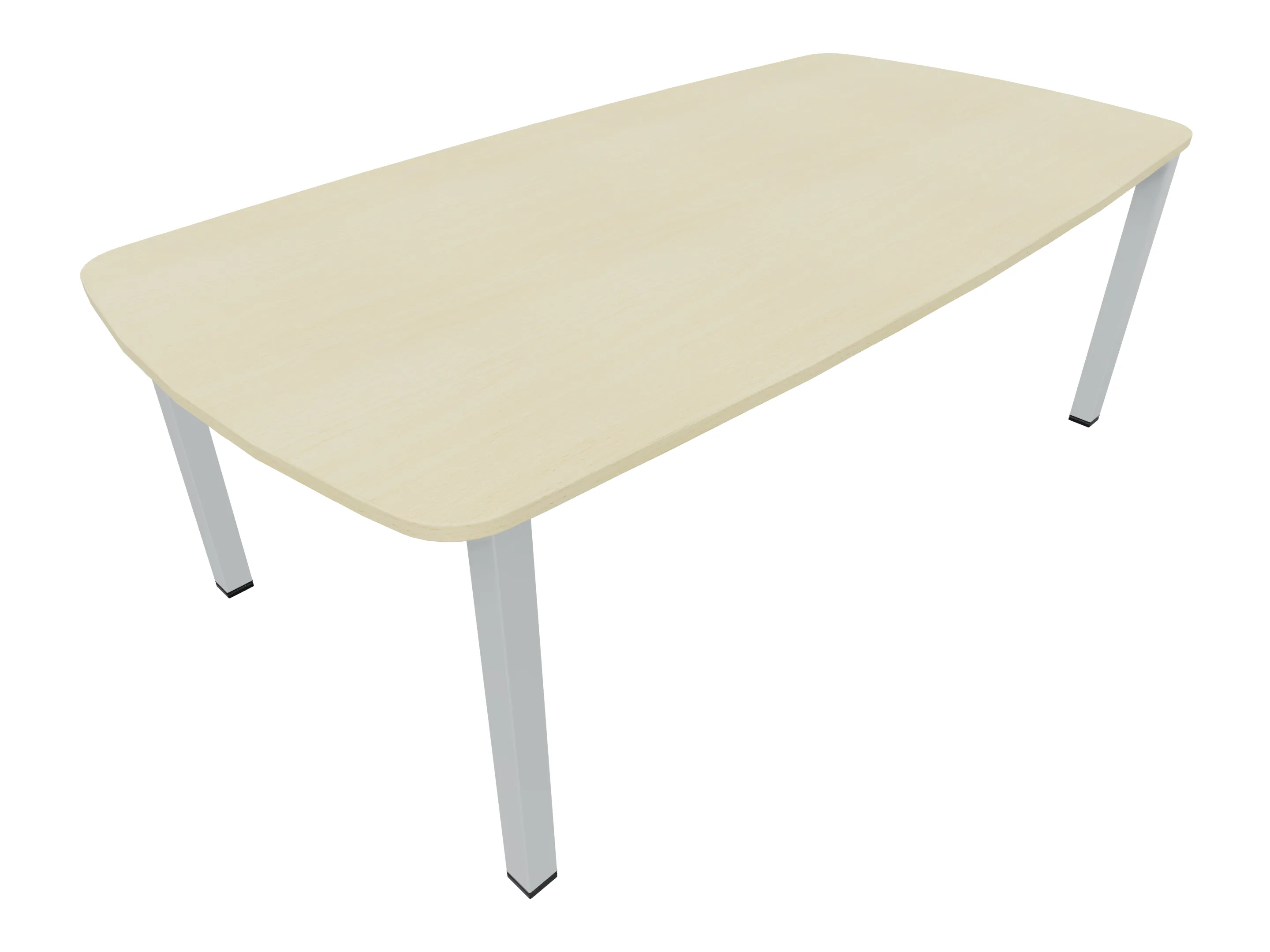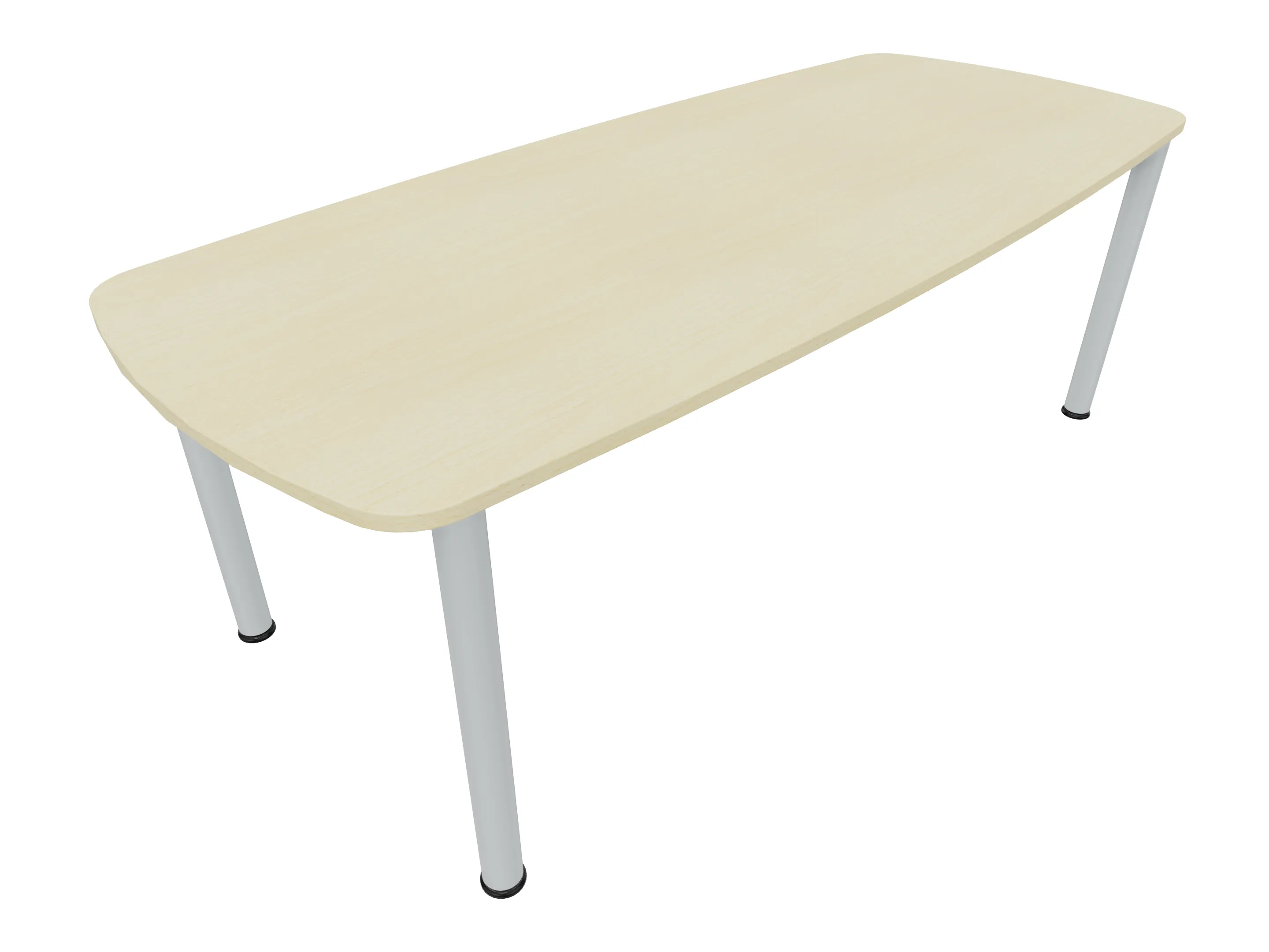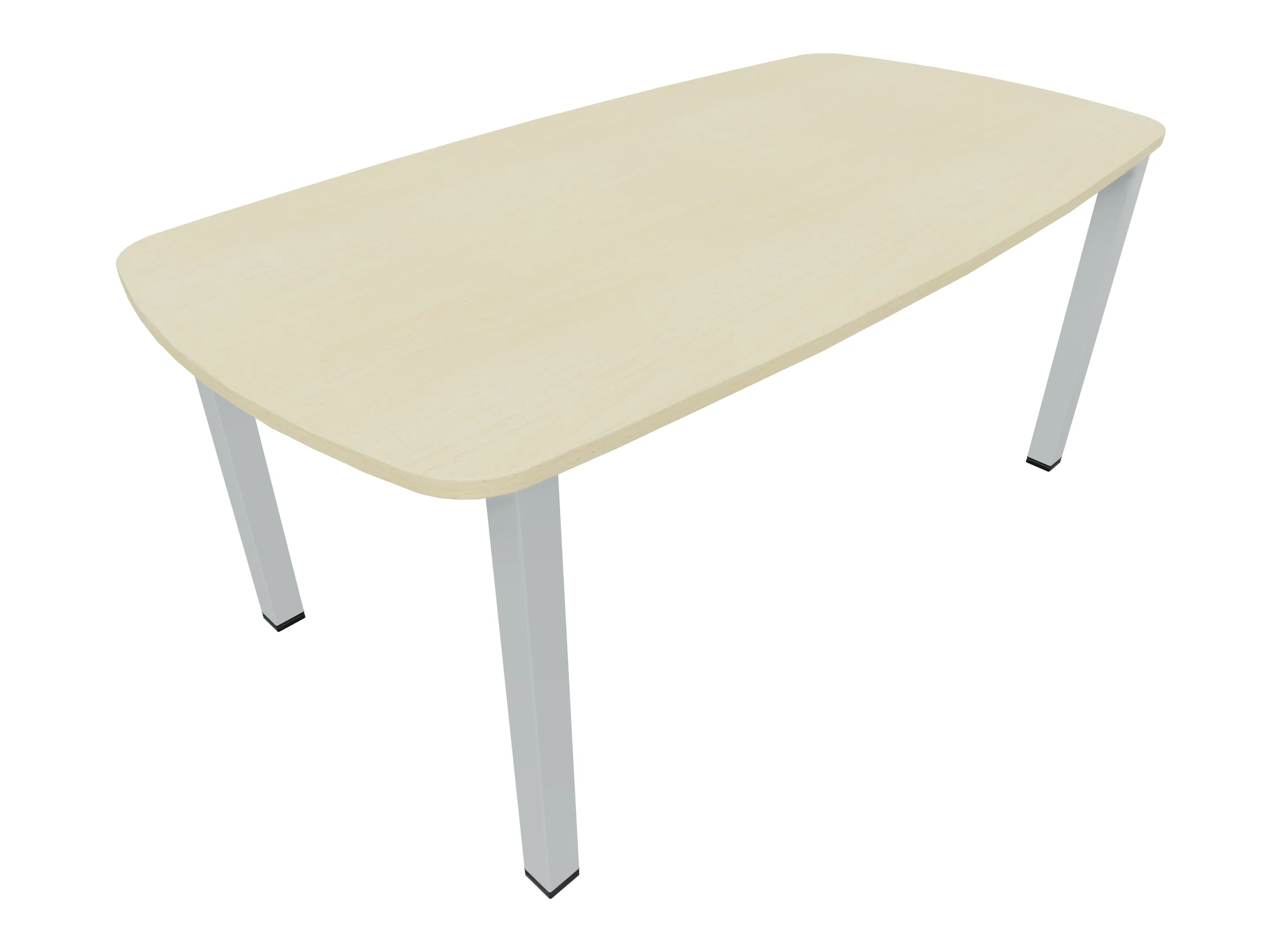 Vergadertafel op een 4-poots frame met vierkante poten 55 x 55mm (B x D) en een tonvormig blad met geronde hoeken. Hoogte-instelbaar 720-800mm. Afmeting onderstel: 1900 x 800mm (B x D). Afmeting blad: 2137 x 900mm (B x D).