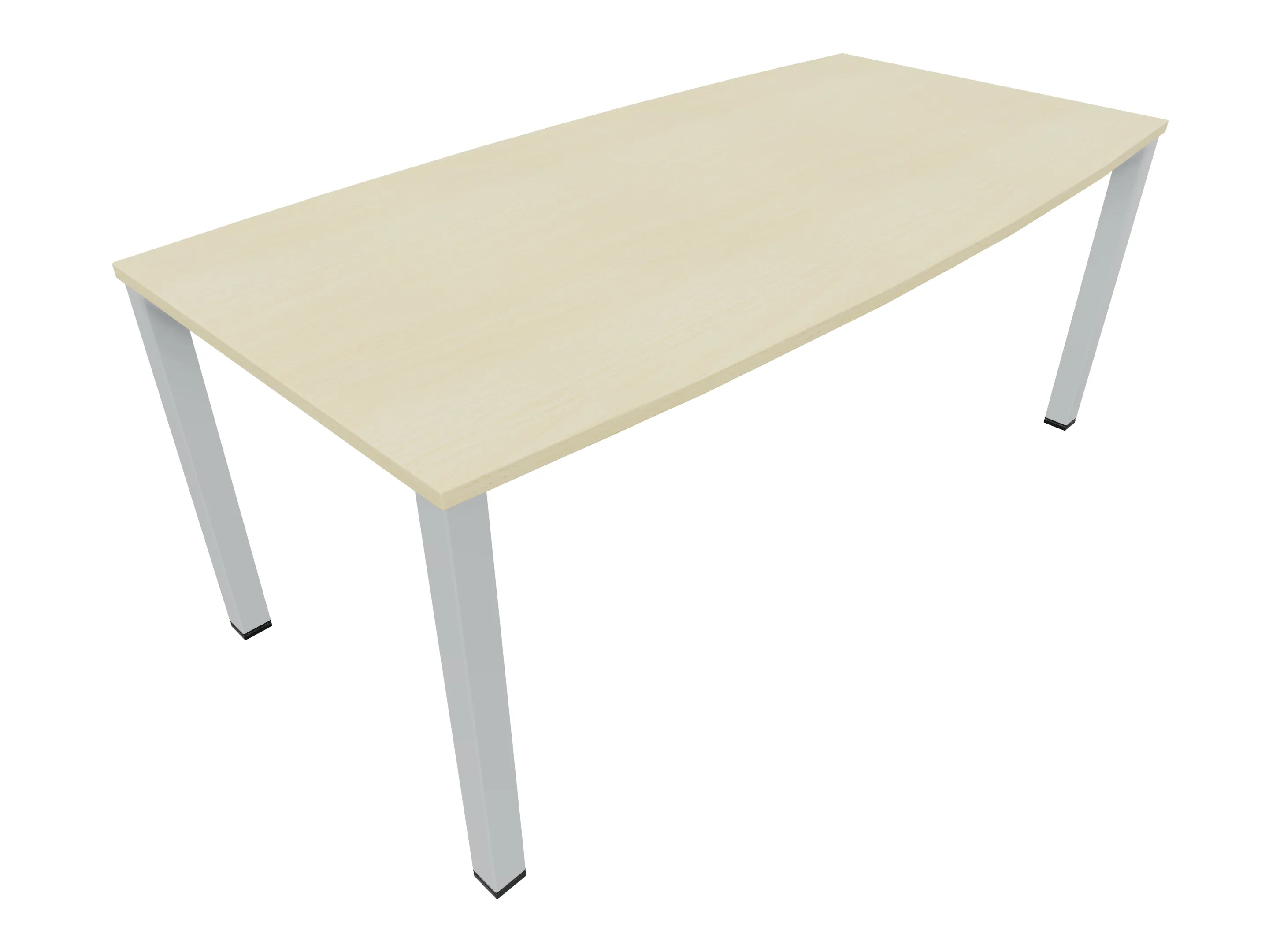 Vergadertafel op een 4-poots frame met vierkante poten 55 x 55mm (B x D) en een tonvormig blad met rechte hoeken. Hoogte-instelbaar 720-800mm. Afmeting onderstel: 1800 x 800mm (B x D). Afmeting blad: 1800 x 900mm (B x D).