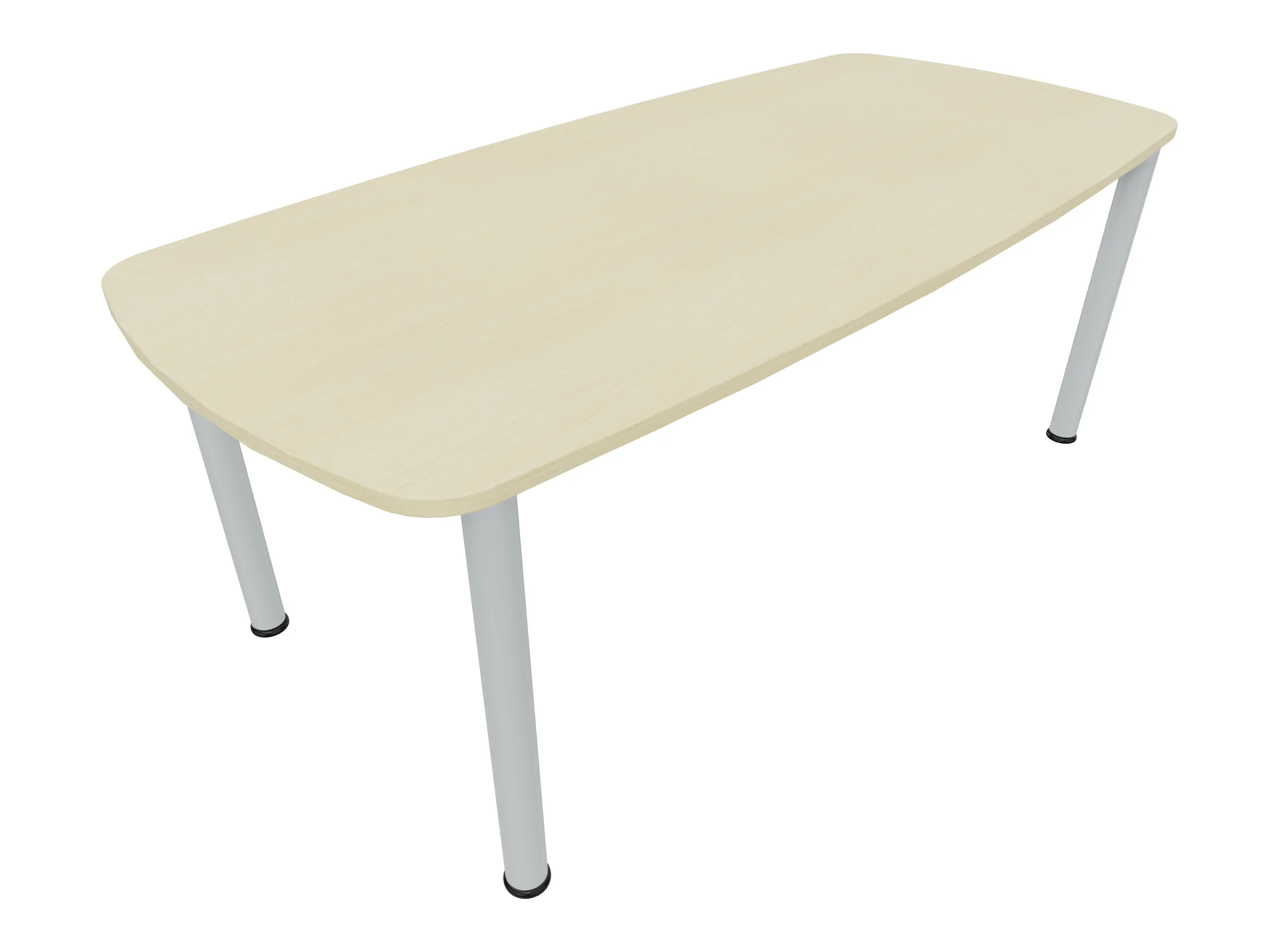 Vergadertafel op een 4-poots frame met ronde poten Ø 60mm en een tonvormig blad met geronde hoeken. Hoogte-instelbaar 720-800mm. Afmeting onderstel: 1900 x 800mm (B x D). Afmeting blad: 2137 x 900mm (B x D).