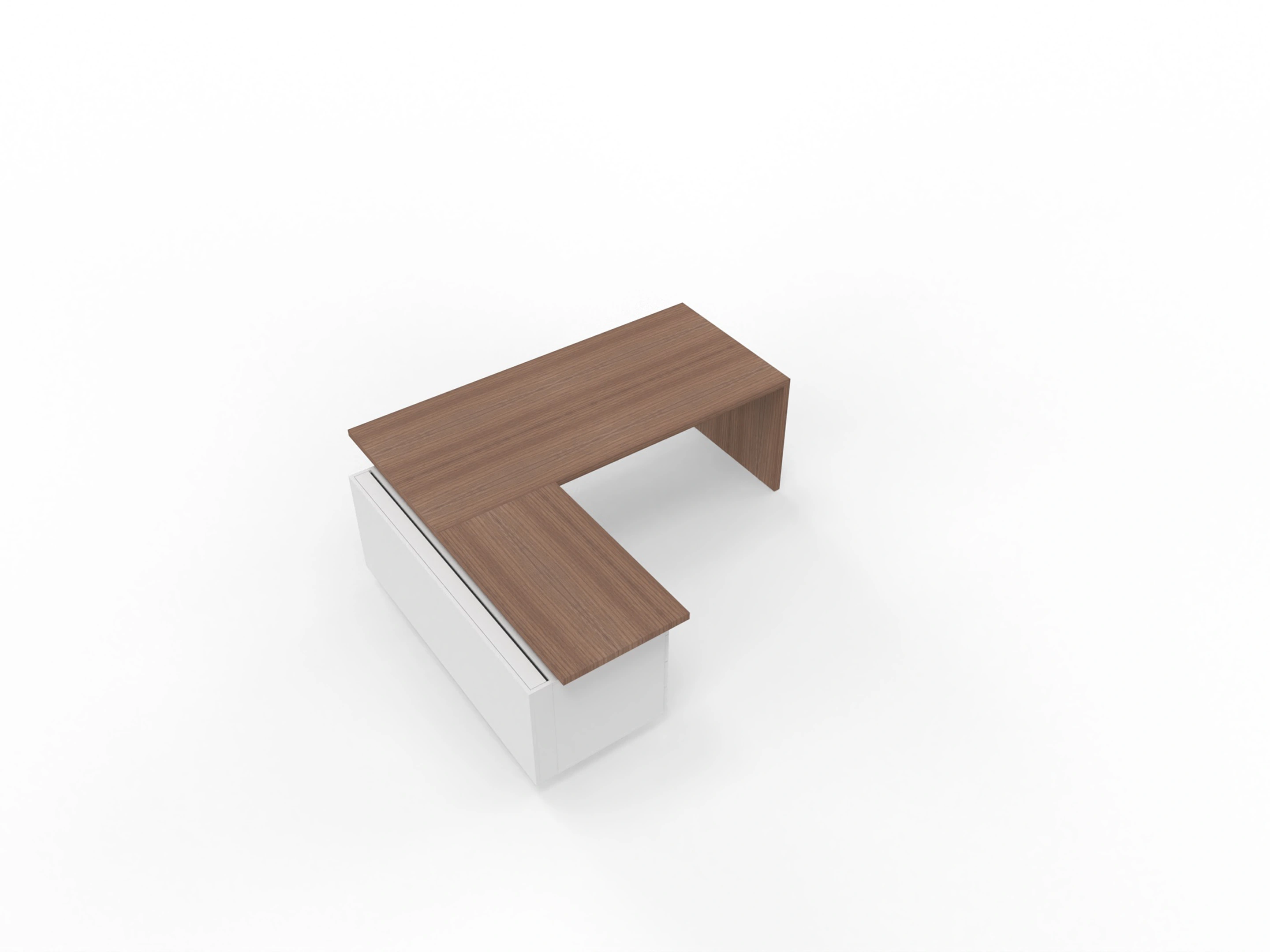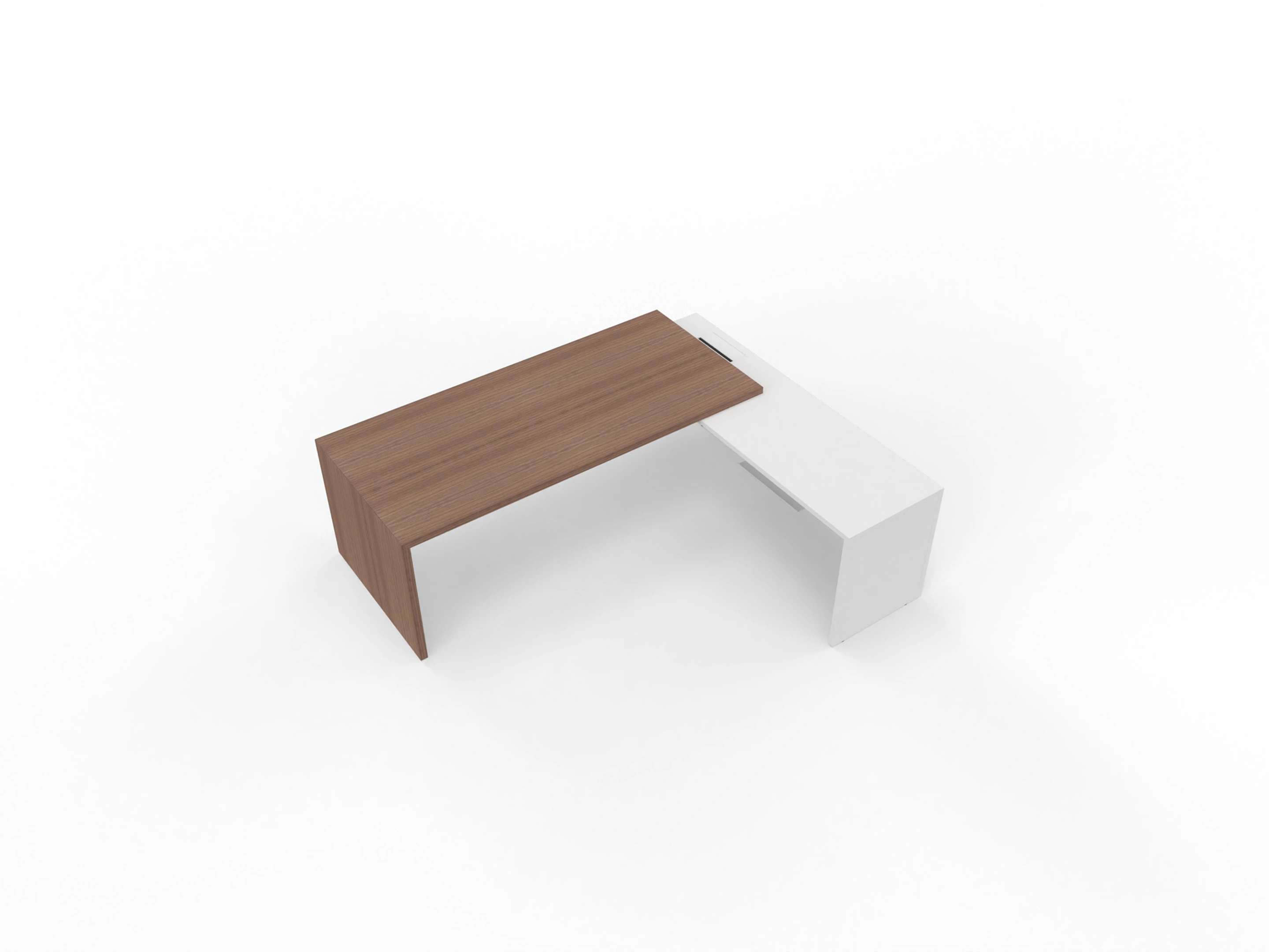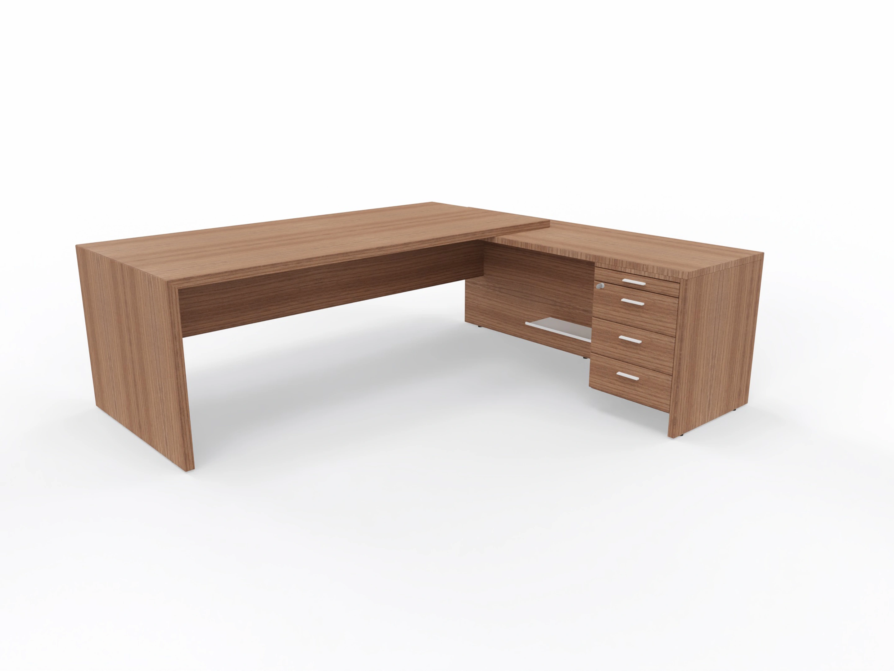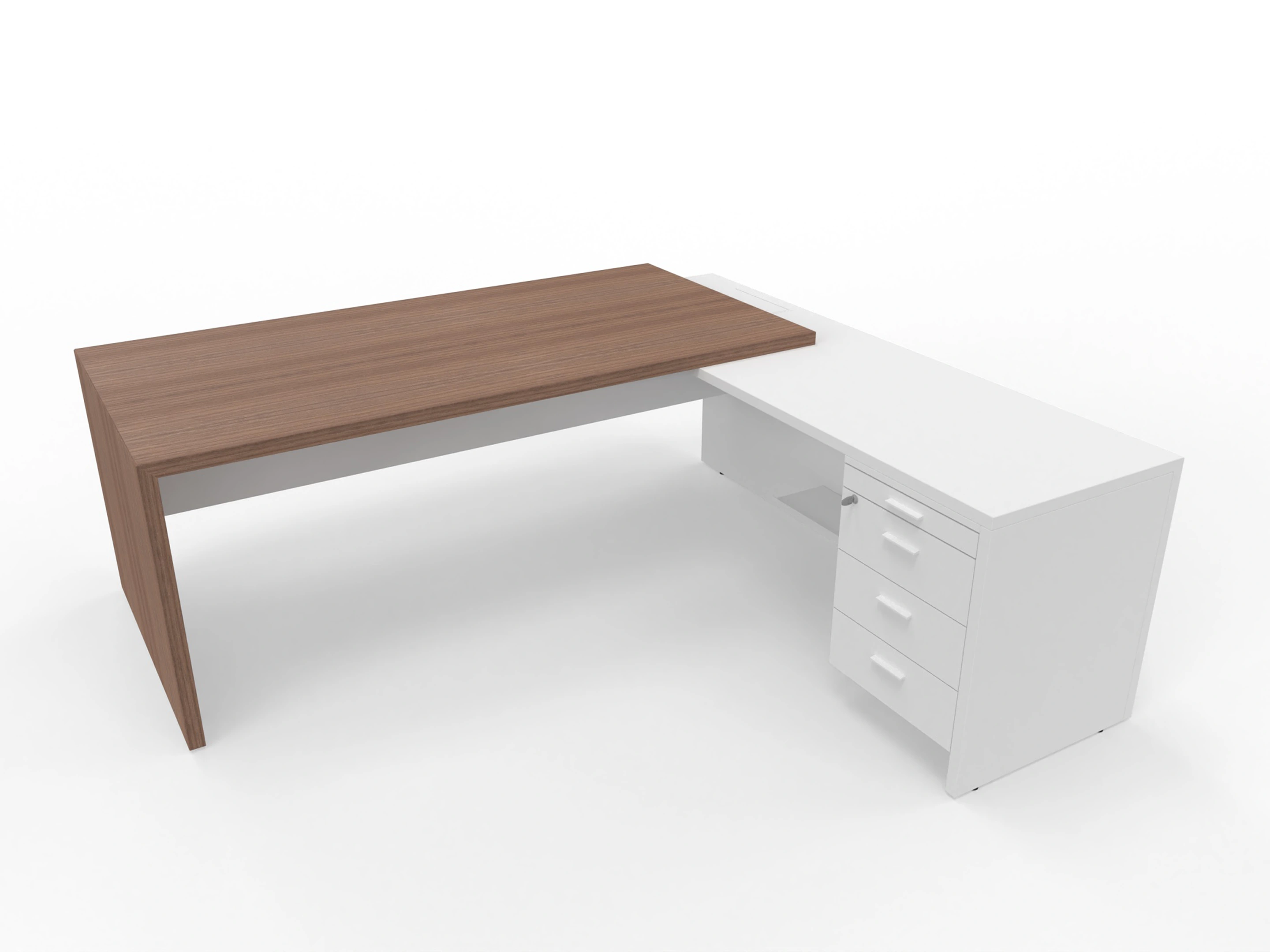 Bureau met linker doorlopende aanbouw en ingebouwd 3+1 ladeblok van 212x190x76,5cm (BxDxH), voorzien van een grote kabelklep en melamine achterwand.