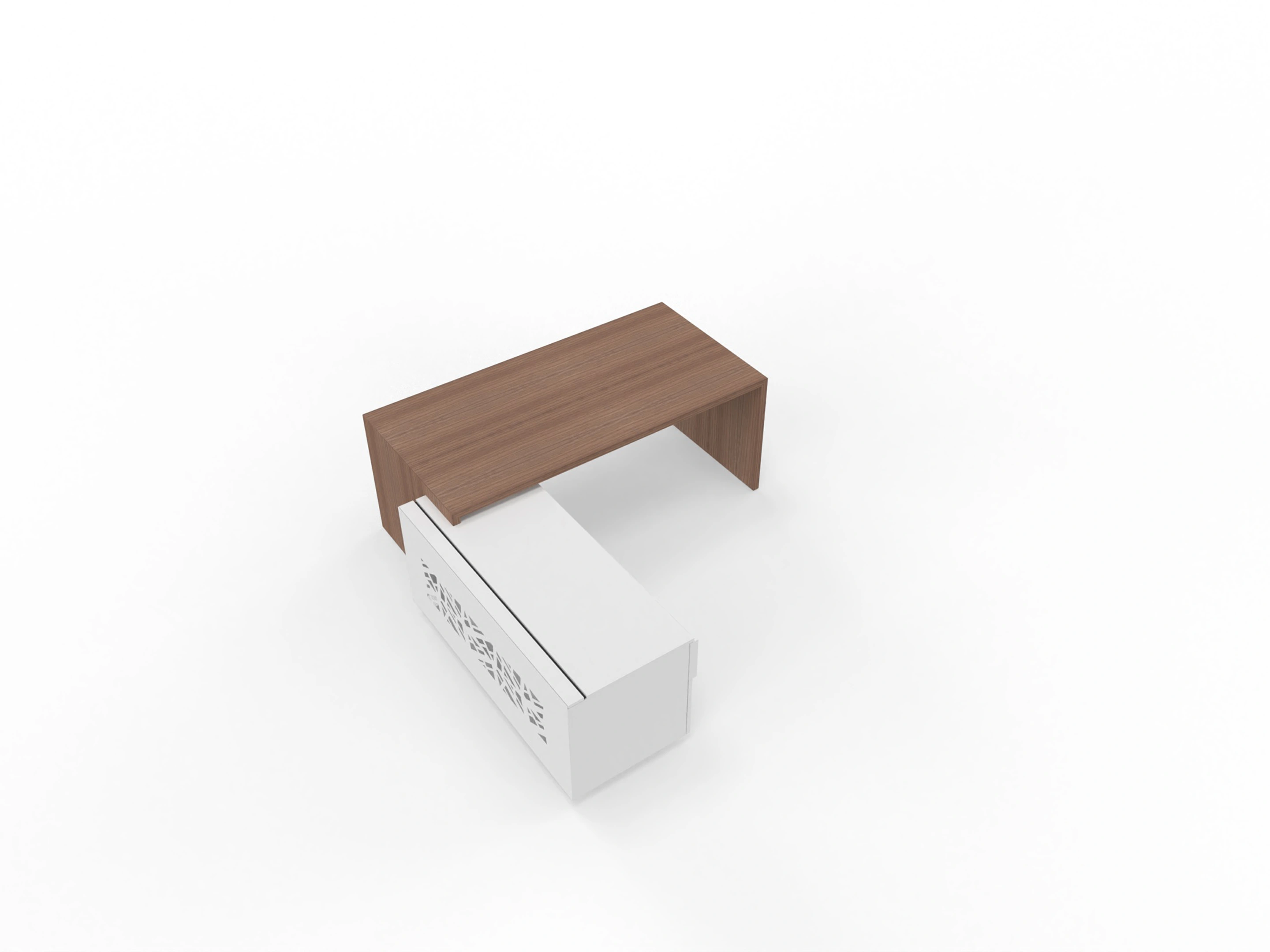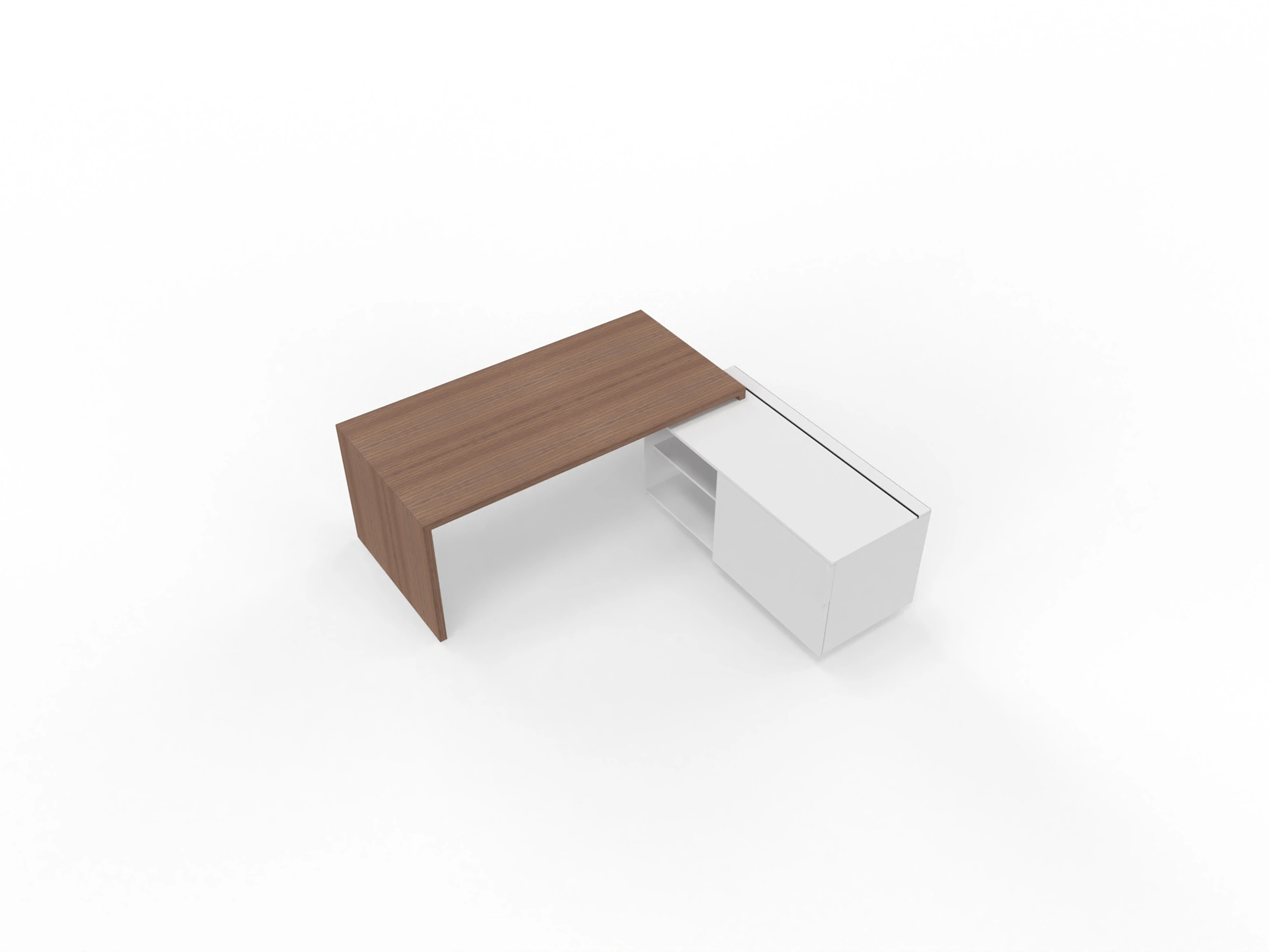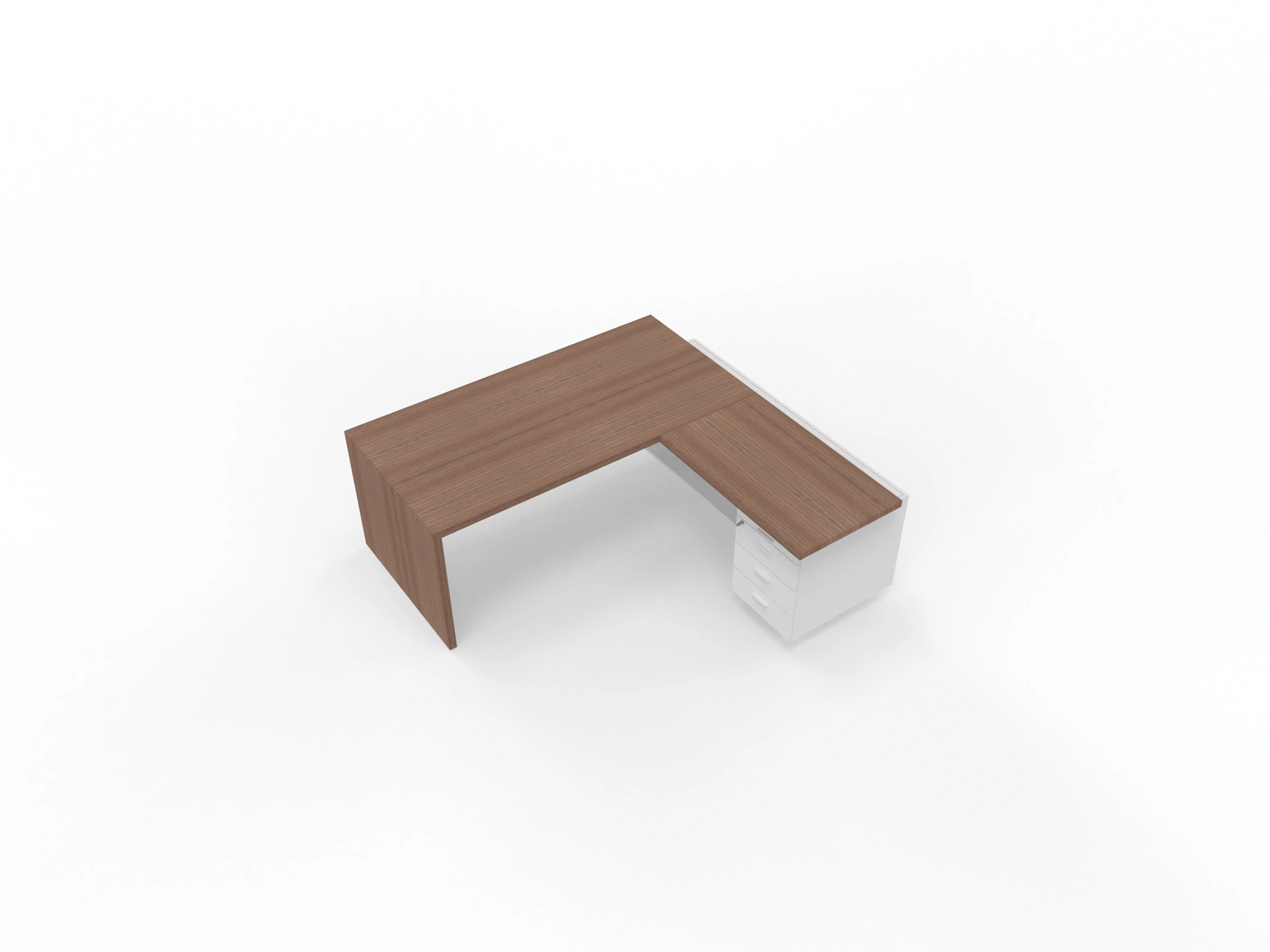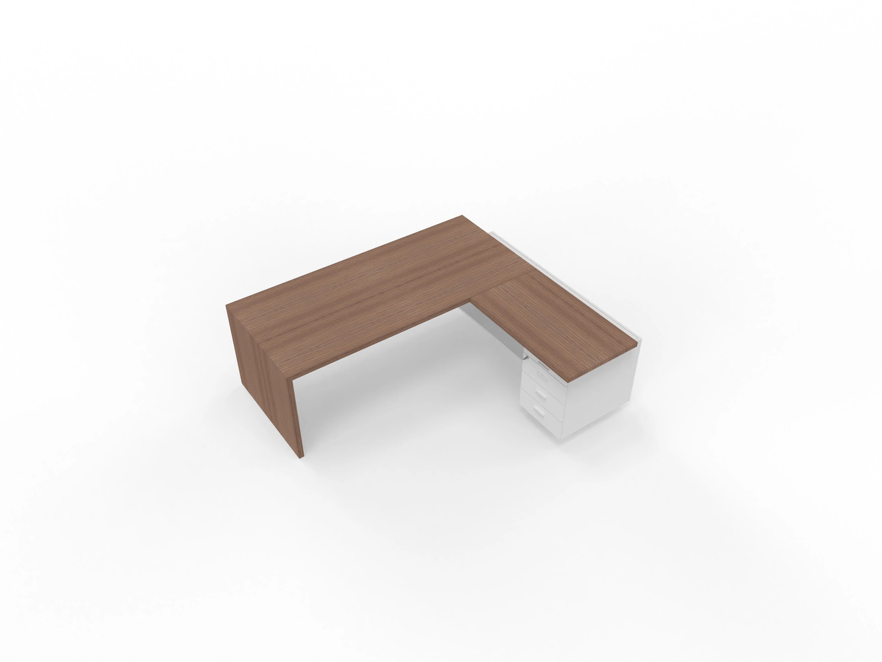 Bureau met linker doorlopende aanbouw en ingebouwd 3+1 ladeblok van 212x190x76,5cm (BxDxH), voorzien van een grote kabelklep en melamine achterwand.