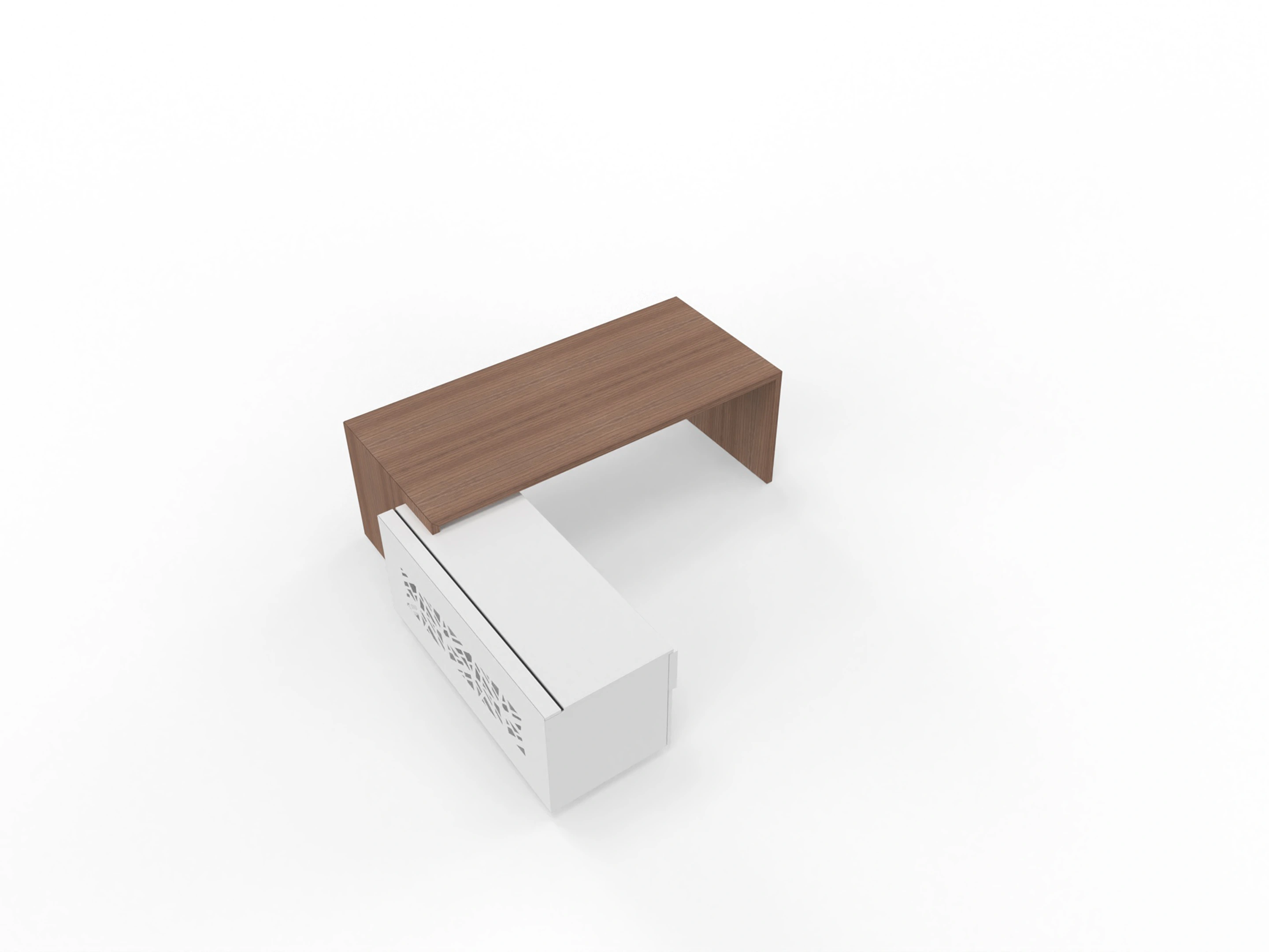 Bureau met linker doorlopende aanbouw en ingebouwd 3+1 ladeblok van 192x190x76,5cm (BxDxH), voorzien van een grote kabelklep en metalen sier achterwand.