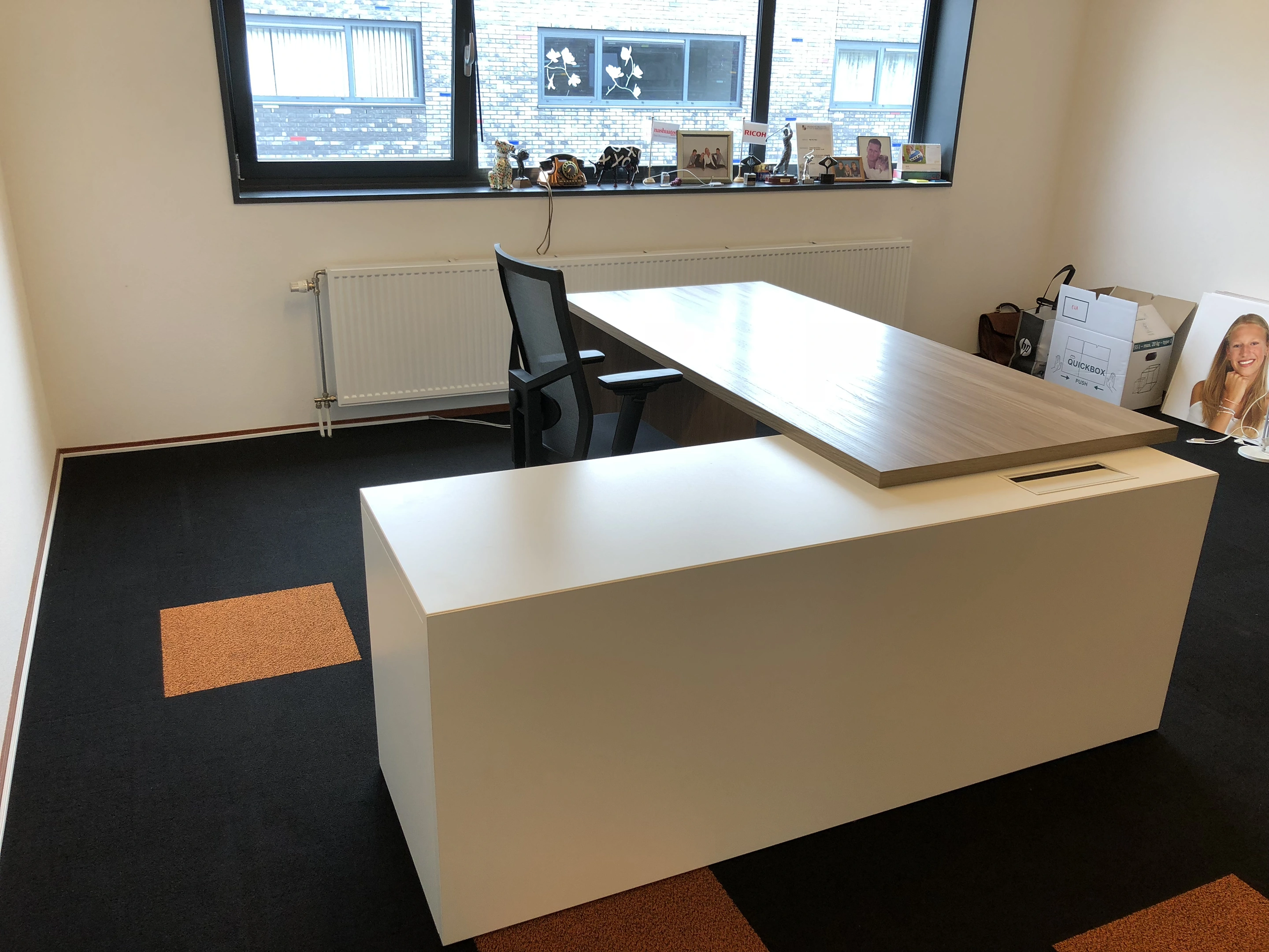 T45 directiebureau - Met hoekladenblok (links), 212cm, sier achterwand
