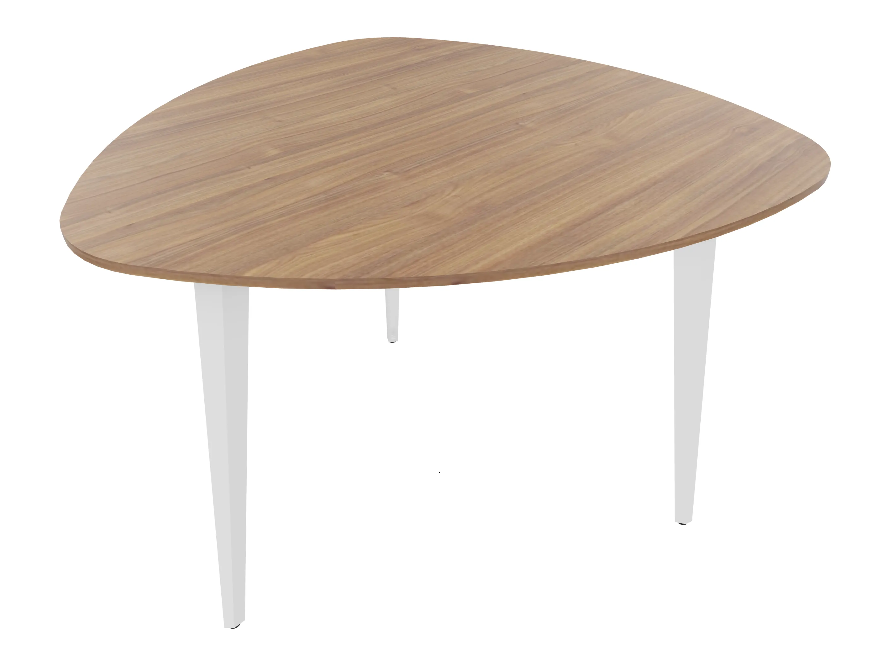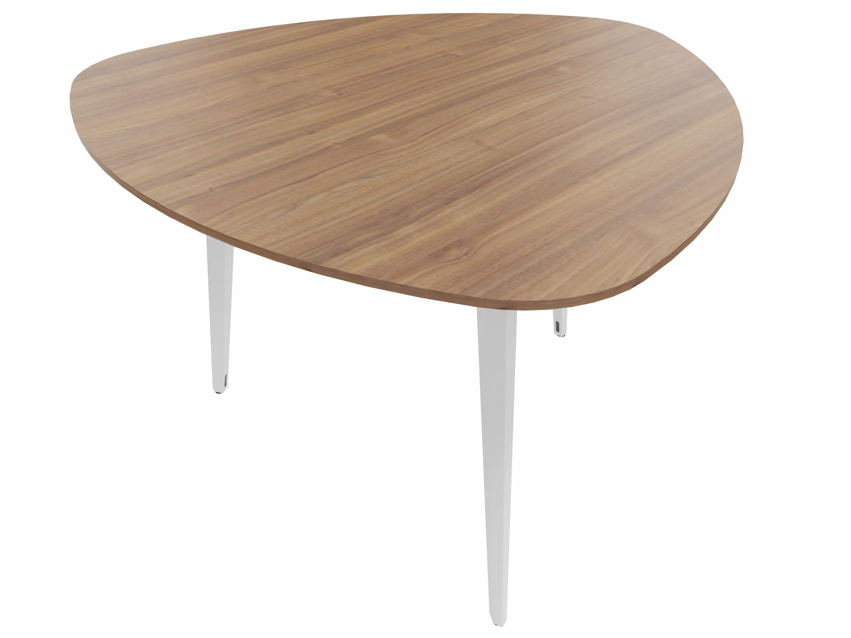 Bartafel met 3 schuine poten met kabelvoorziening en een trigoon blad. Afmeting: 1450 x 1450 x 1100mm (BxHxD)